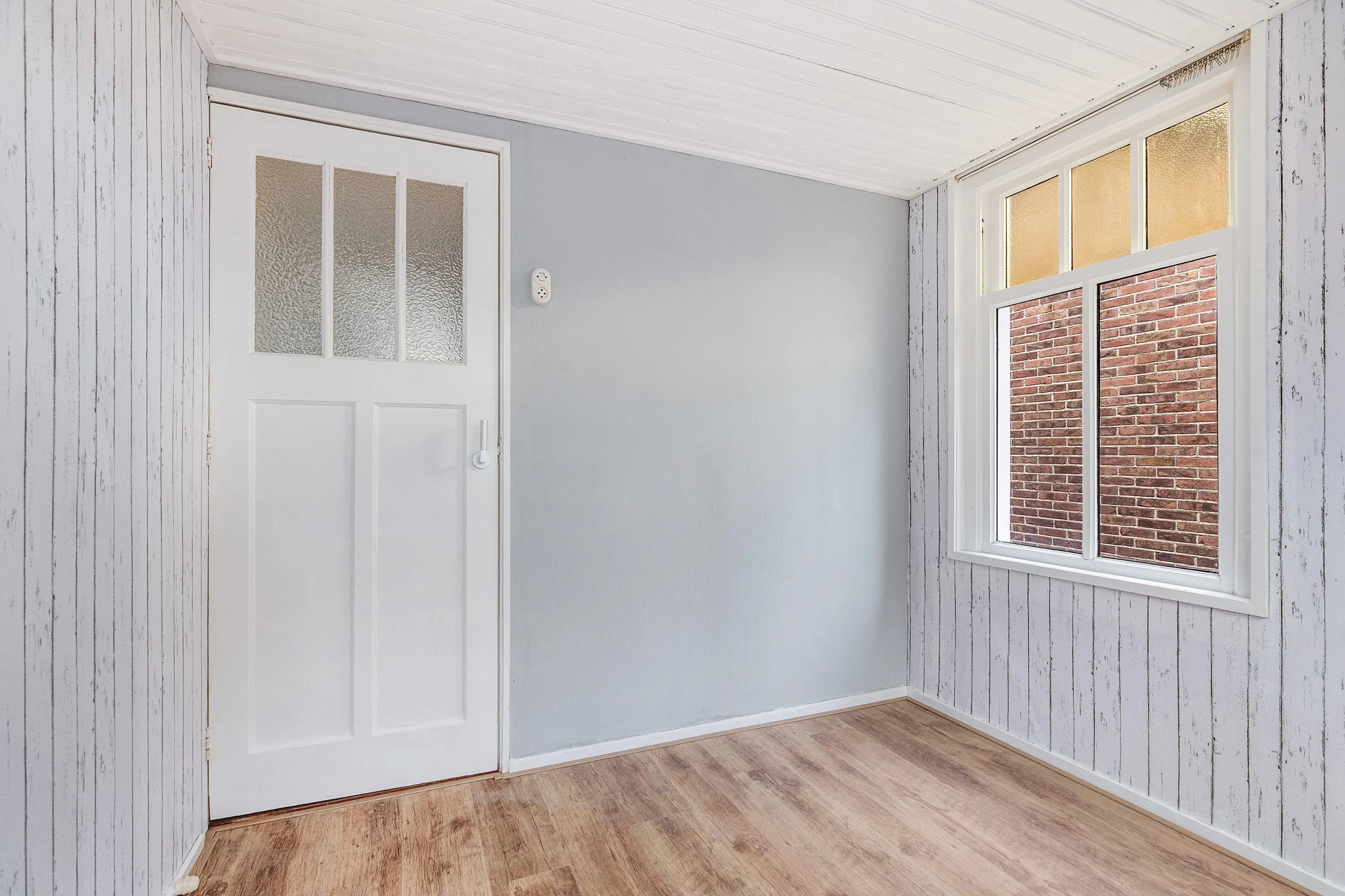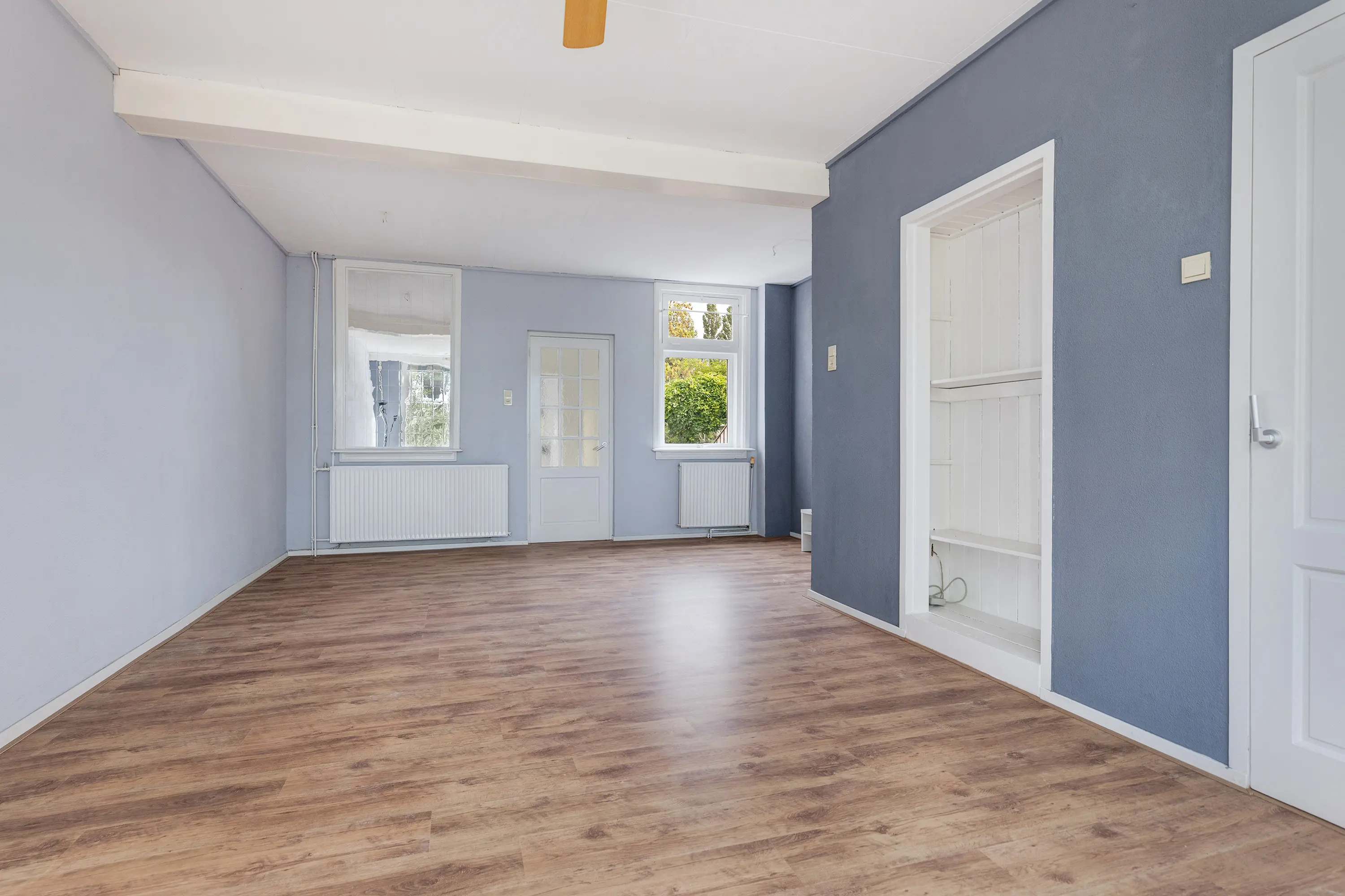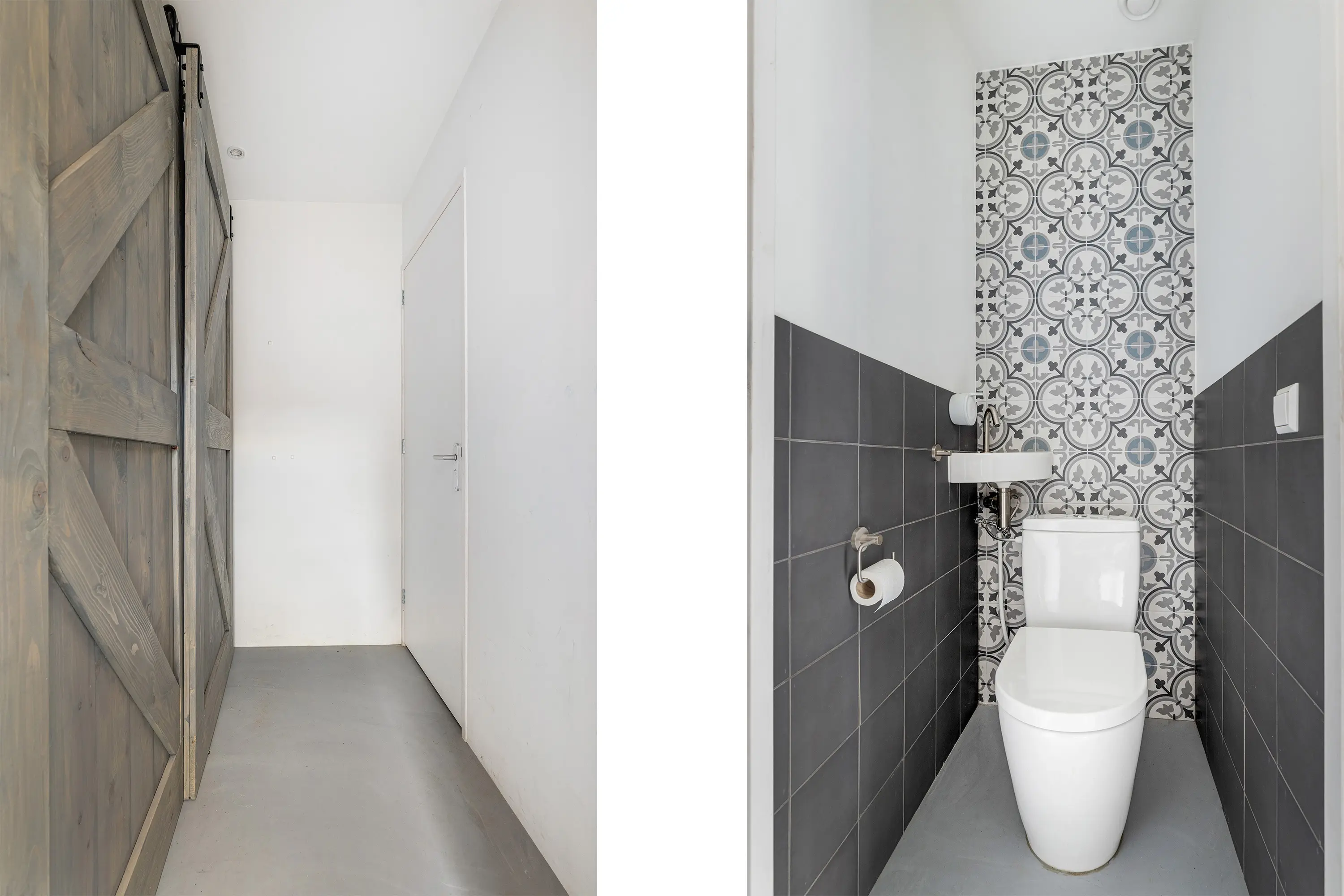 Je betreedt de woning via de hal met trapopgang naar de eerste verdieping. Aan de voorzijde bevindt zich de sfeervolle woonkamer, die toegang biedt tot de provisiekelder. Achterin de woning vind je de uitbouw met een aparte ruimte, waar de CV-ketel en de aansluiting voor wasmachine en droger zijn geplaatst. Hier bevindt zich ook het toilet, uitgevoerd in een neutrale grijs-witte kleurstelling met duoblok en fonteintje.