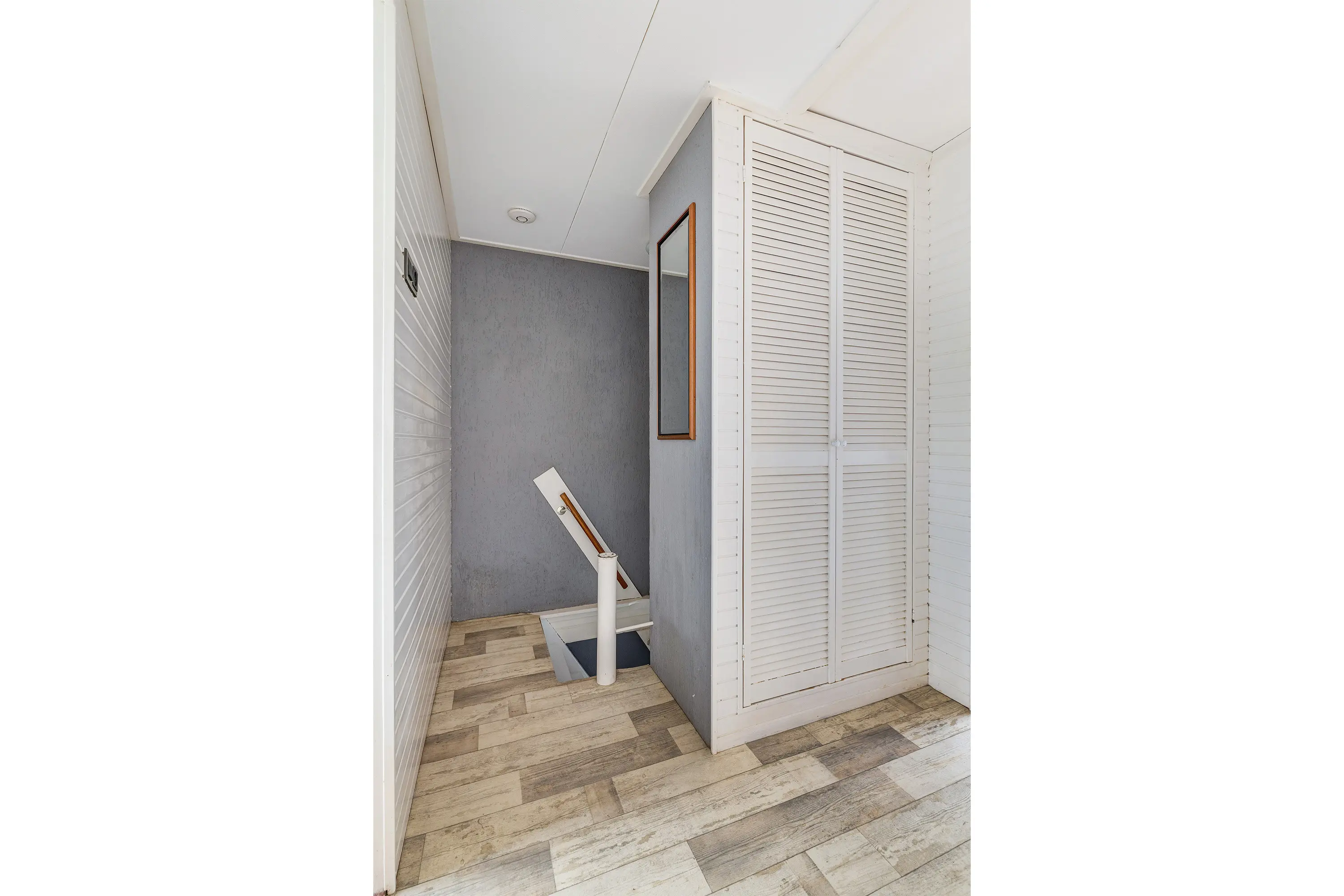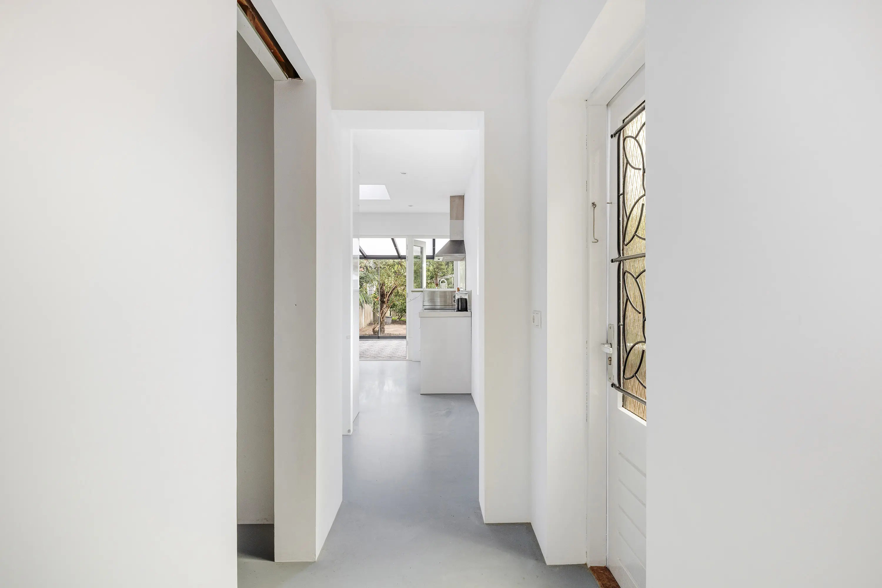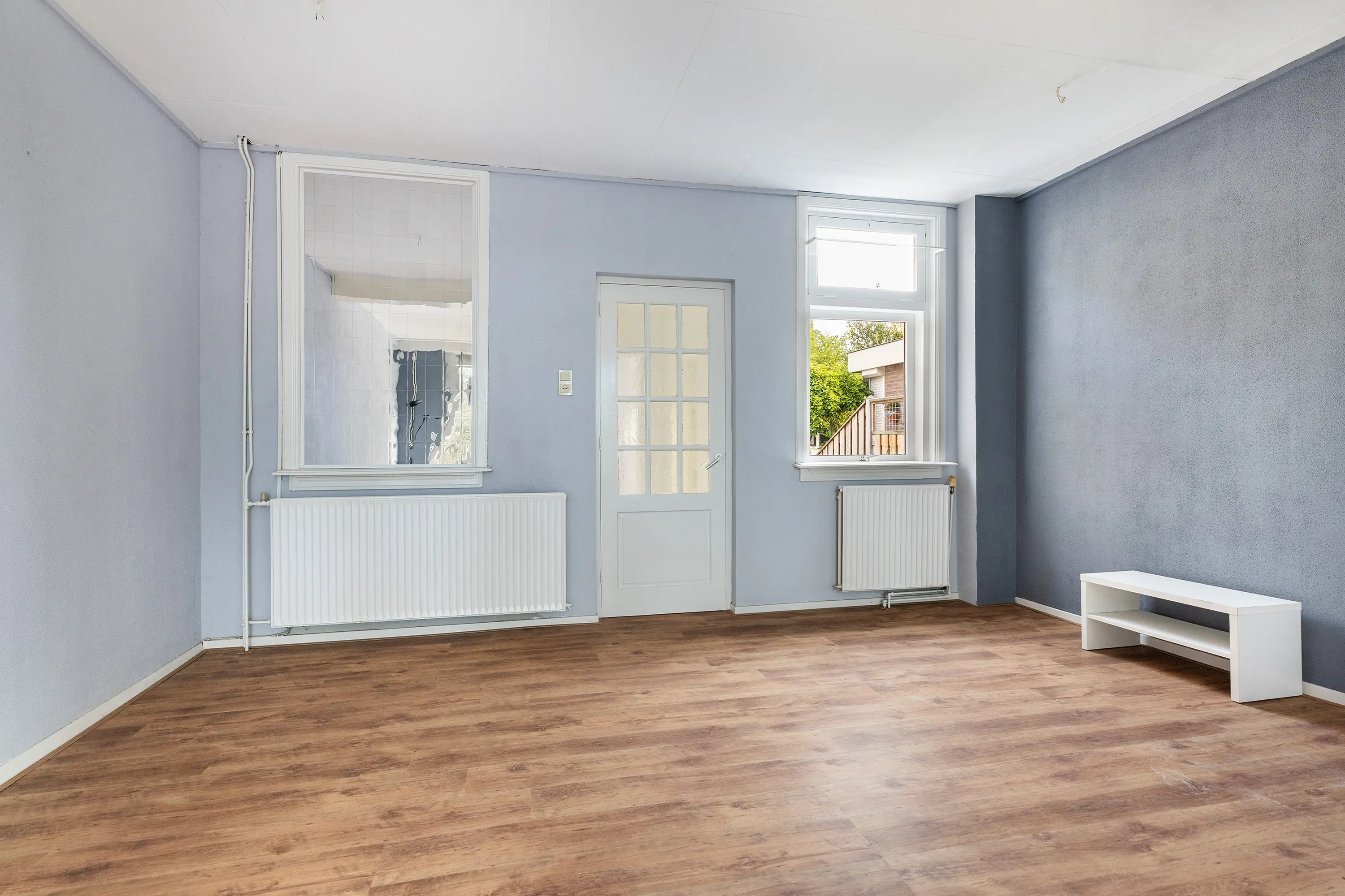 Je betreedt de woning via de hal met trapopgang naar de eerste verdieping. Aan de voorzijde bevindt zich de sfeervolle woonkamer, die toegang biedt tot de provisiekelder. Achterin de woning vind je de uitbouw met een aparte ruimte, waar de CV-ketel en de aansluiting voor wasmachine en droger zijn geplaatst. Hier bevindt zich ook het toilet, uitgevoerd in een neutrale grijs-witte kleurstelling met duoblok en fonteintje.
