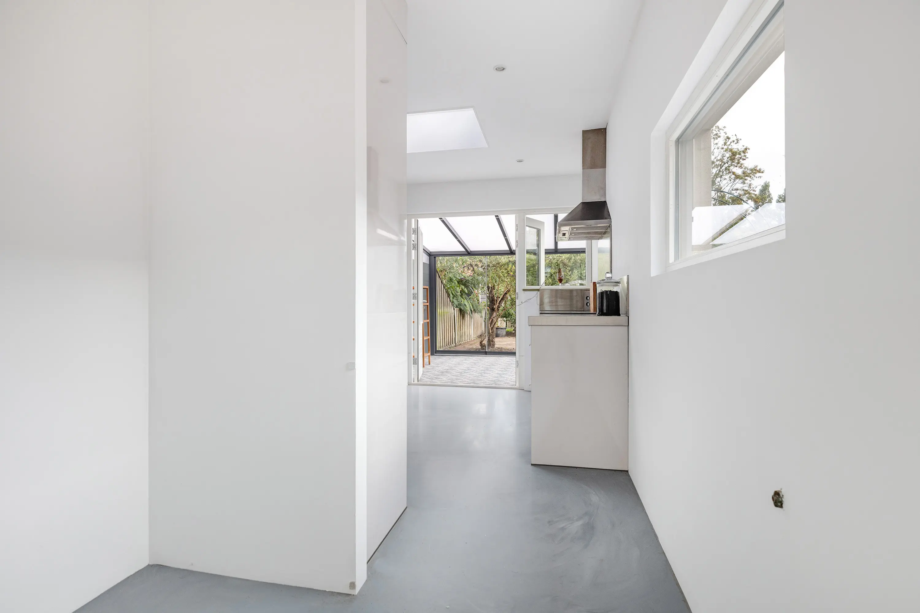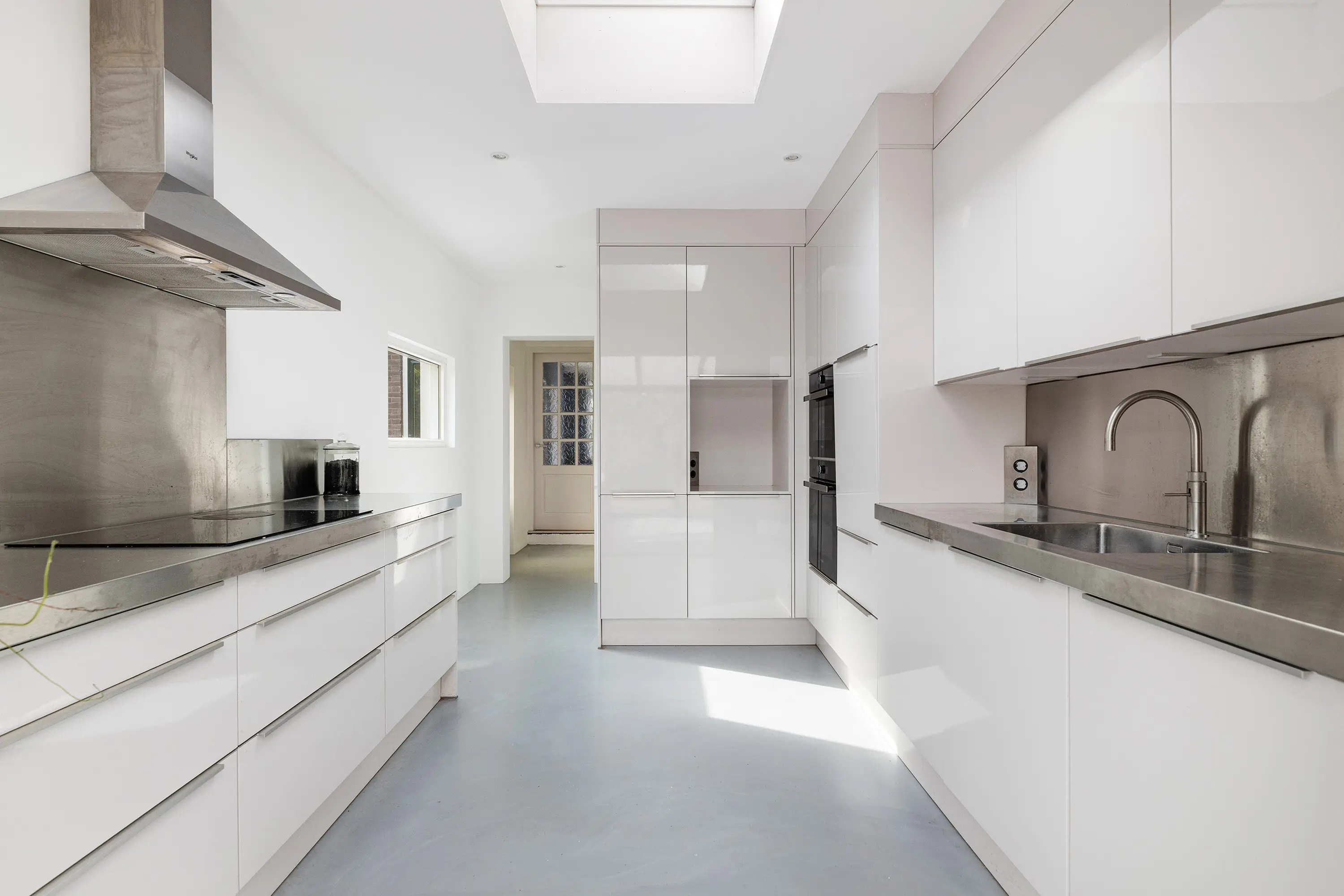 De keuken (2023) is een absolute blikvanger. Met een combinatie van hoek- en rechte opstelling is deze uitgerust met een inductiekookplaat, RVS afzuigkap, spoelbak, vriezer, combi-oven, hetelucht oven met grillfunctie en vaatwasser. Een nis biedt bovendien ruimte voor een gezellige coffeecorner. De gietvloer en strak gestucte wanden en plafonds geven de keuken een moderne en stijlvolle uitstraling.