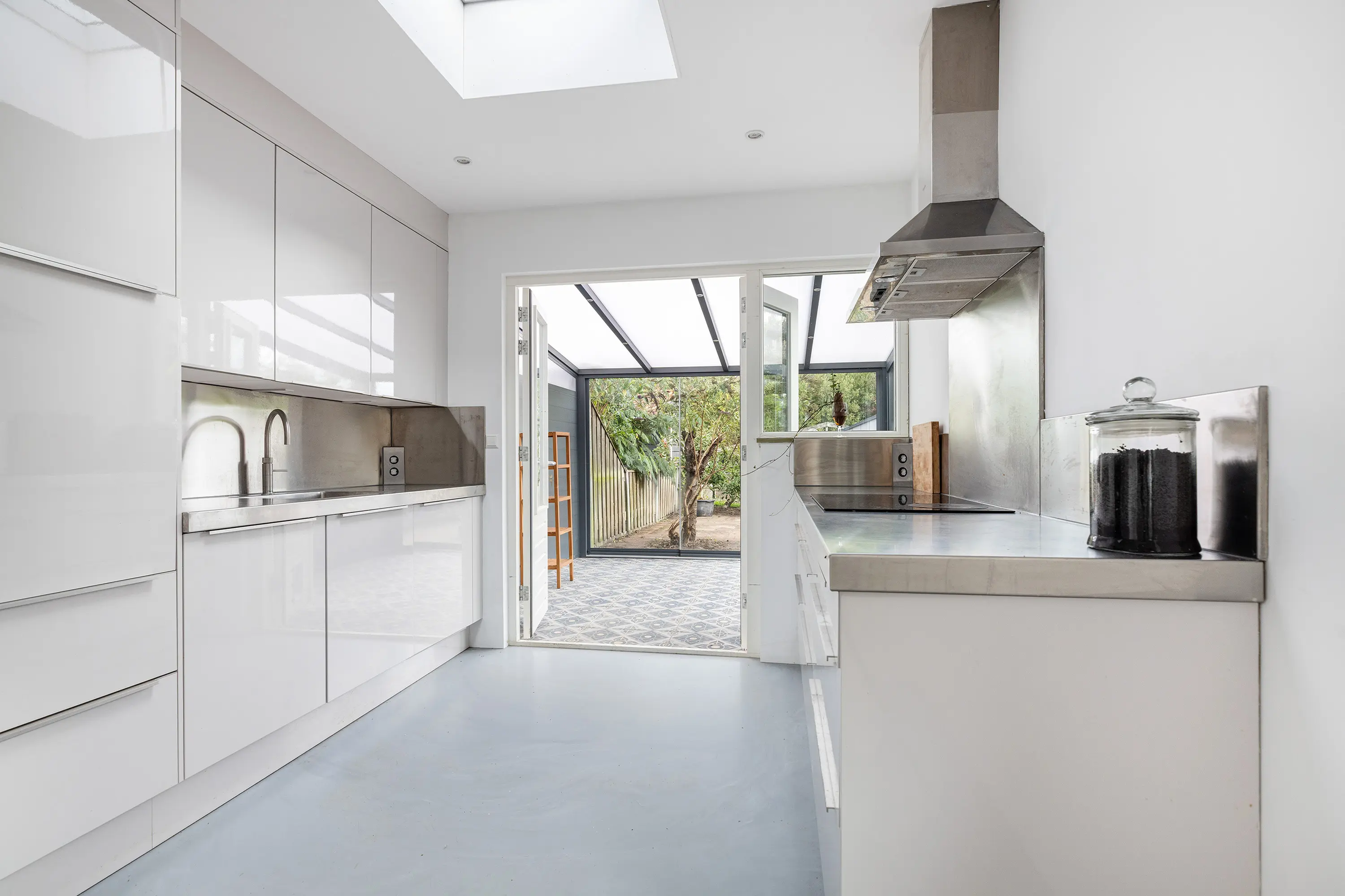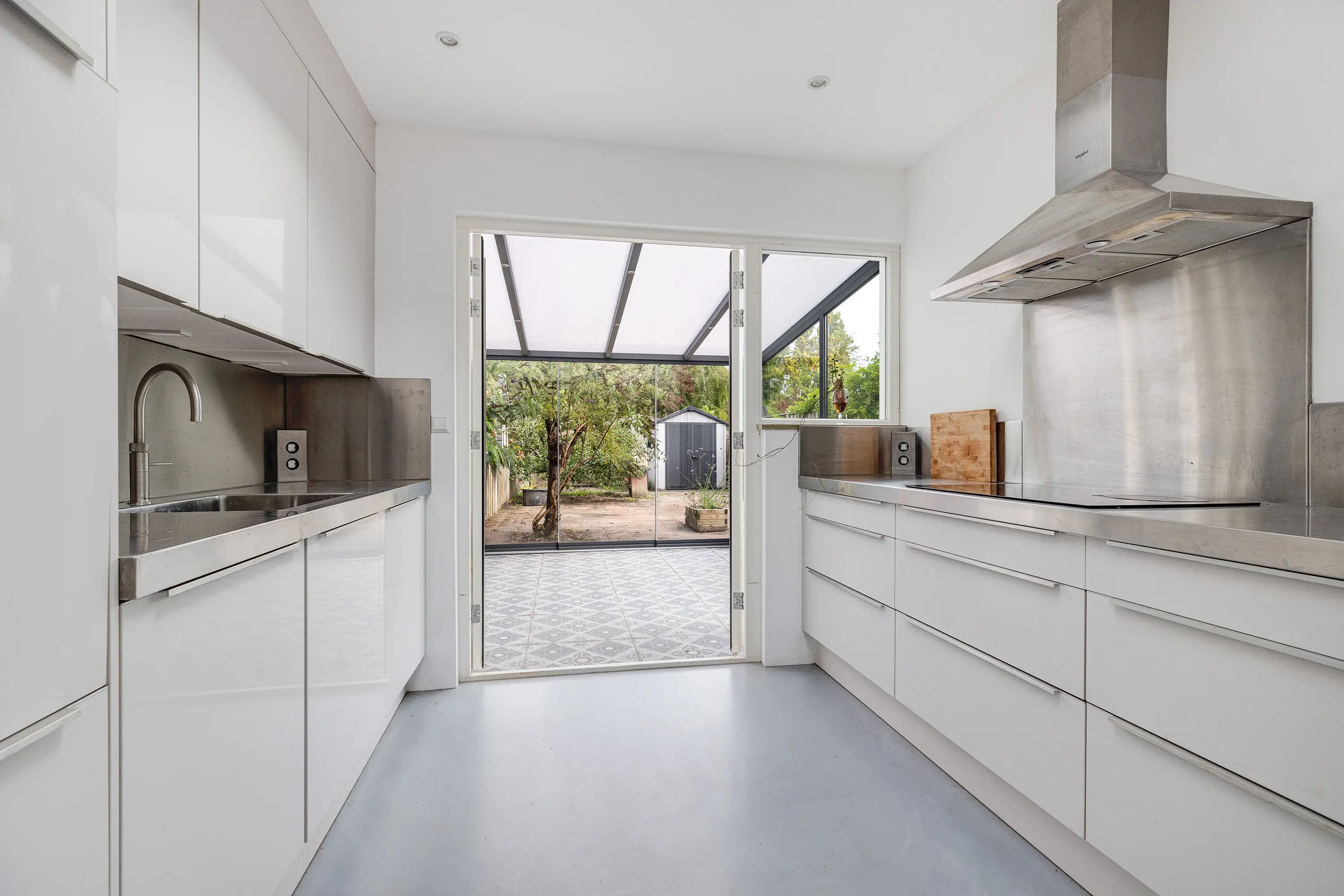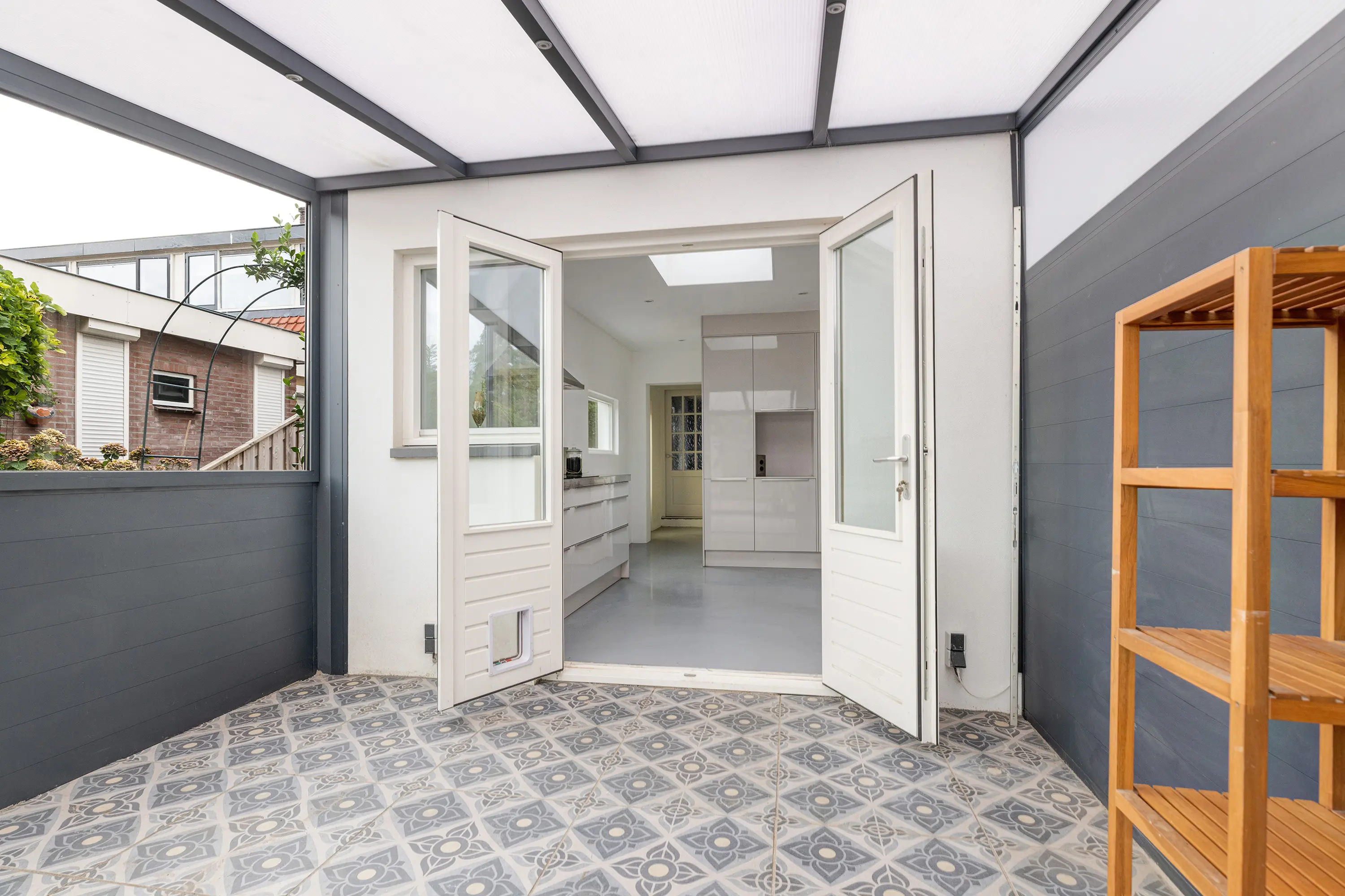 Via openslaande deuren vanuit de keuken bereik je de aluminium serre, voorzien van ingebouwde verlichting, een Portugese tegelvloer en een grote glazen schuifpui naar de tuin, een heerlijke plek om elk seizoen te genieten van licht en uitzicht.