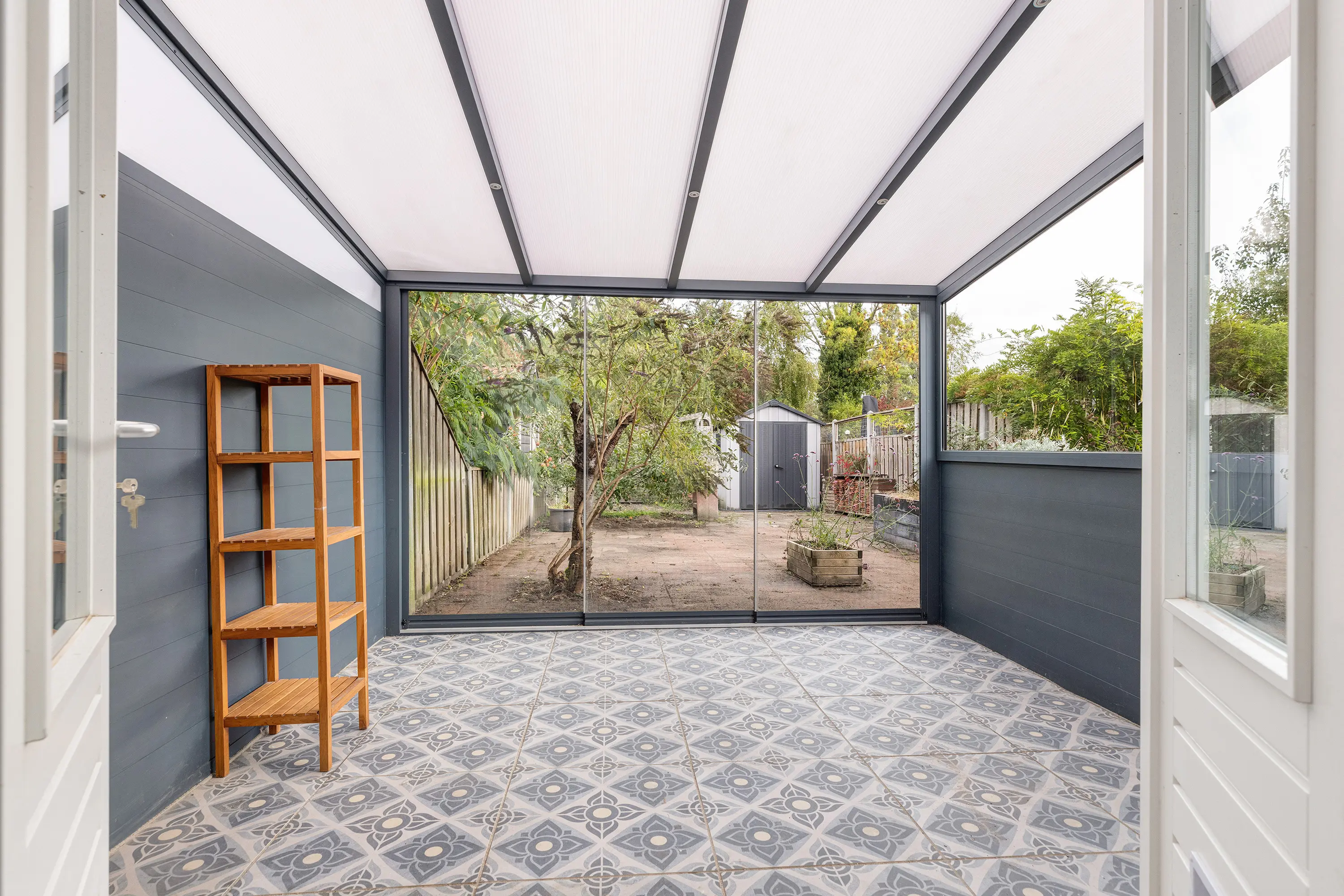- Aluminium serre met Portugese tegelvloer en schuifpui naar de tuin