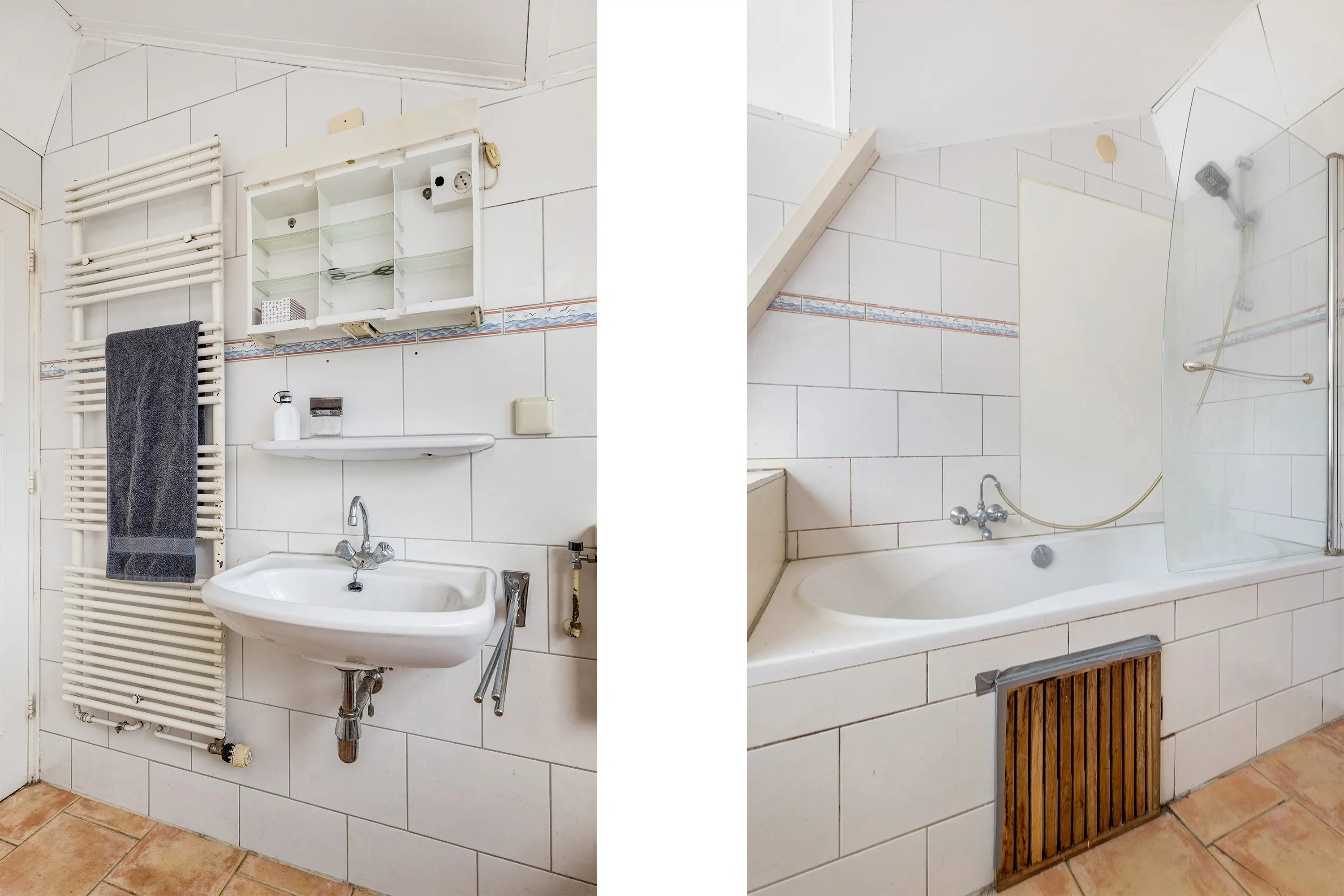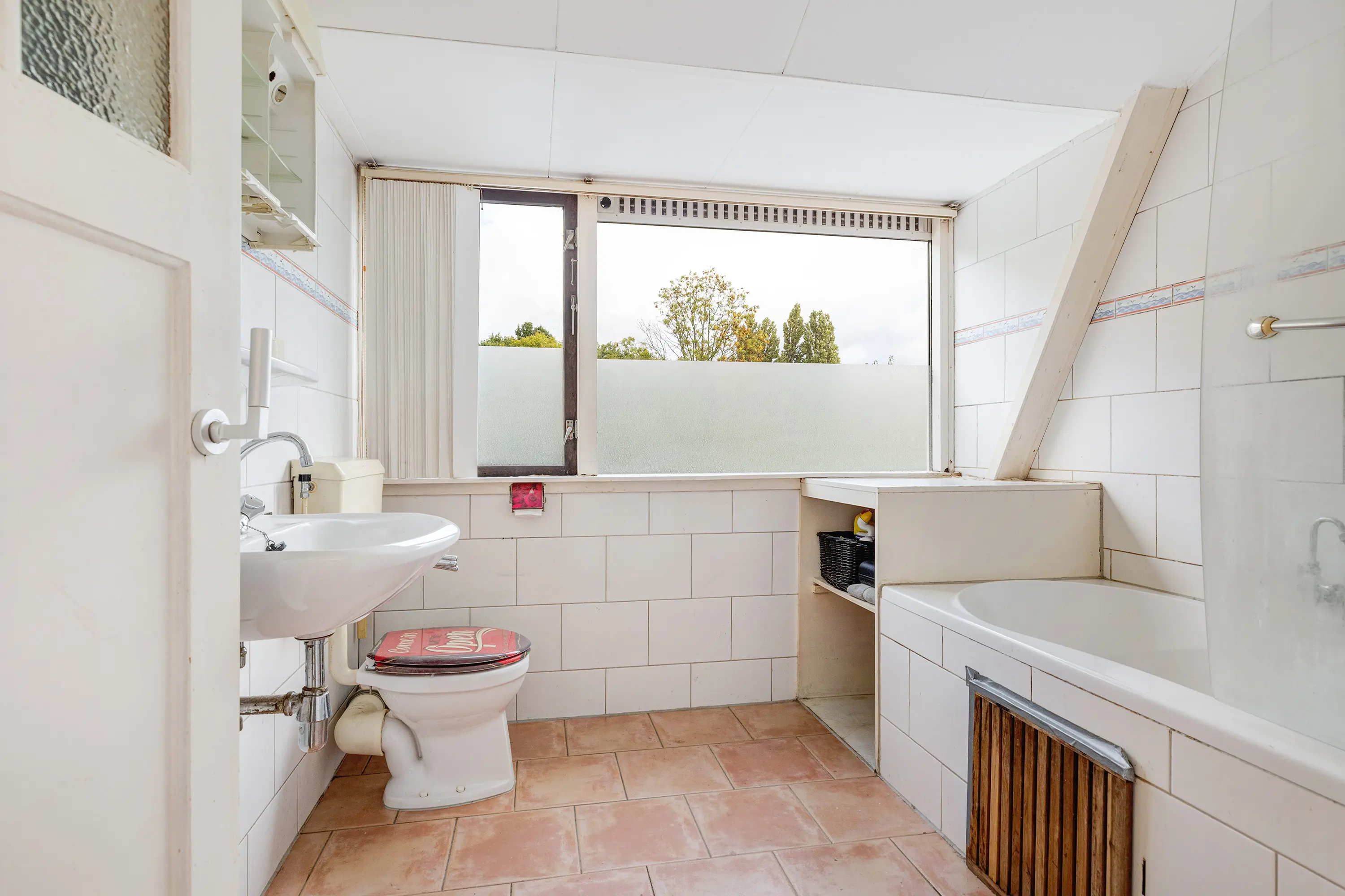 De badkamer (ca. 6 m²) is volledig betegeld in een lichte kleur en voorzien van een ligbad, vaste wastafel en een tweede toilet.