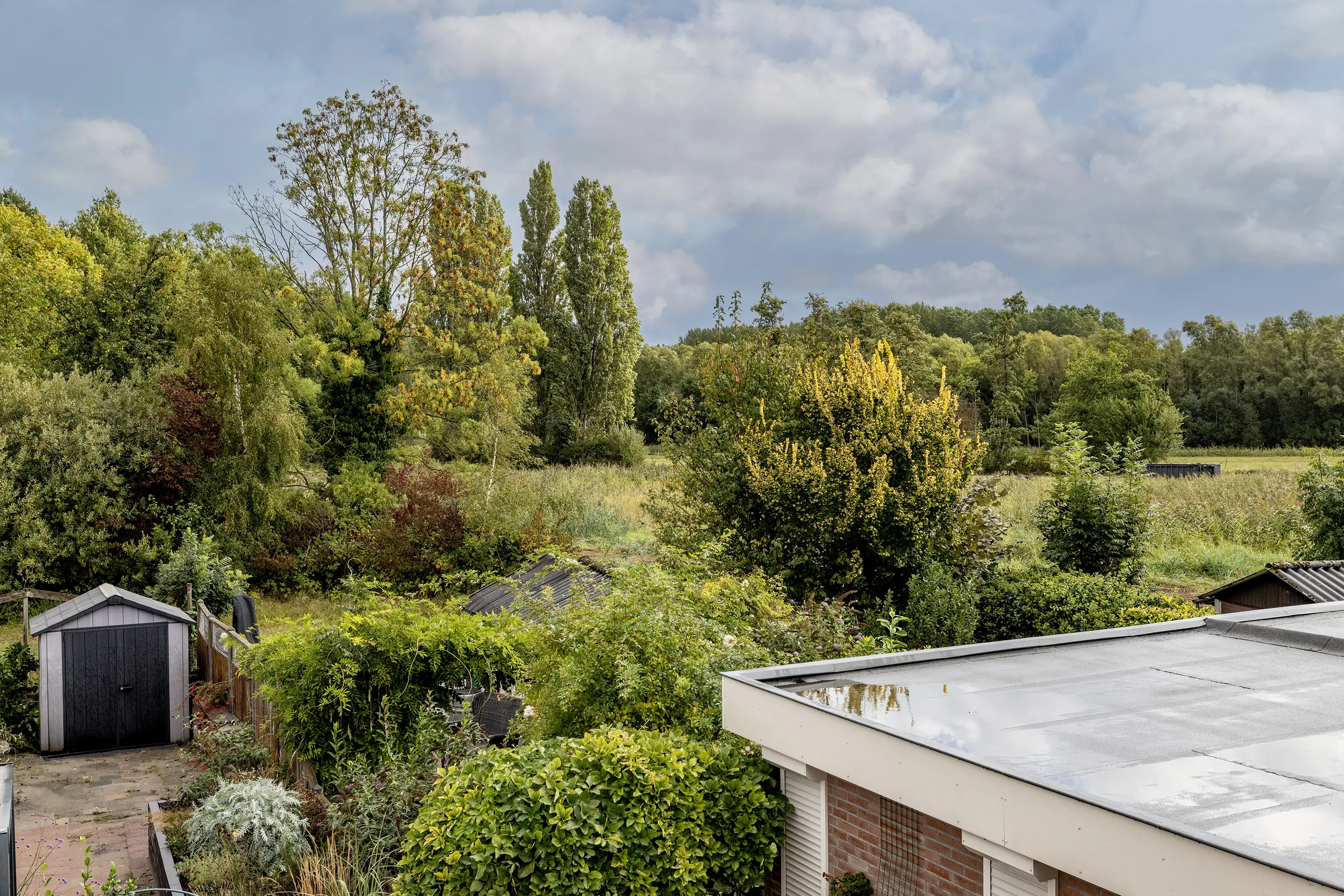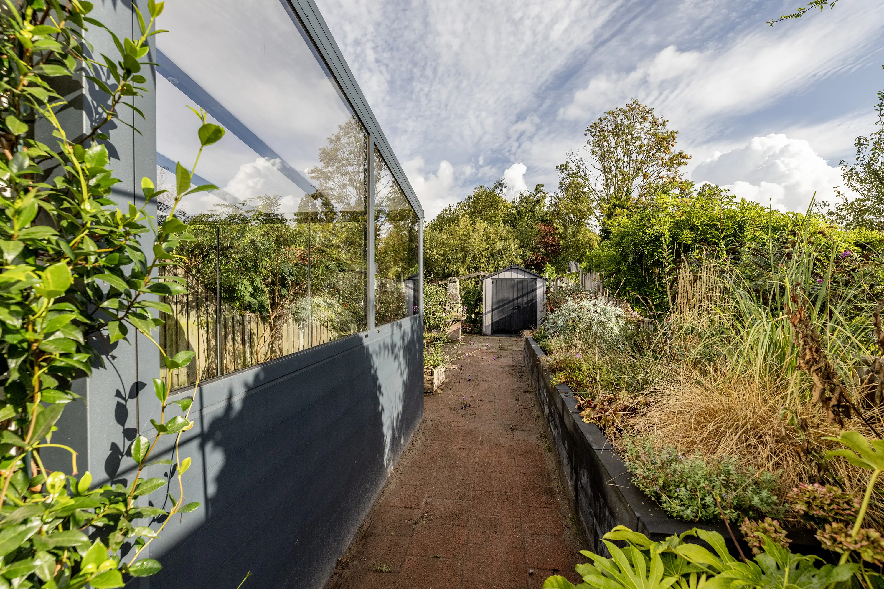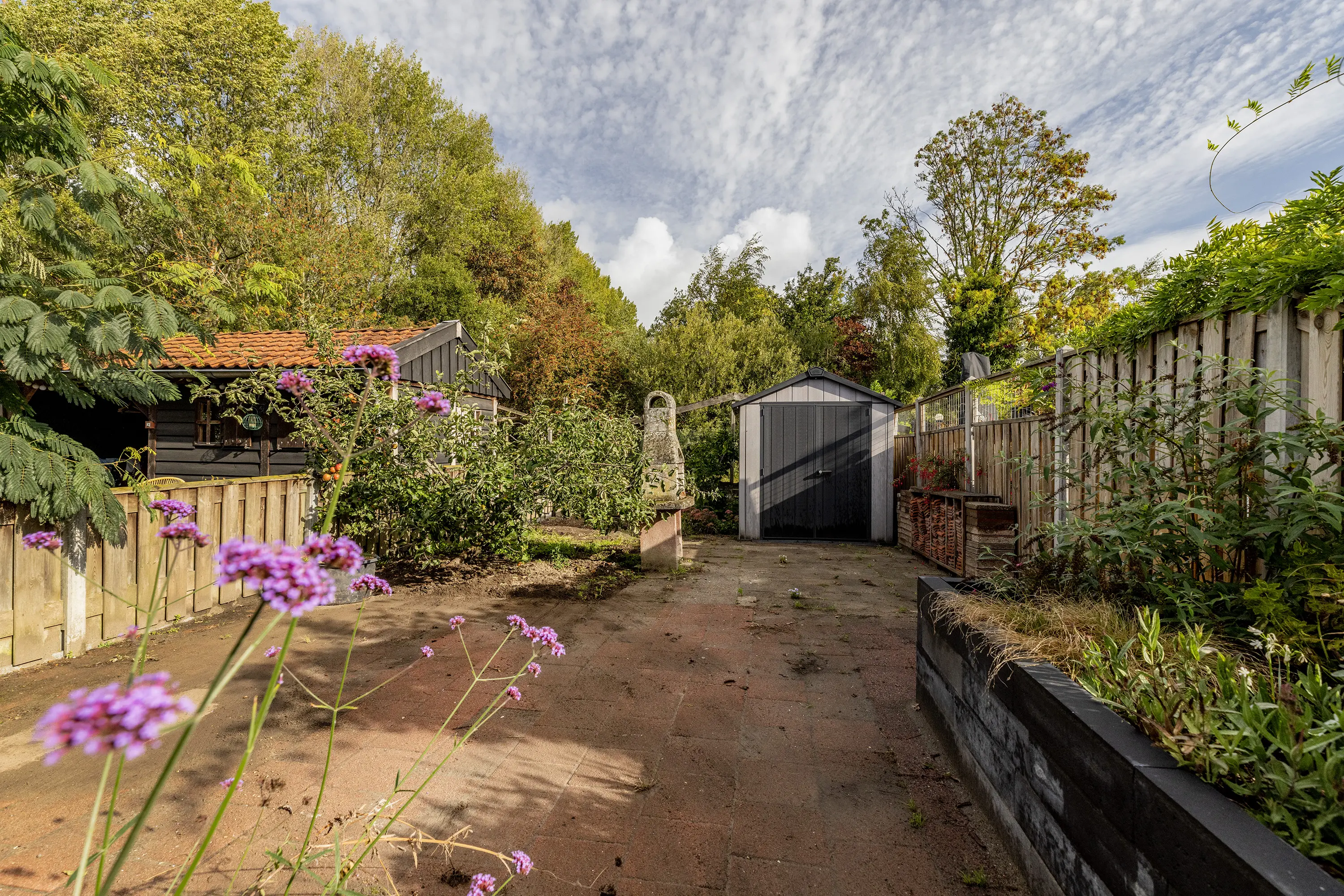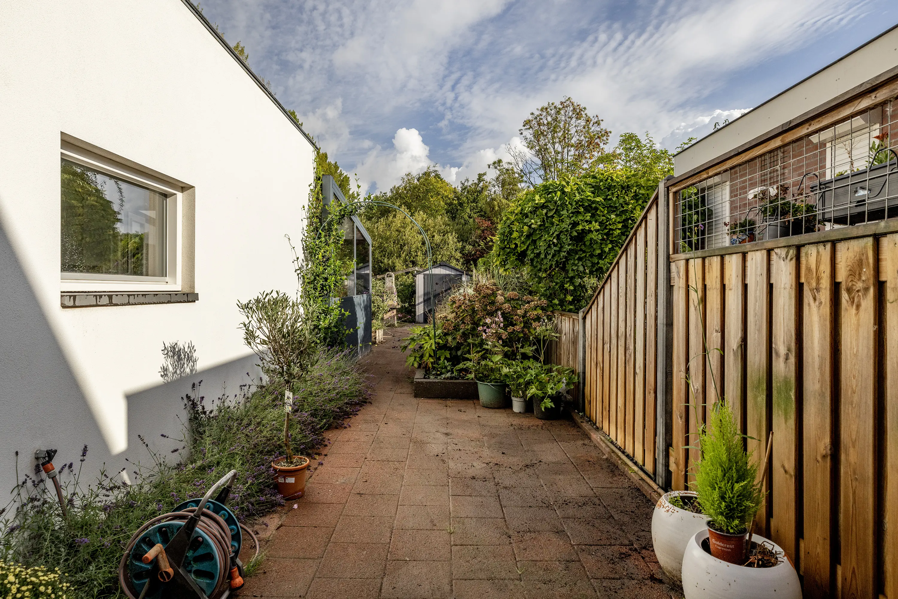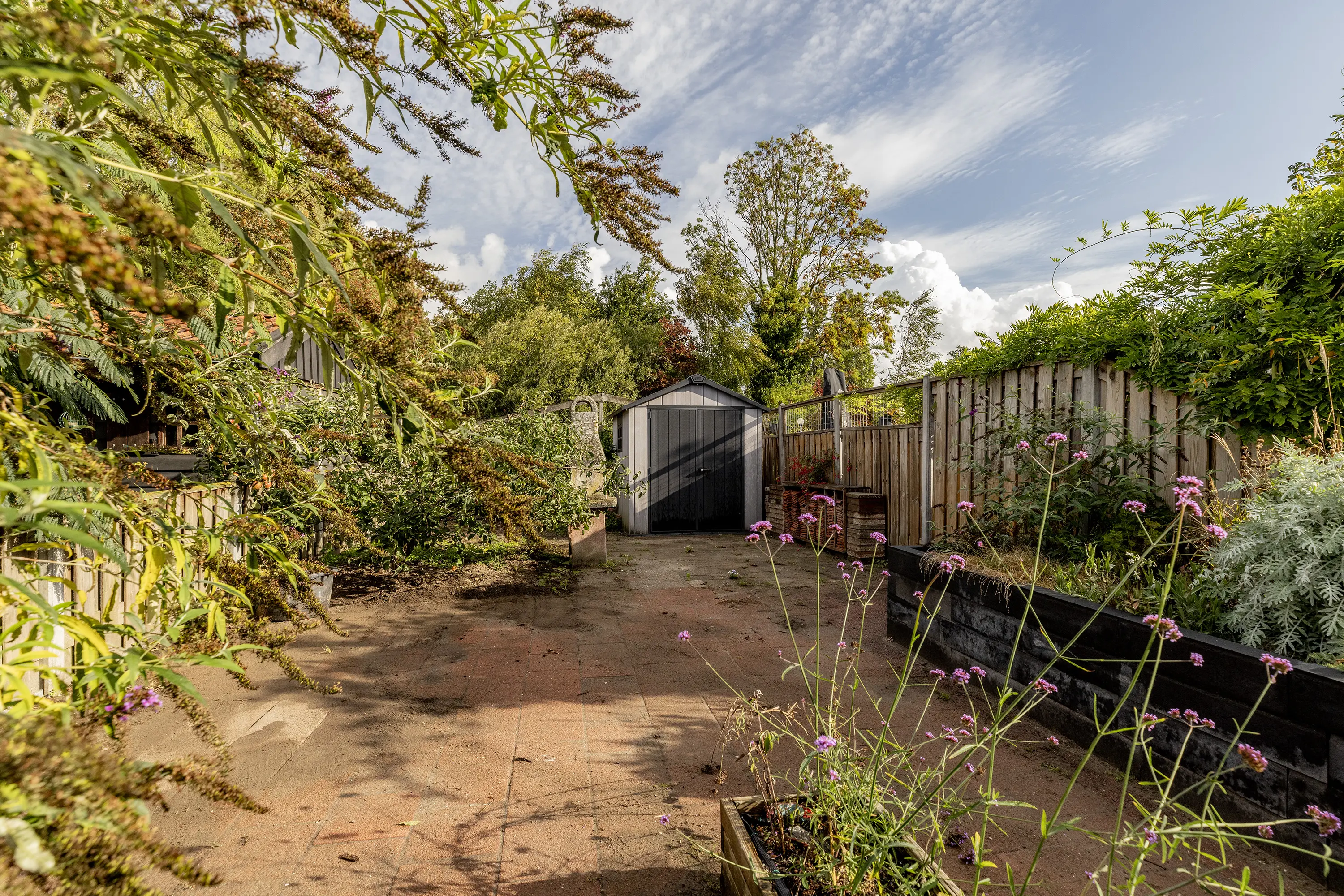 De tuin is royaal en biedt volop privacy. Met sierbestrating, groene beplanting en een vrijstaande berging heb je hier een fijne buitenruimte. De tuin is tevens bereikbaar via de zijkant van de woning. Achter de tuin ligt het uitgestrekte Valckesteynse Bos, een uitzicht en omgeving die je elke dag een vakantiegevoel geven.