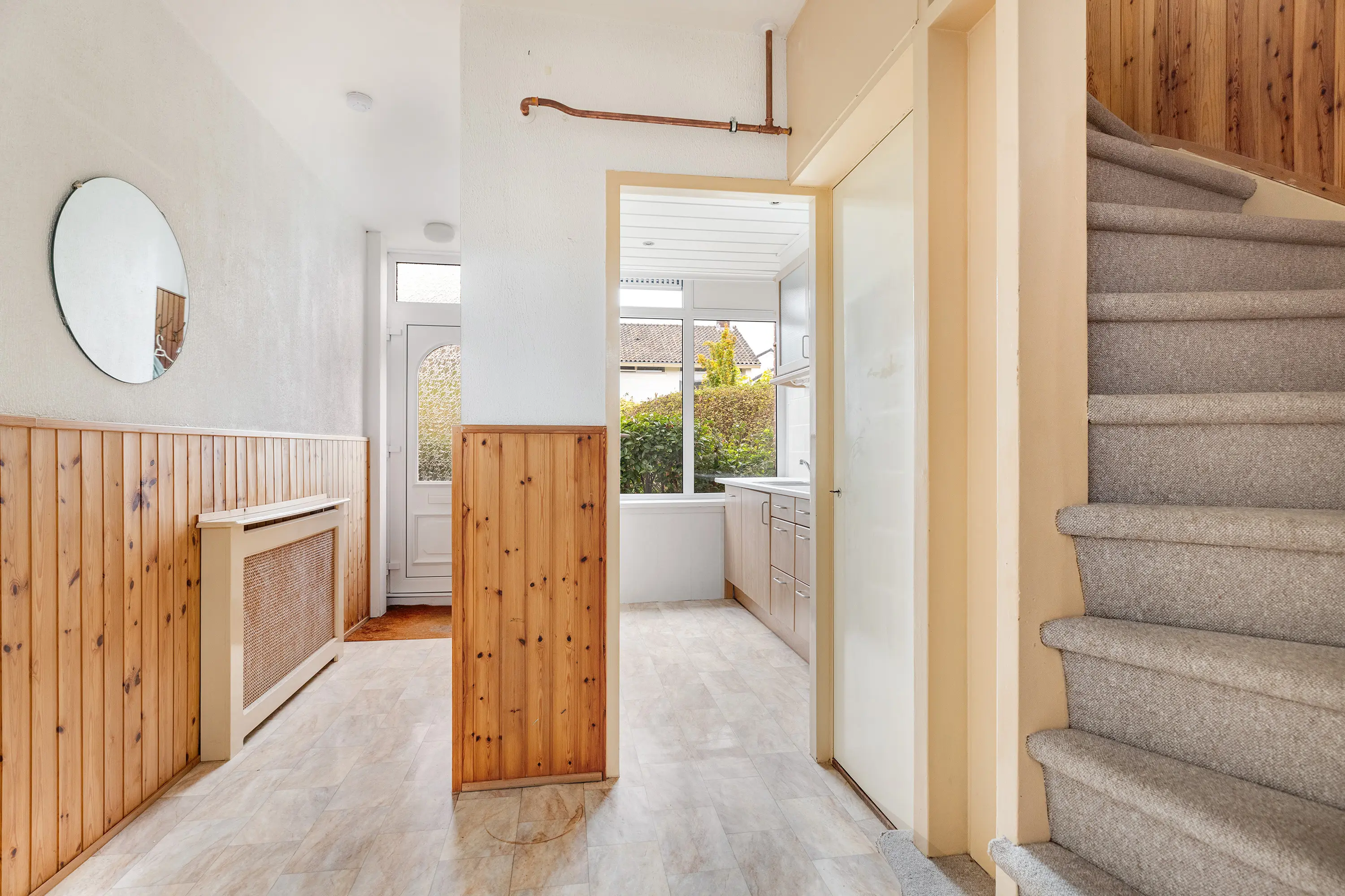 Via de vaste trap bereikt u de tweede verdieping met overloop, CV-opstelling en bergruimte achter de knieschotten.
