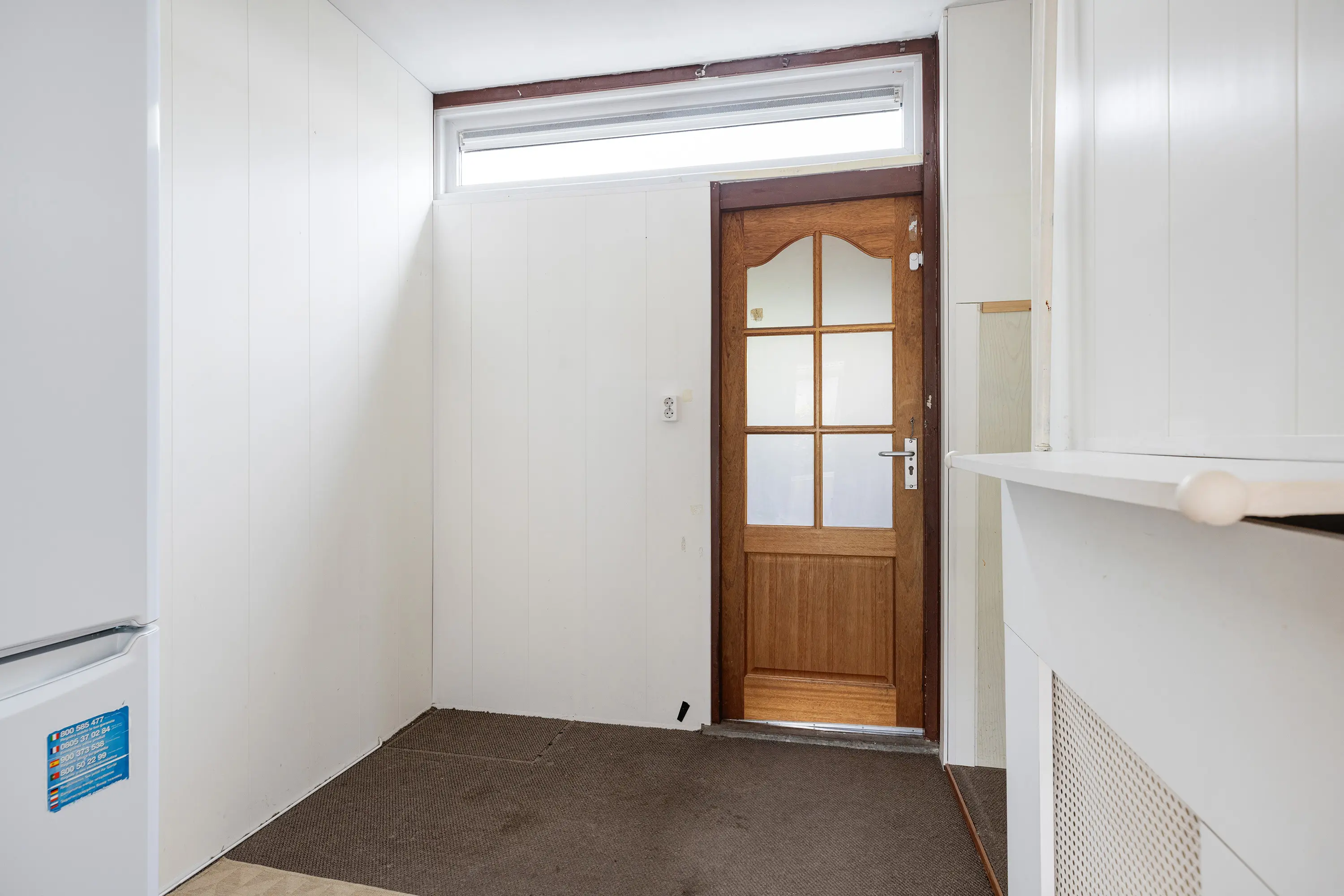 U betreedt de woning via de entreehal, waar zich de meterkast, trapkast, lichte toiletruimte met hangend toilet en de trap naar de eerste verdieping bevinden. Vanuit de hal heeft u toegang tot de woonkamer, keuken en bijkeuken.