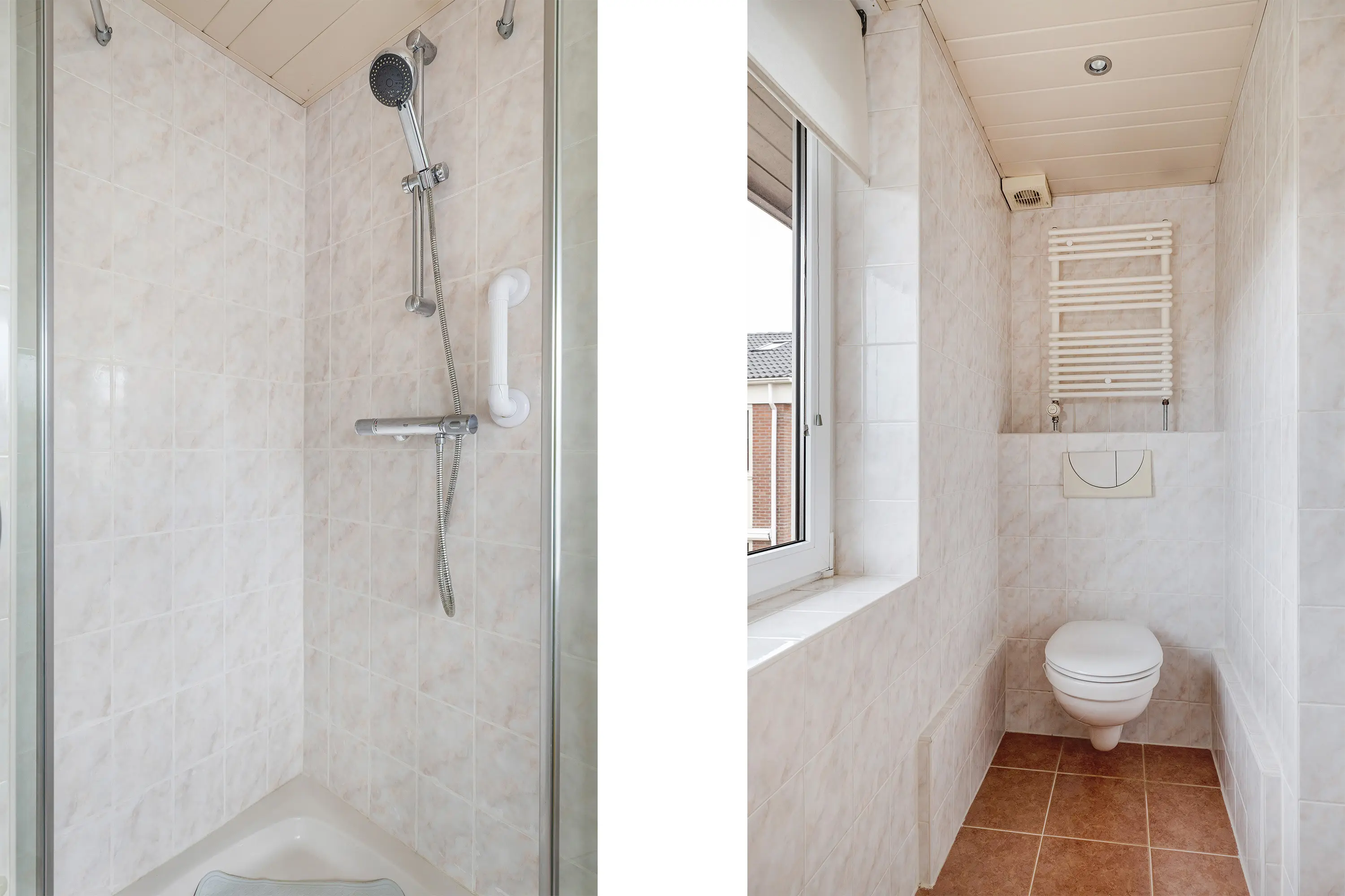 De badkamer is licht en netjes, voorzien van een douchecabine, wastafelmeubel met spiegel en opbergruimte, en een tweede hangend toilet. Dankzij het grote raam is er volop daglicht en natuurlijke ventilatie.