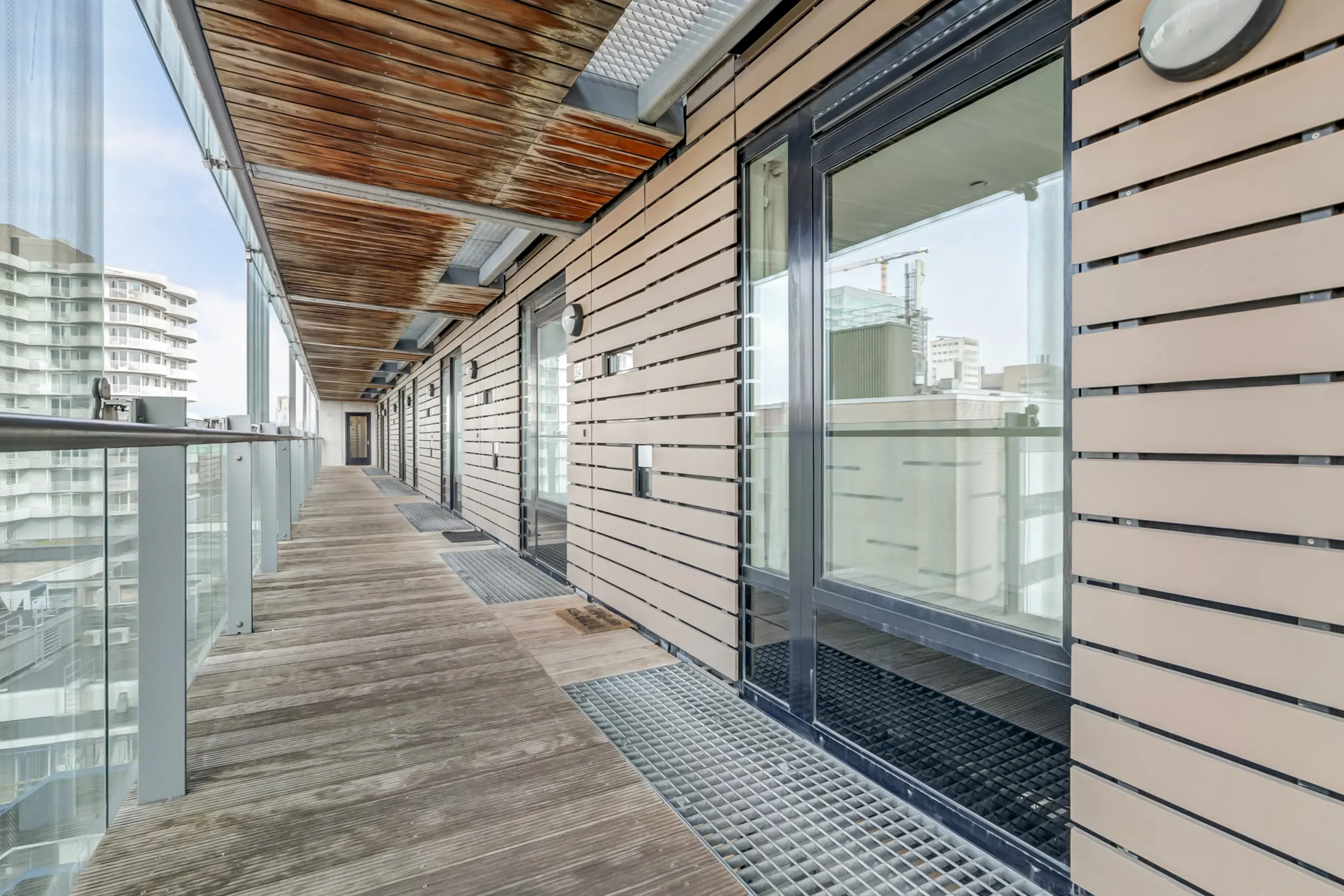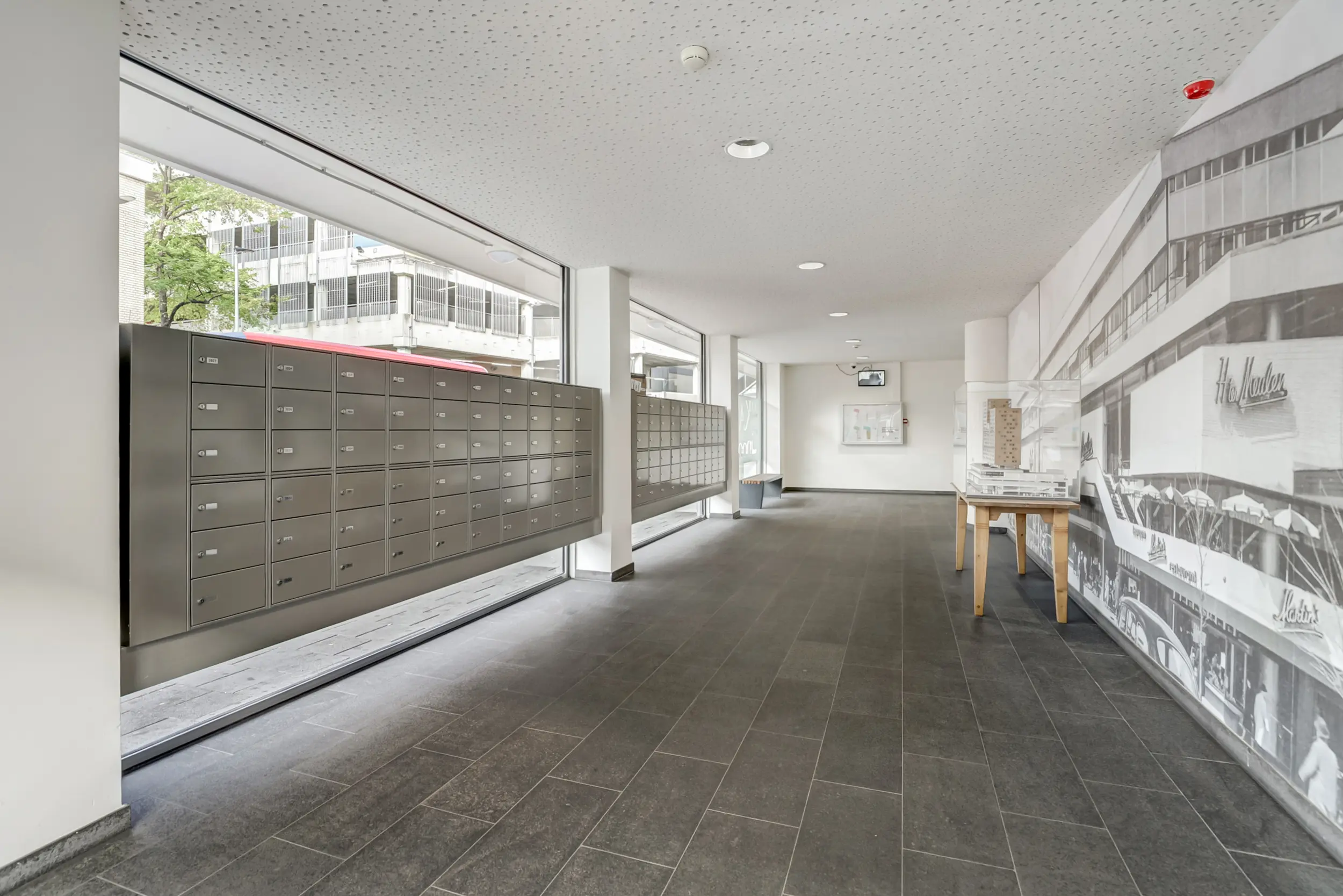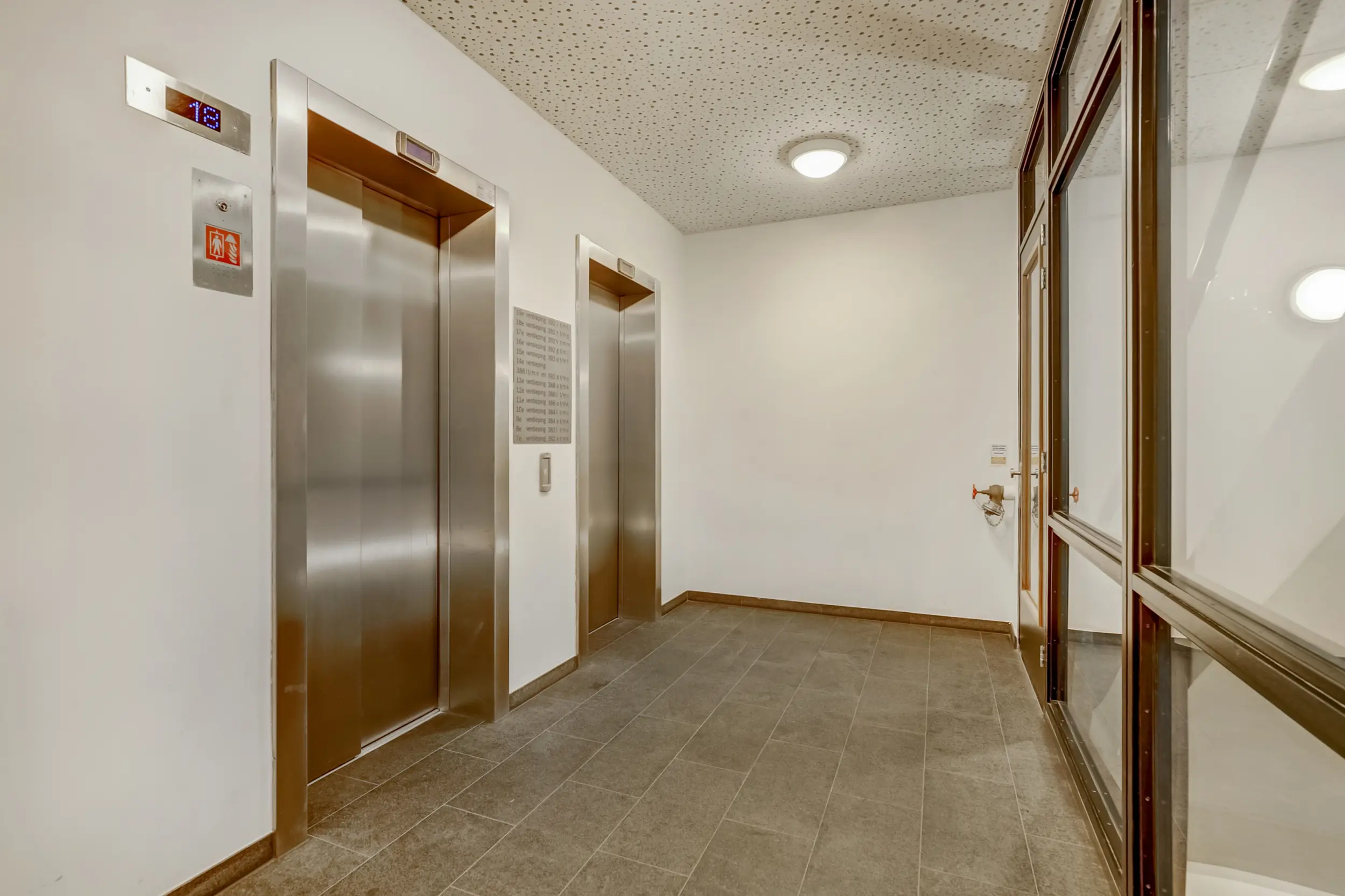 Op de begane grond stap je de ruime entree binnen, waar zich de brievenbussen bevinden en de liftinstallatie. We stappen de lift in naar de 9e etage, waar we via de bijzonder brede en open galerij naar de voordeur van het appartement lopen.