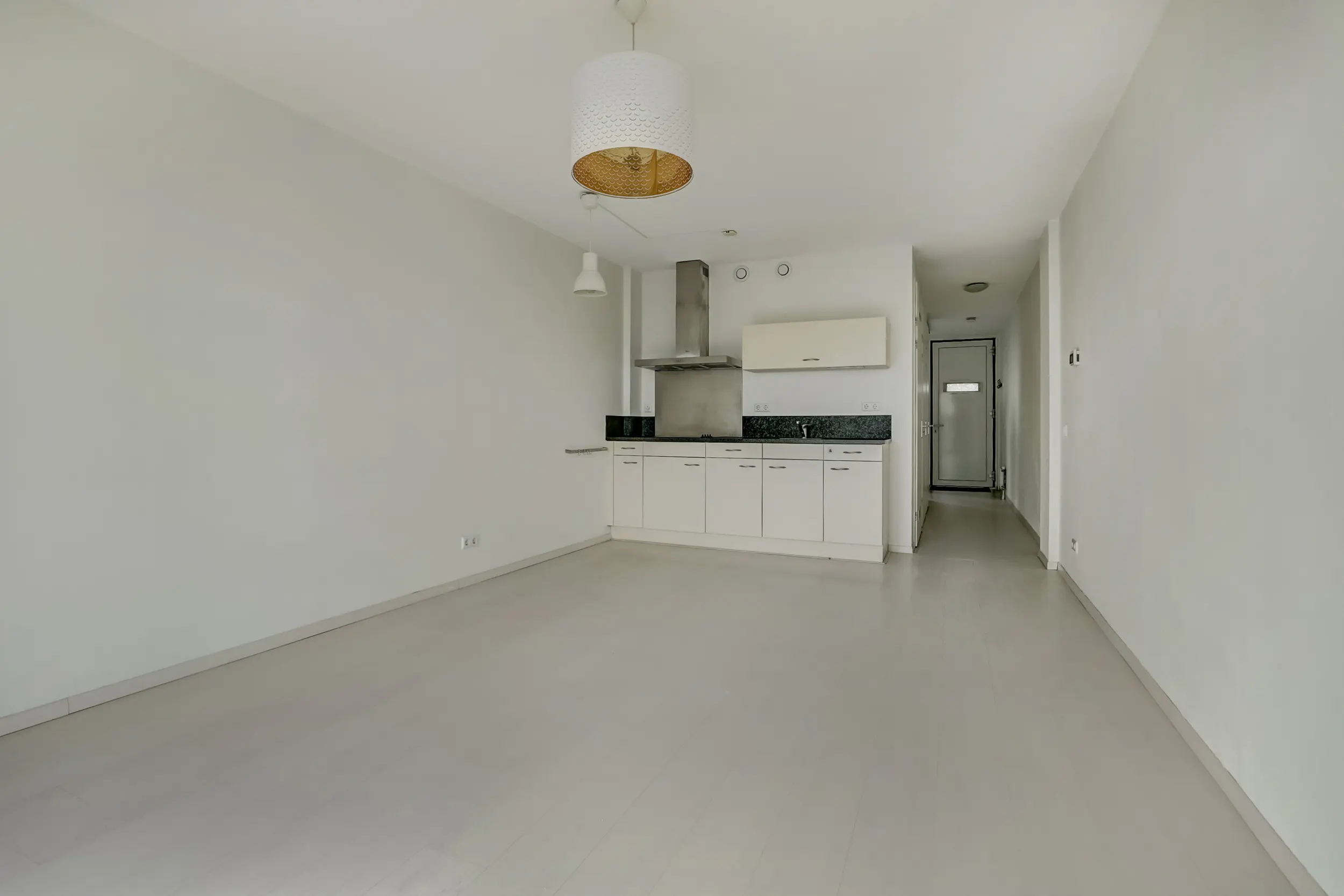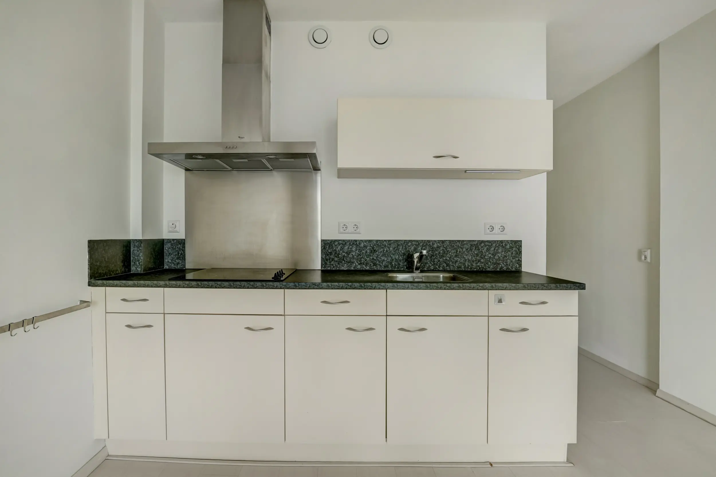 Terug binnen staan we in een woonkamer van ca. 25 m2 die heel goed in te delen is in een gezellige zithoek en een eethoek, misschien wel met een toffe bartafel in de buurt van de open keuken. Het nette keukenblok is uitgevoerd in een neutrale kleur en voorzien van een kookplaat, afzuigkap en een spoelbak met mengkraan. De koelkast plaats je los. In de kastjes is veel ruimte om je spullen op te bergen.