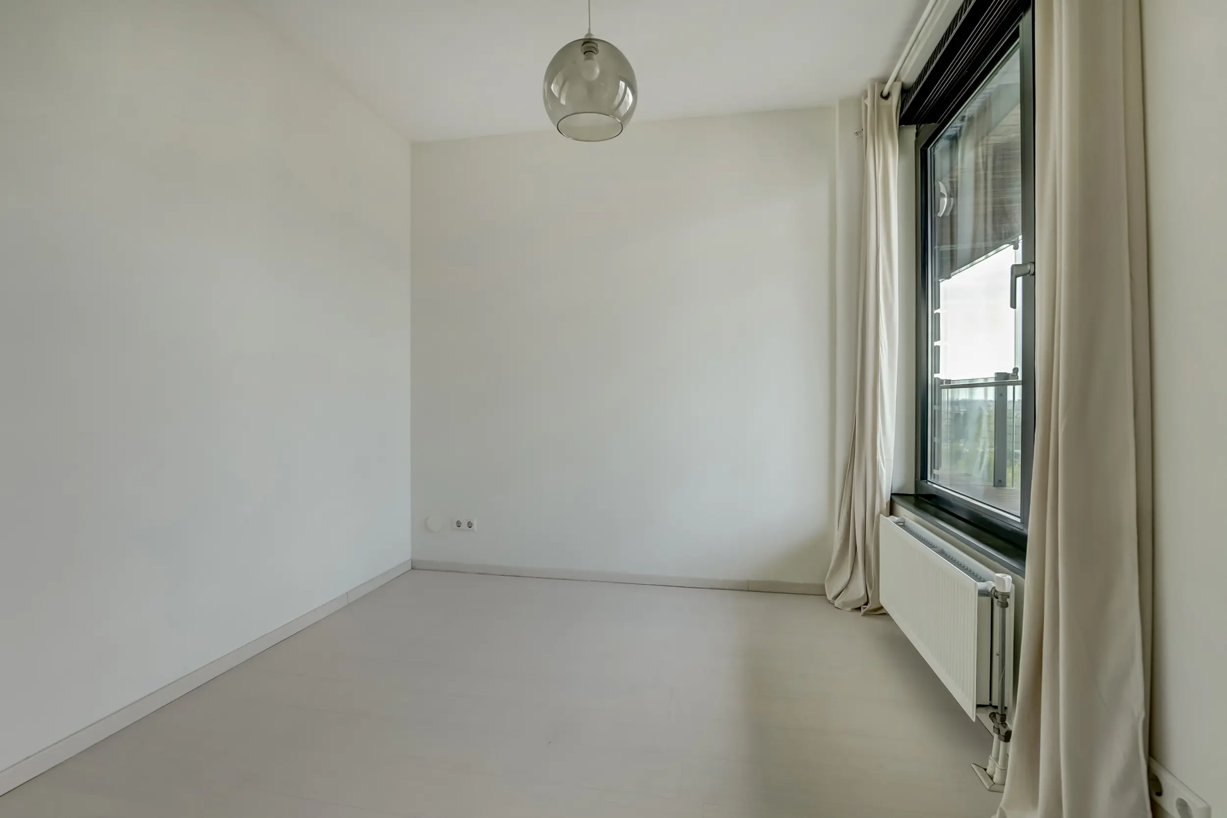 Het appartement is een soort loft, echt een heerlijk licht en open appartement dat ruimer voelt dan de m2 die ervoor staan. Aan de galerijzijde stappen we gelijk de slaapkamer in die je op diverse manieren van de hal kunt afsluiten, dat is helemaal aan jou, je kunt er in ieder geval een mooi tweepersoonsbed kwijt en een grote kledingkast.