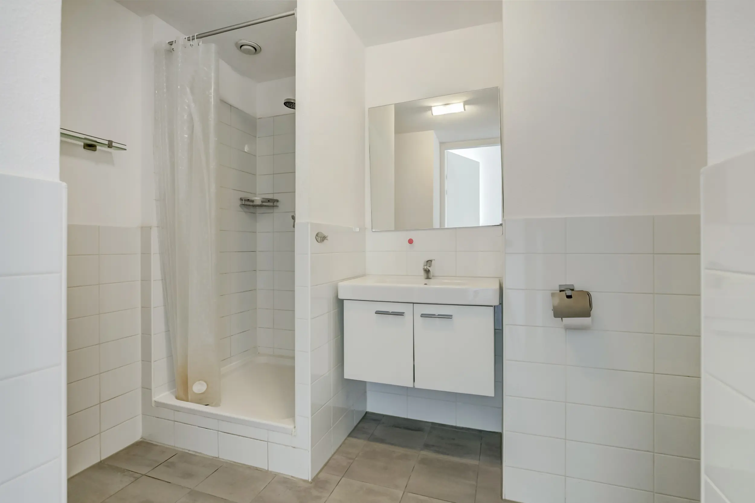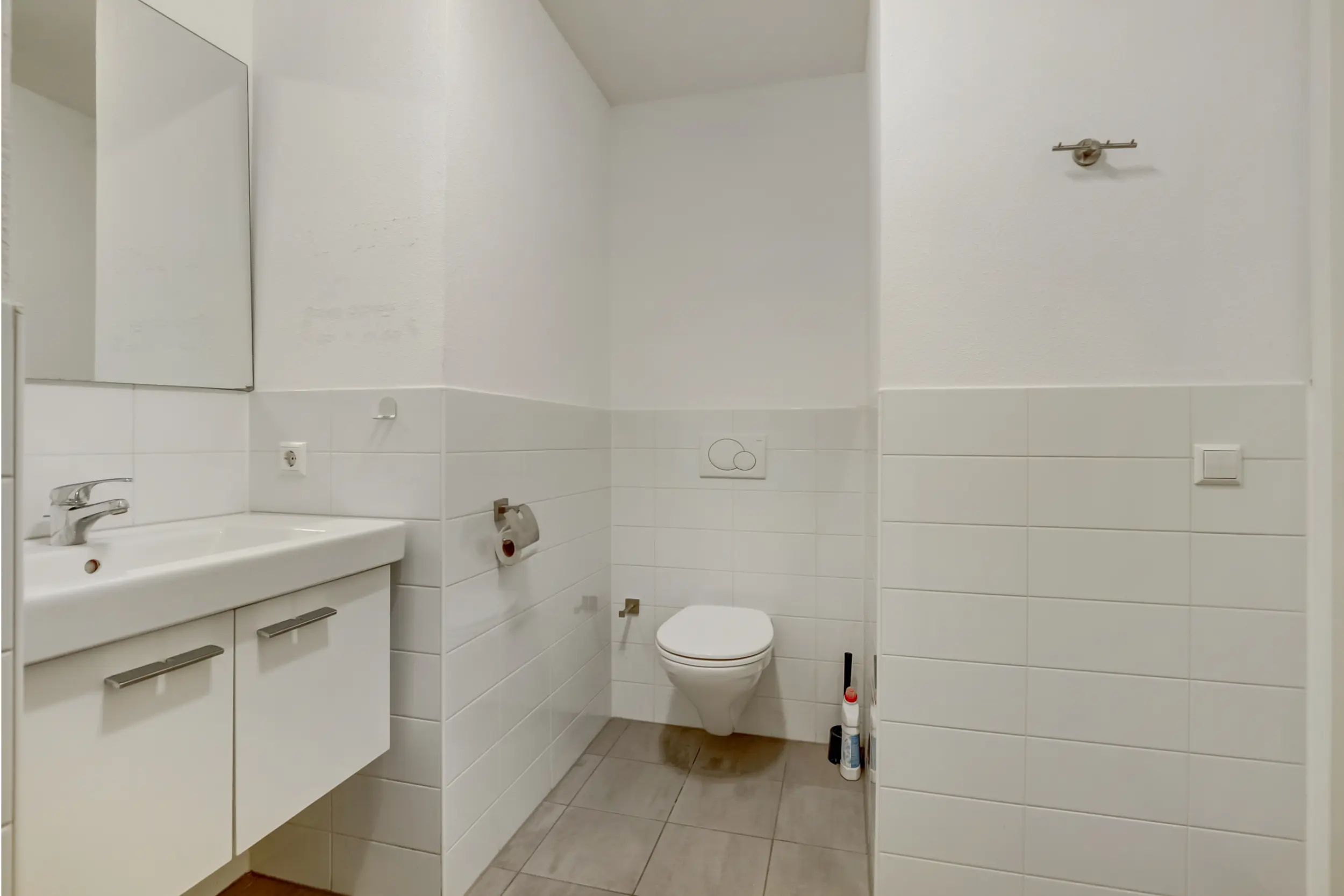 Tussen de woonkamer en de slaapkamer treffen we een functioneel blok dat grotendeels de badkamer beslaat. Een fijne ruime badkamer met het toilet, douche en een grote wastafel met wastafelmeubel en spiegel erboven. De andere 2 ruimtes zijn de meterkast en de kast waar zich de mechanische ventilatie en aansluiting voor de wasmachine bevindt.