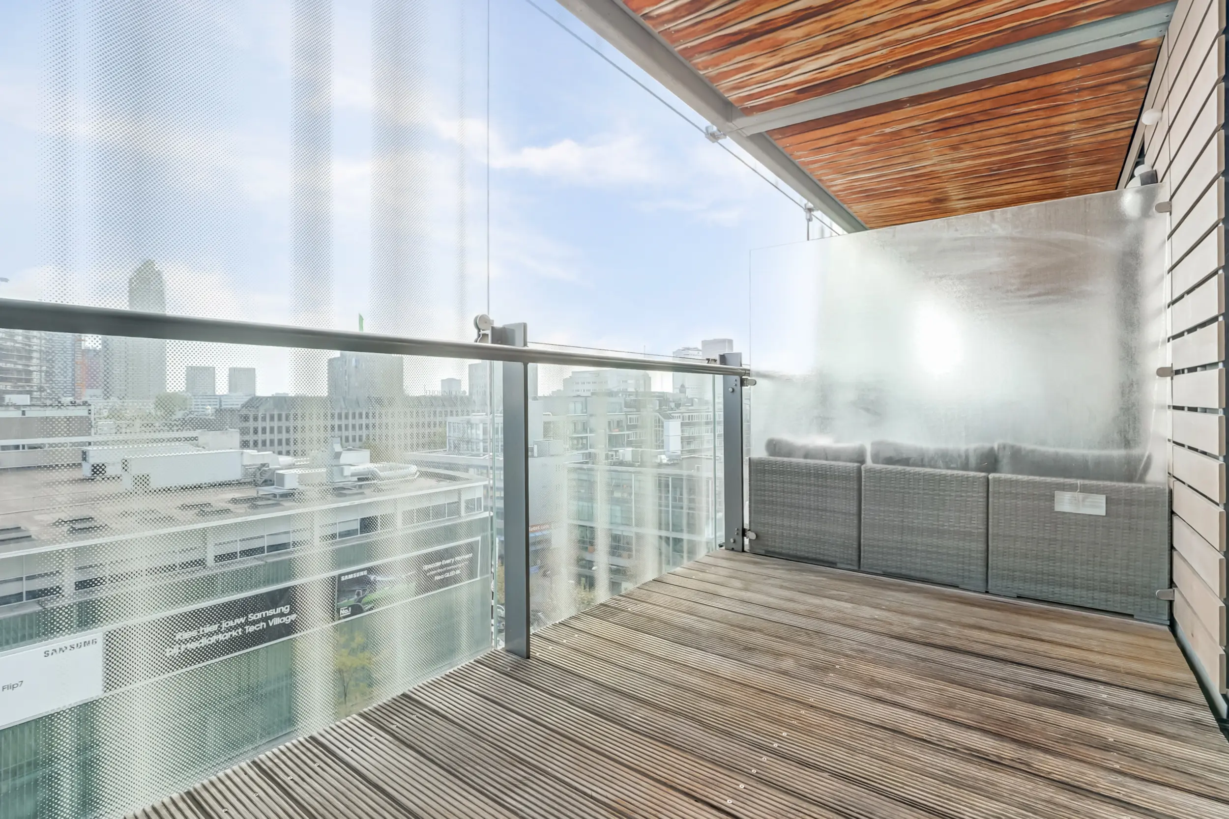 Dan lopen we door naar de woonkamer, want we worden getrokken door het vele licht dat door de grote pui komt die uitkomt op het balkon! Wat een buitenruimte, met 9 m2 is dit echt een heerlijk ruim balkon vol op het zuiden. Vooral de diepte van 2,27 m2 zorgt ervoor dat je languit op je balkon kunt liggen in een grote ligstoel om even lekker van de zon te genieten. En dat met het geroezemoes van de stad onder je, je wordt er spontaan rustig van.