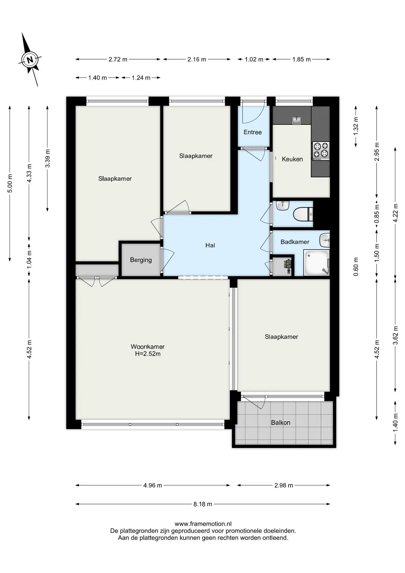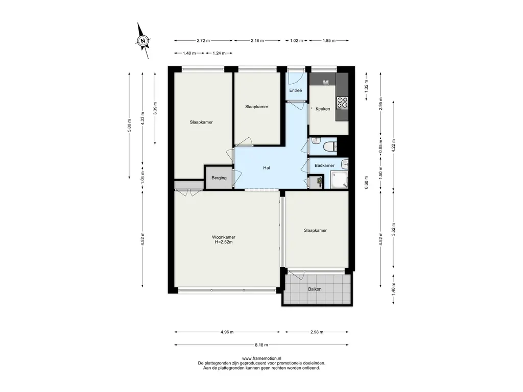 Binnenkomst in de hal, die toegang biedt tot de woonkamer, keuken, twee slaapkamers, een diepe bergkast, de badkamer en het toilet.