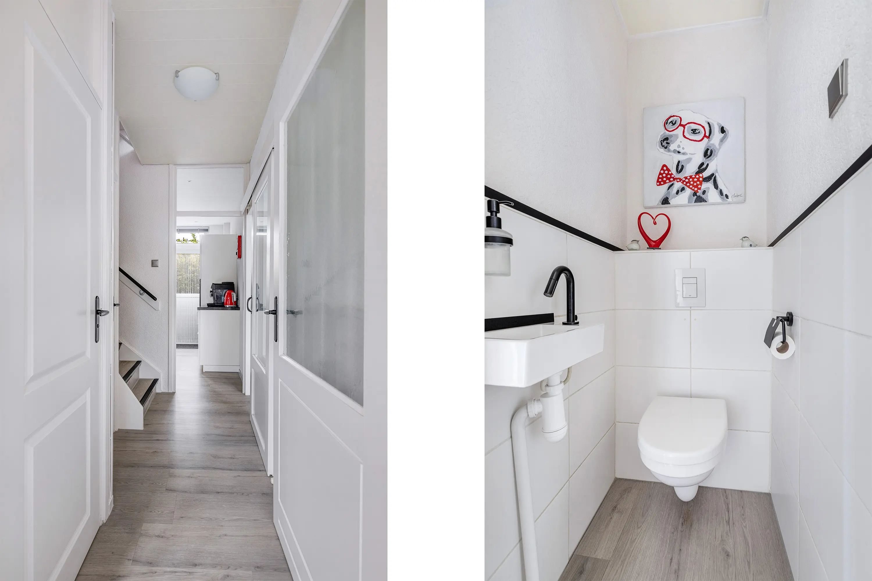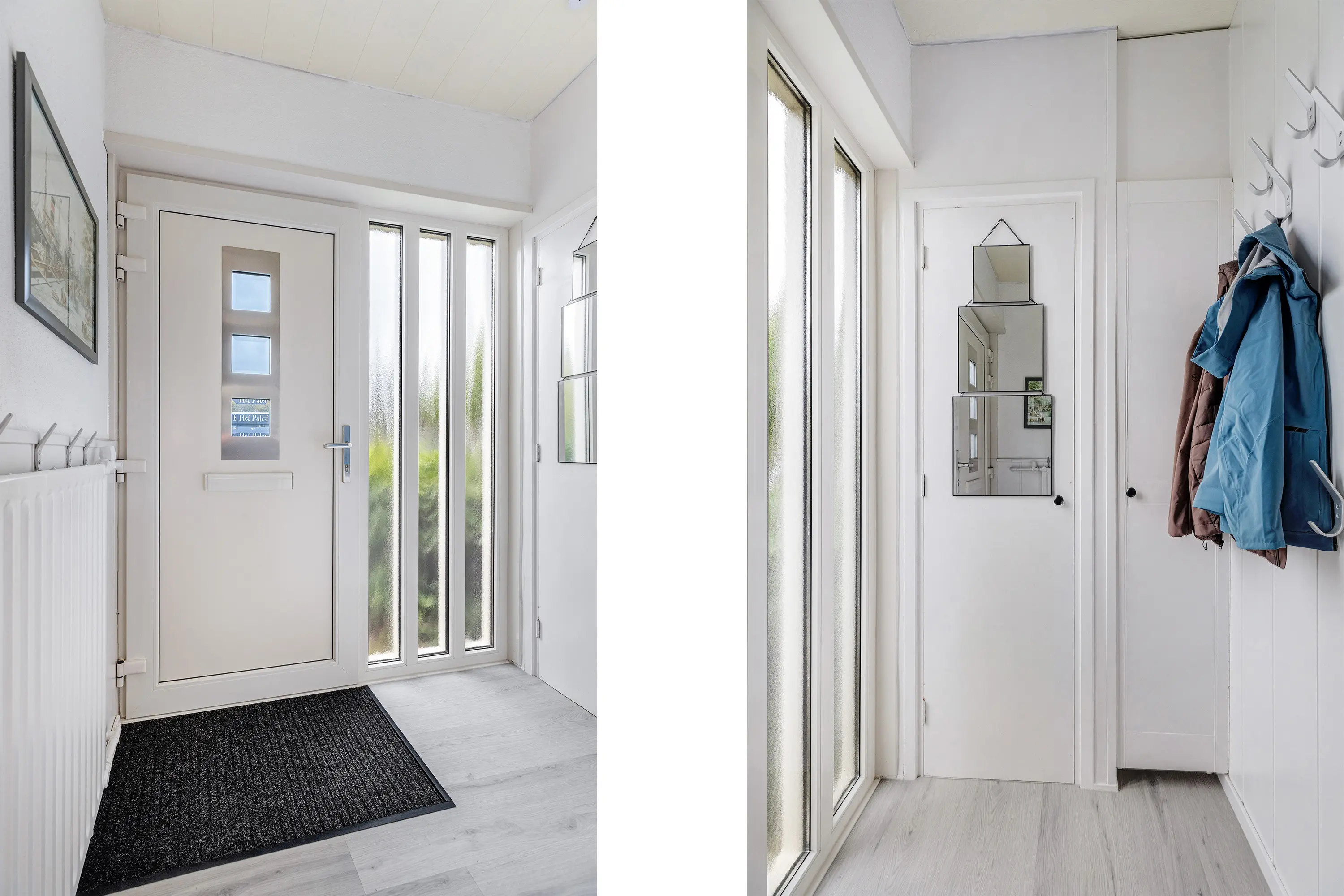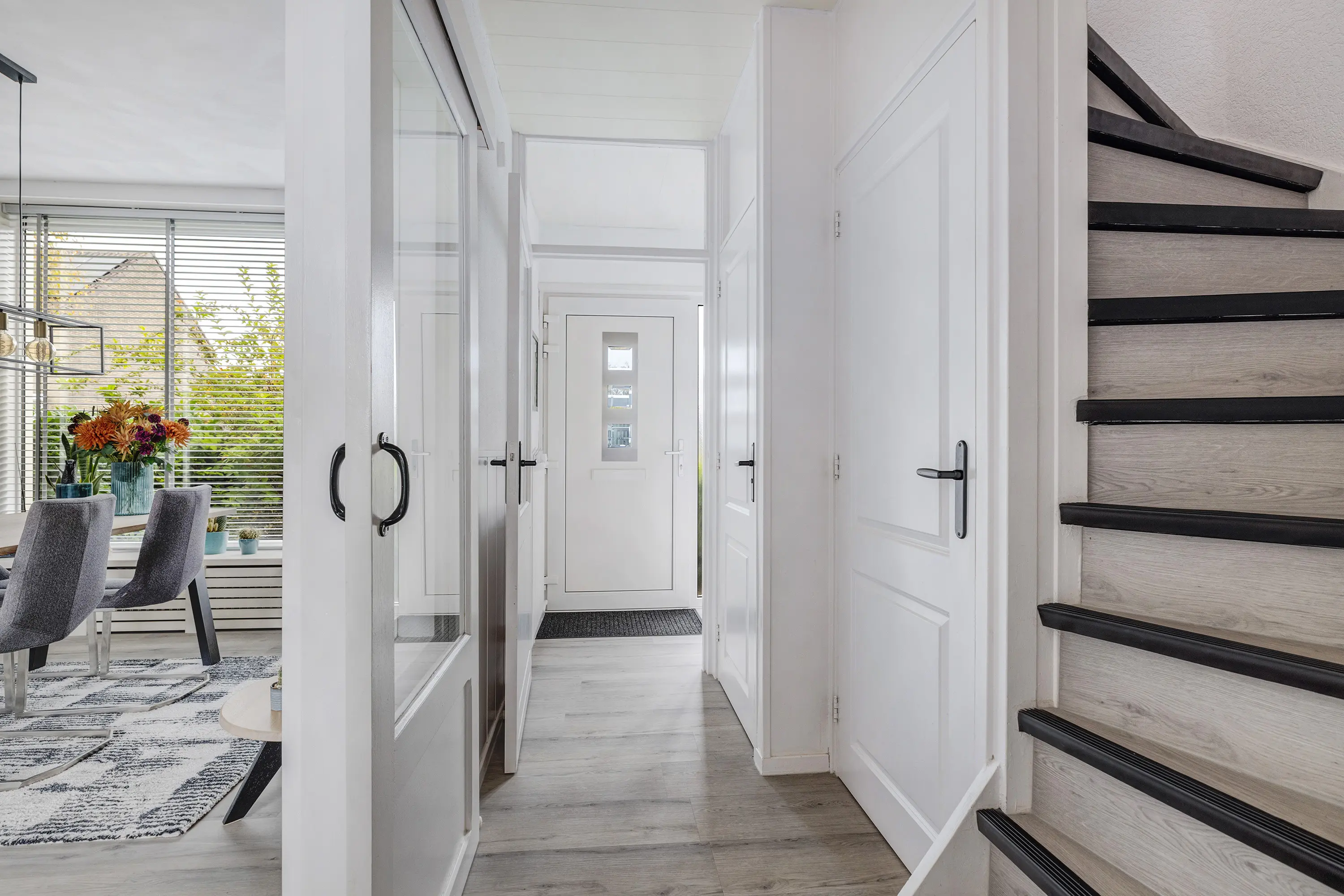 Via het voorportaal met meterkast en schoenenkast stap je de hal binnen, waar zich het toilet en de toegangen tot zowel de woonkamer als de keuken bevinden.