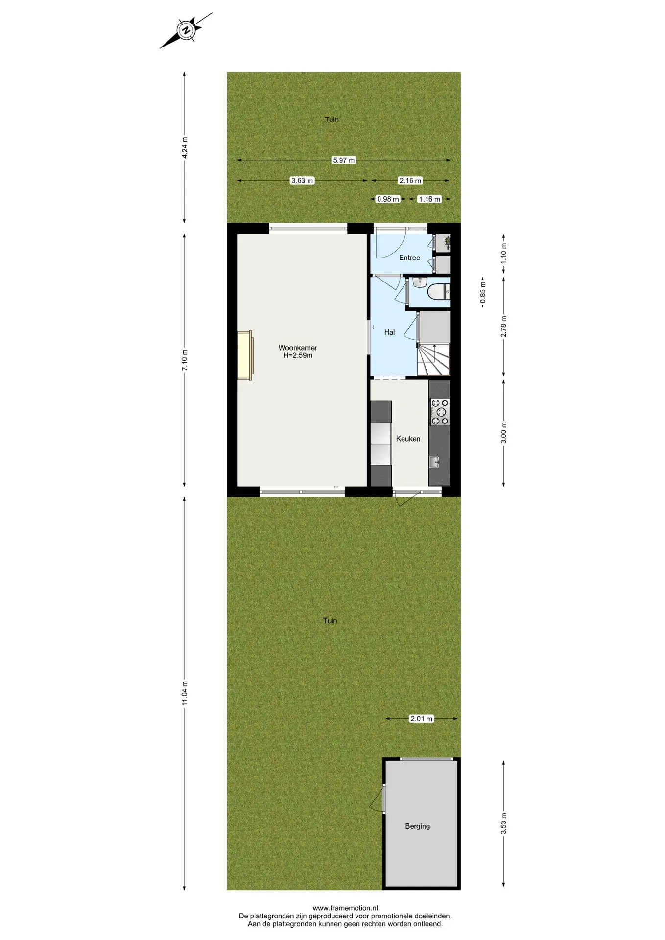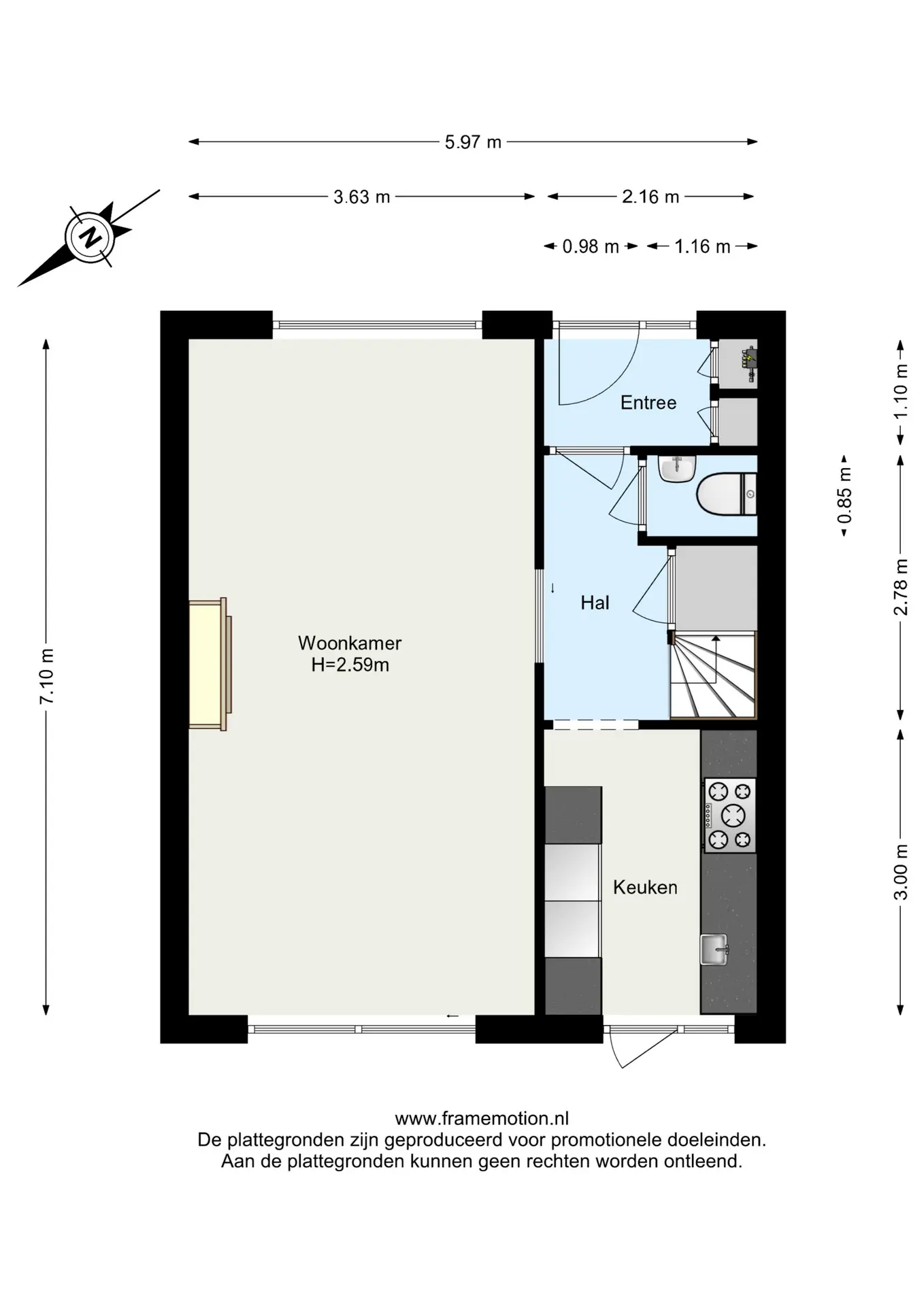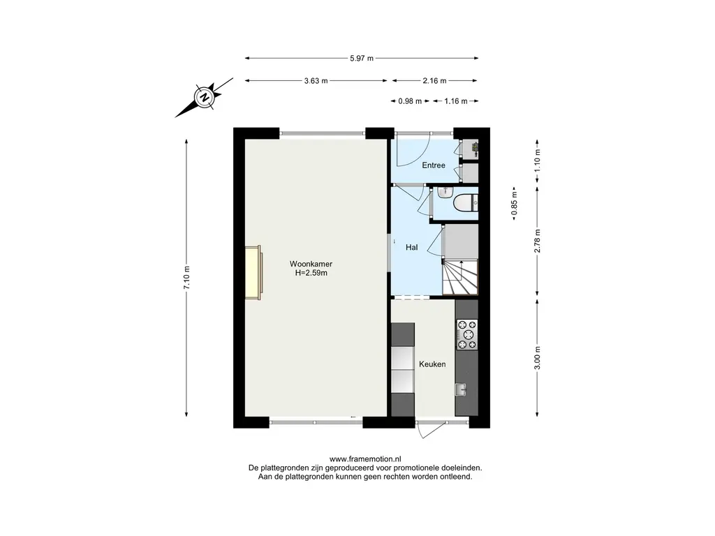 Via het voorportaal met meterkast en schoenenkast stap je de hal binnen, waar zich het toilet en de toegangen tot zowel de woonkamer als de keuken bevinden.