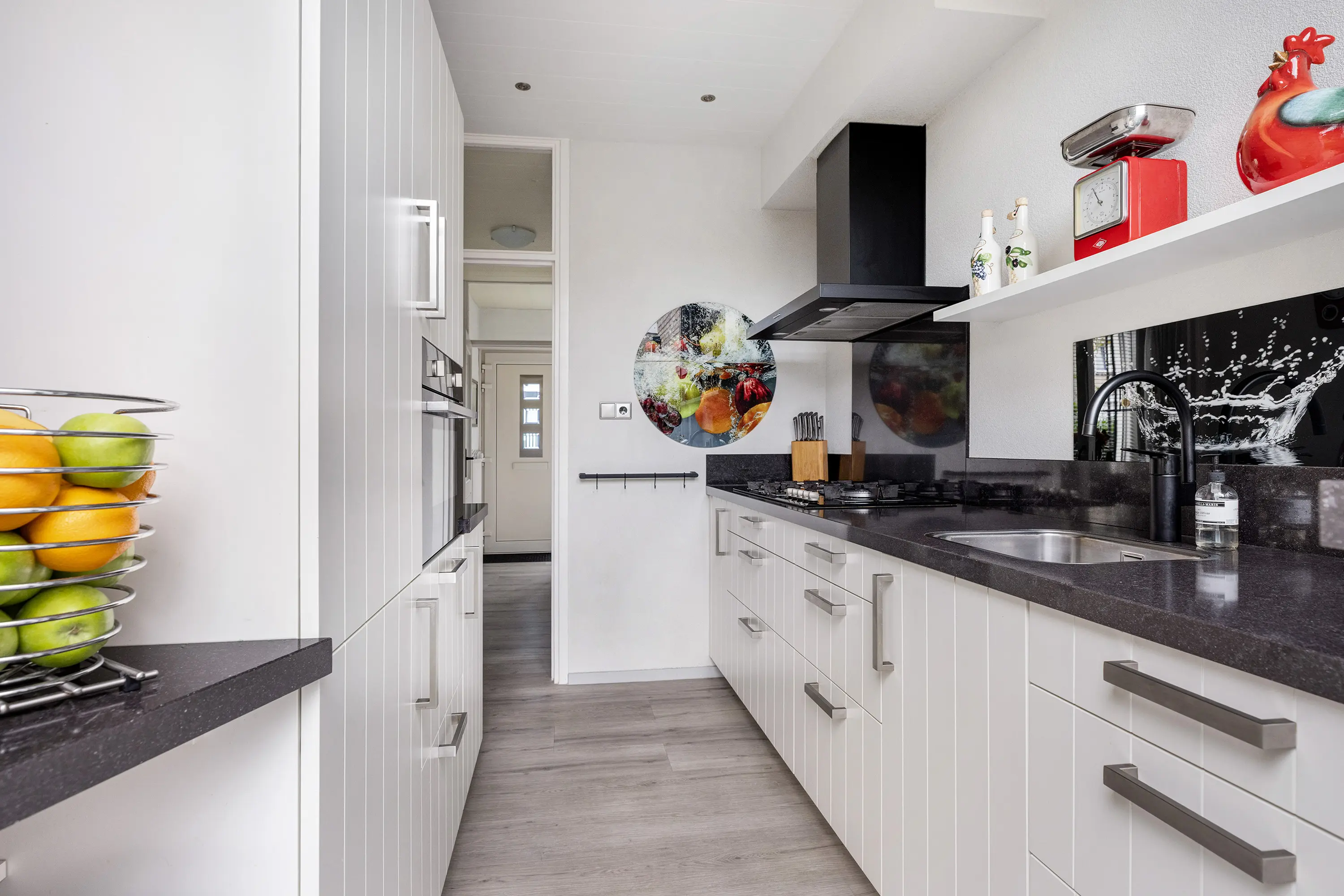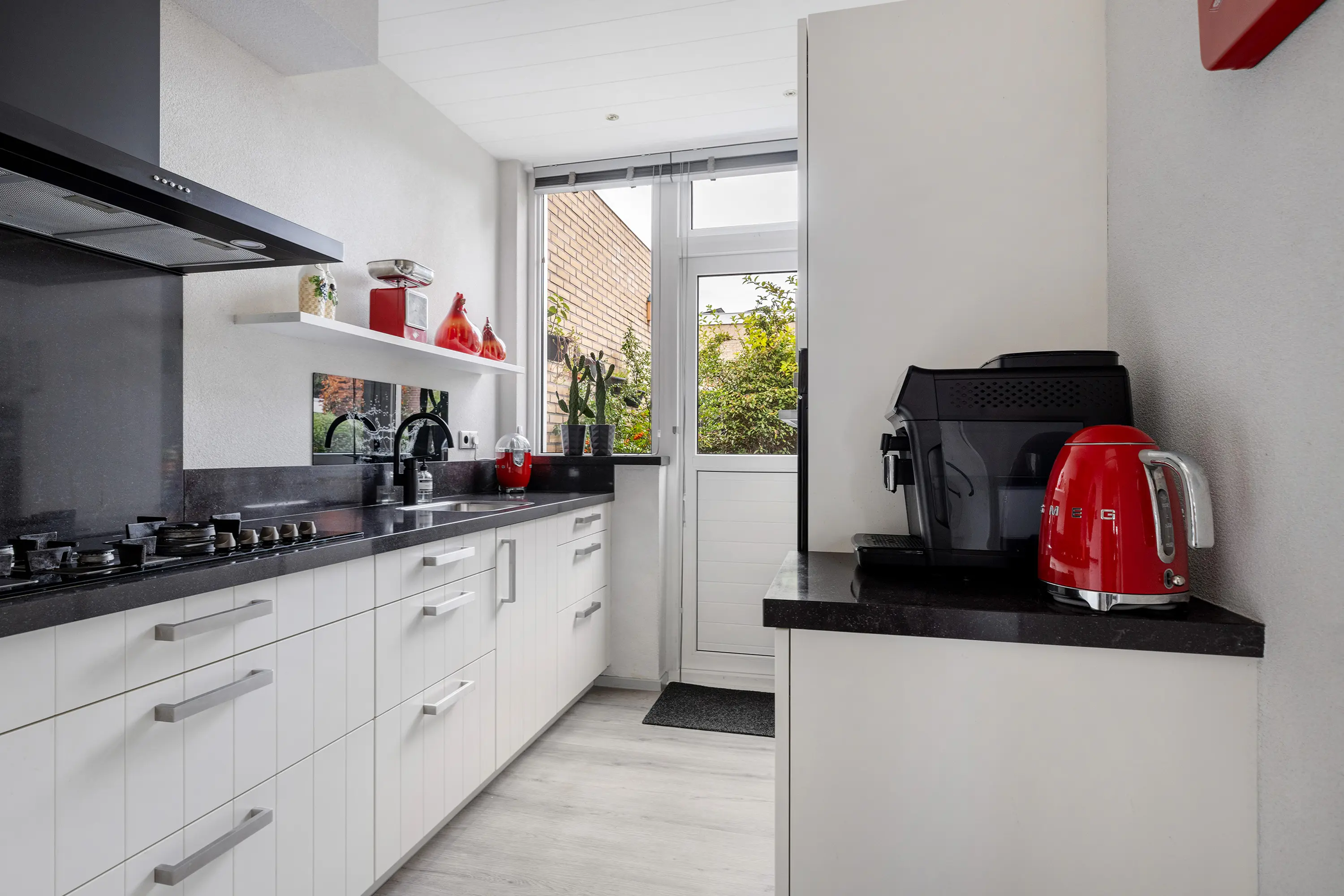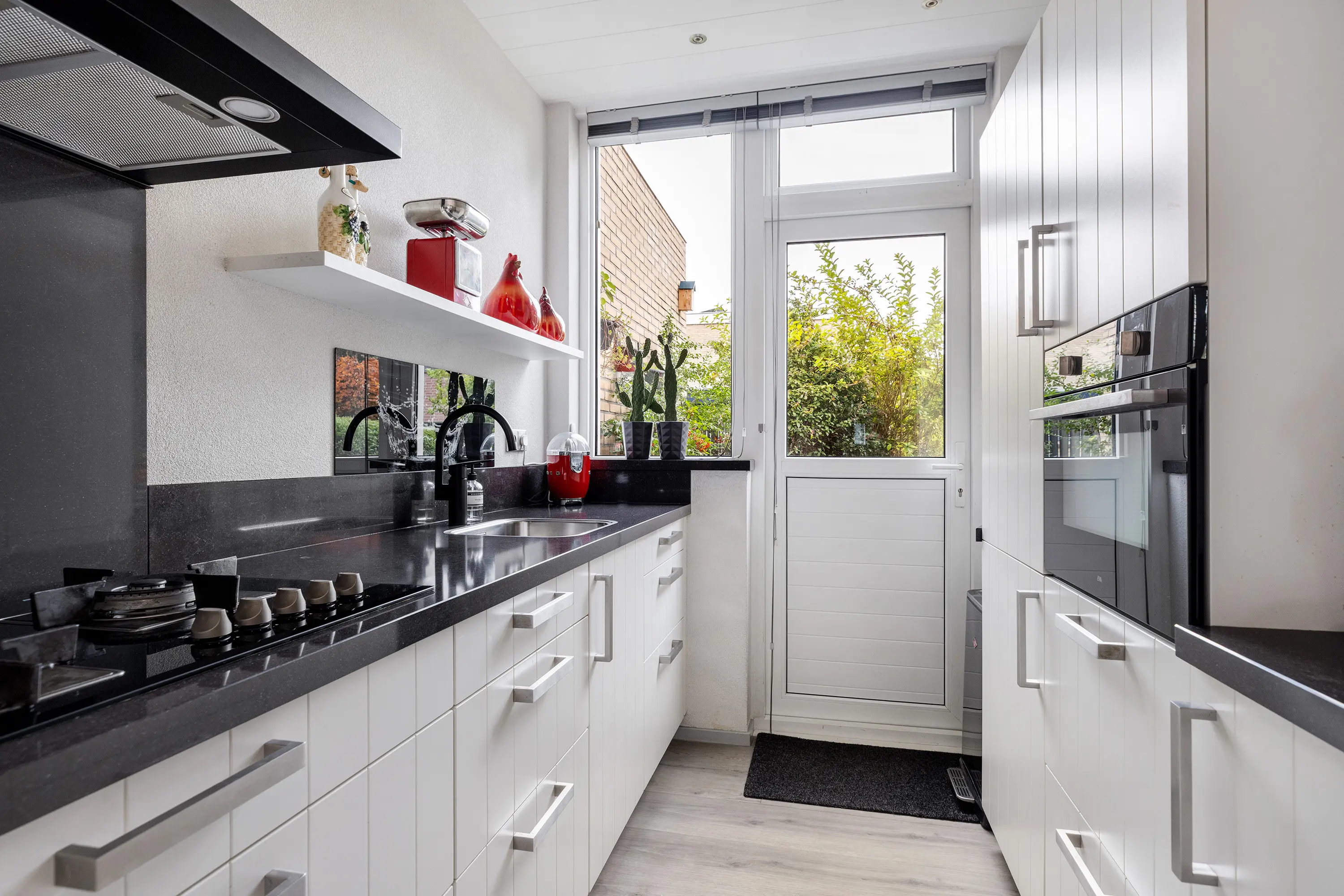 De keuken, bereikbaar vanuit de hal, heeft twee rechte opstellingen in een rustige beige tint met een zwart composiet aanrechtblad. Alle inbouwapparatuur is aanwezig: combi-magnetron, koel-vriescombinatie, 5-pits gaskookplaat en afzuigkap. Via de loopdeur is er directe toegang tot de tuin.