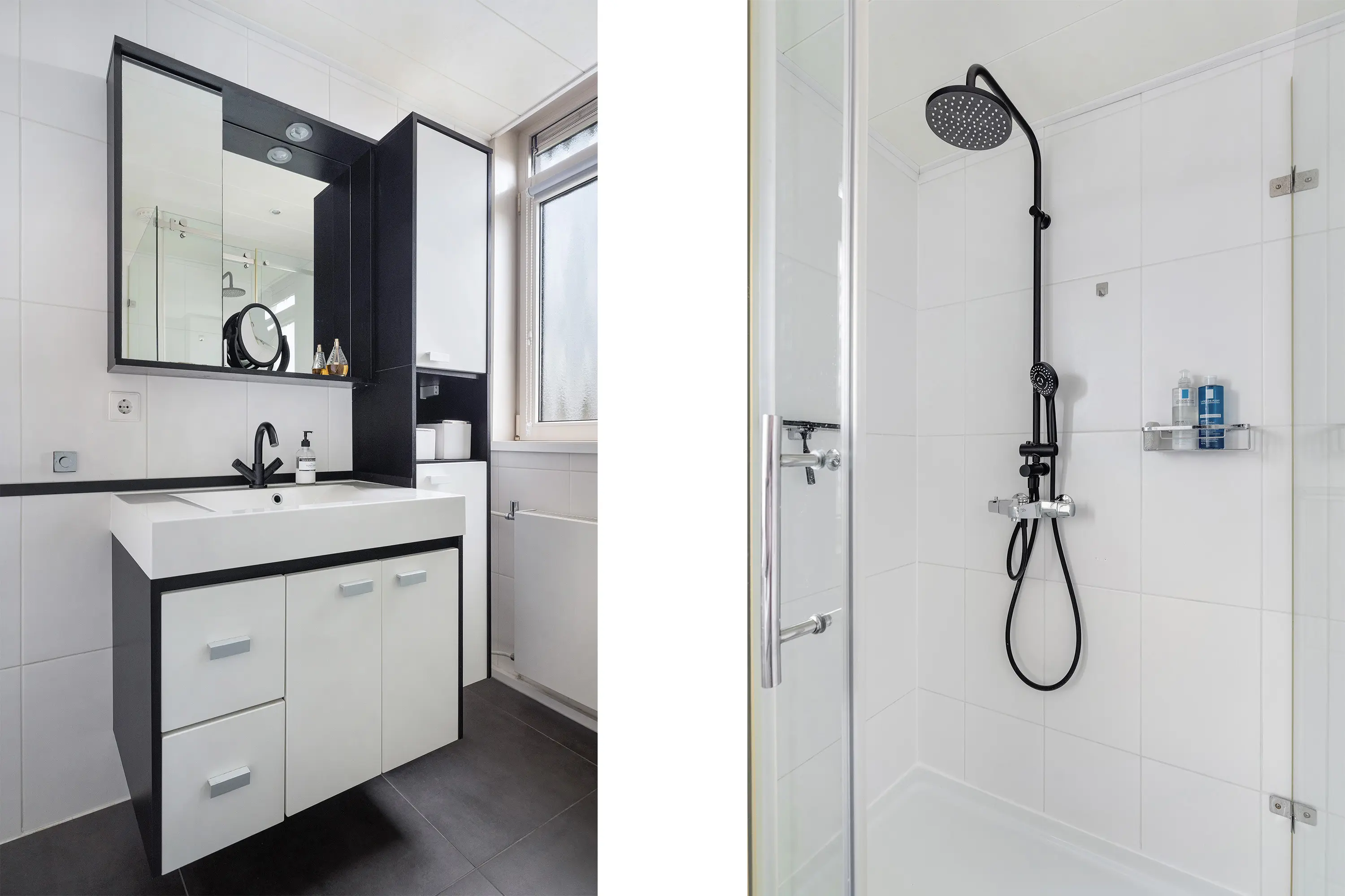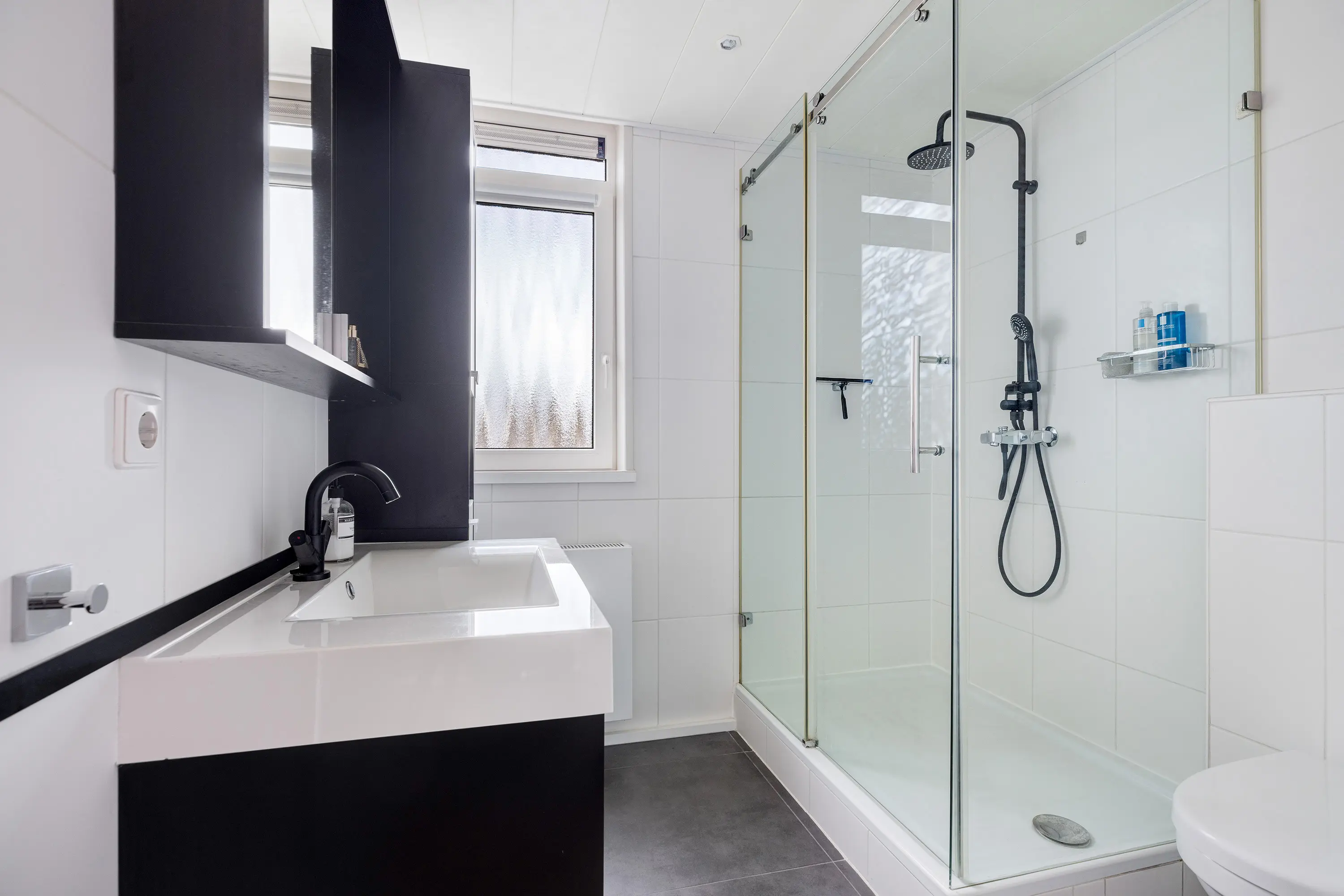 De badkamer is modern uitgevoerd met wit/antraciete betegeling en voorzien van een inloopdouche met glazen wand, een tweede hangend toilet, een wastafelmeubel en een spiegelkast.