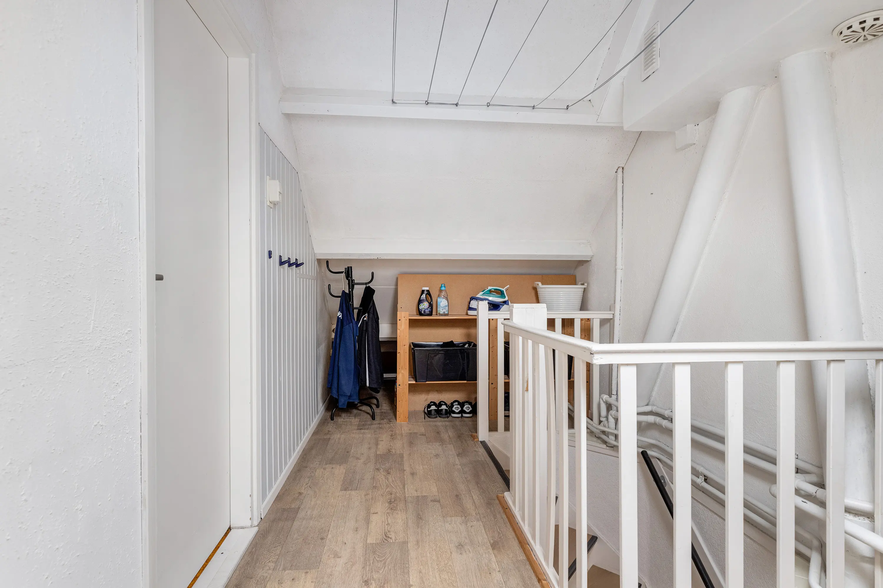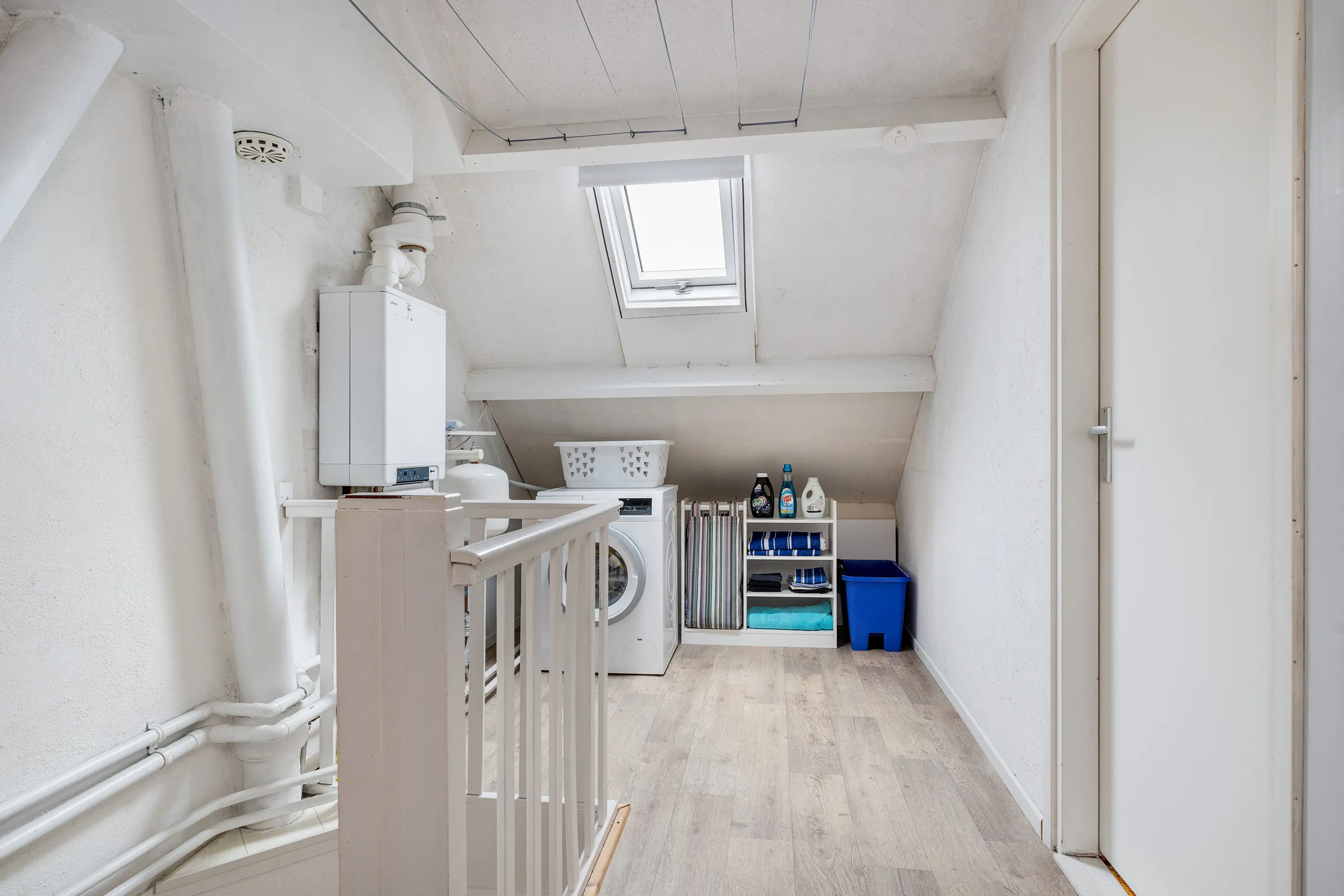 Op de tweede verdieping bevindt zich de overloop met aansluitingen voor wasmachine en droger en de CV-opstelling. Een kunststof Velux dakraam zorgt hier voor natuurlijke lichtinval.
