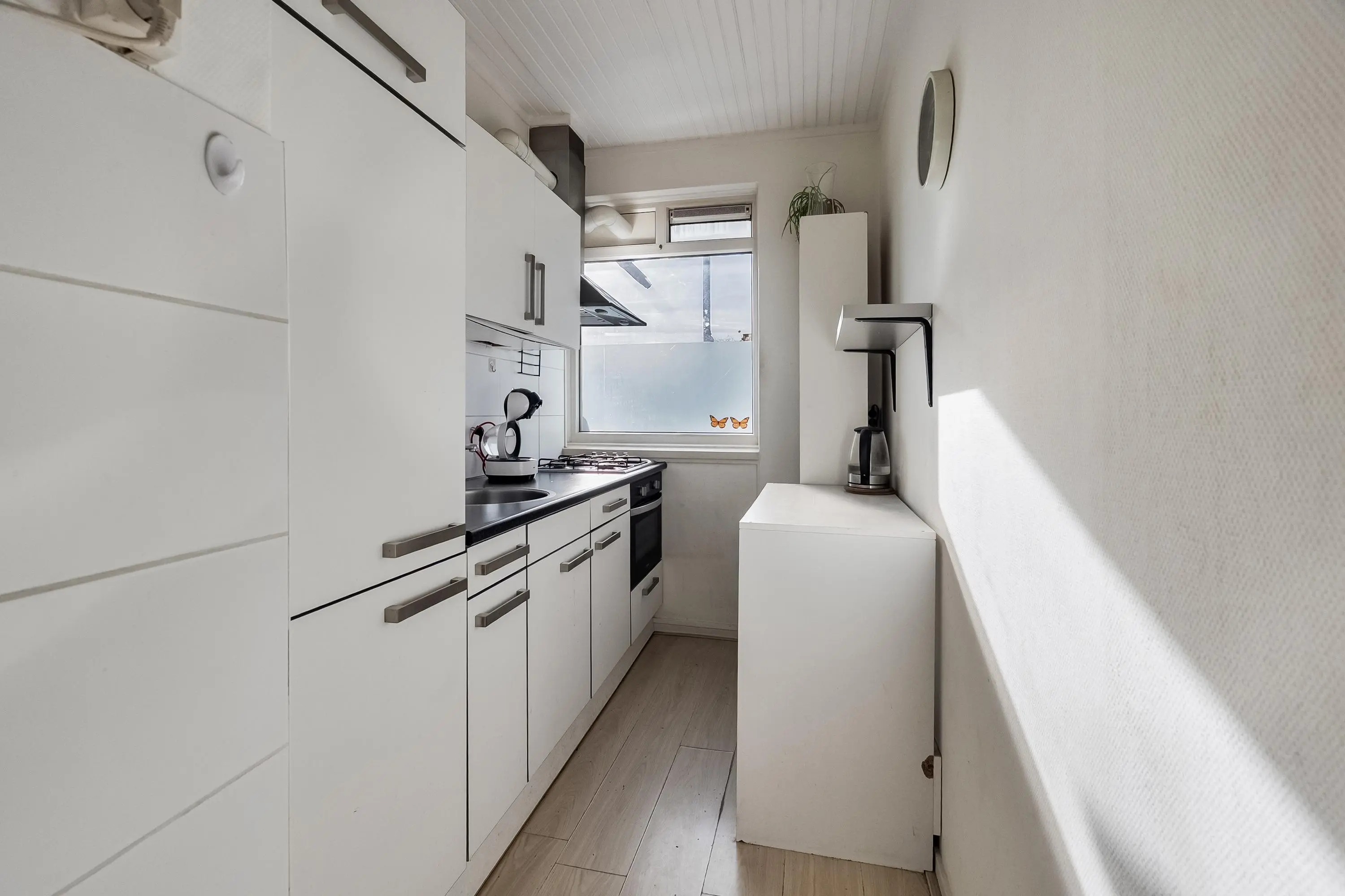 De keuken (ca. 5 m2) is gelegen aan de achterzijde van het complex. De keuken is verder uitgevoerd in een rechte opstelling en voorzien van een koelkast, vriezer, 4-pits gaskookplaat, RVS afzuigkap en een oven. Verder is de keuken voorzien van een enkele spoelbak. Het geheel is uitgevoerd in wit en is afgewerkt met een kunststof aanrechtblad en laminaatvloer.