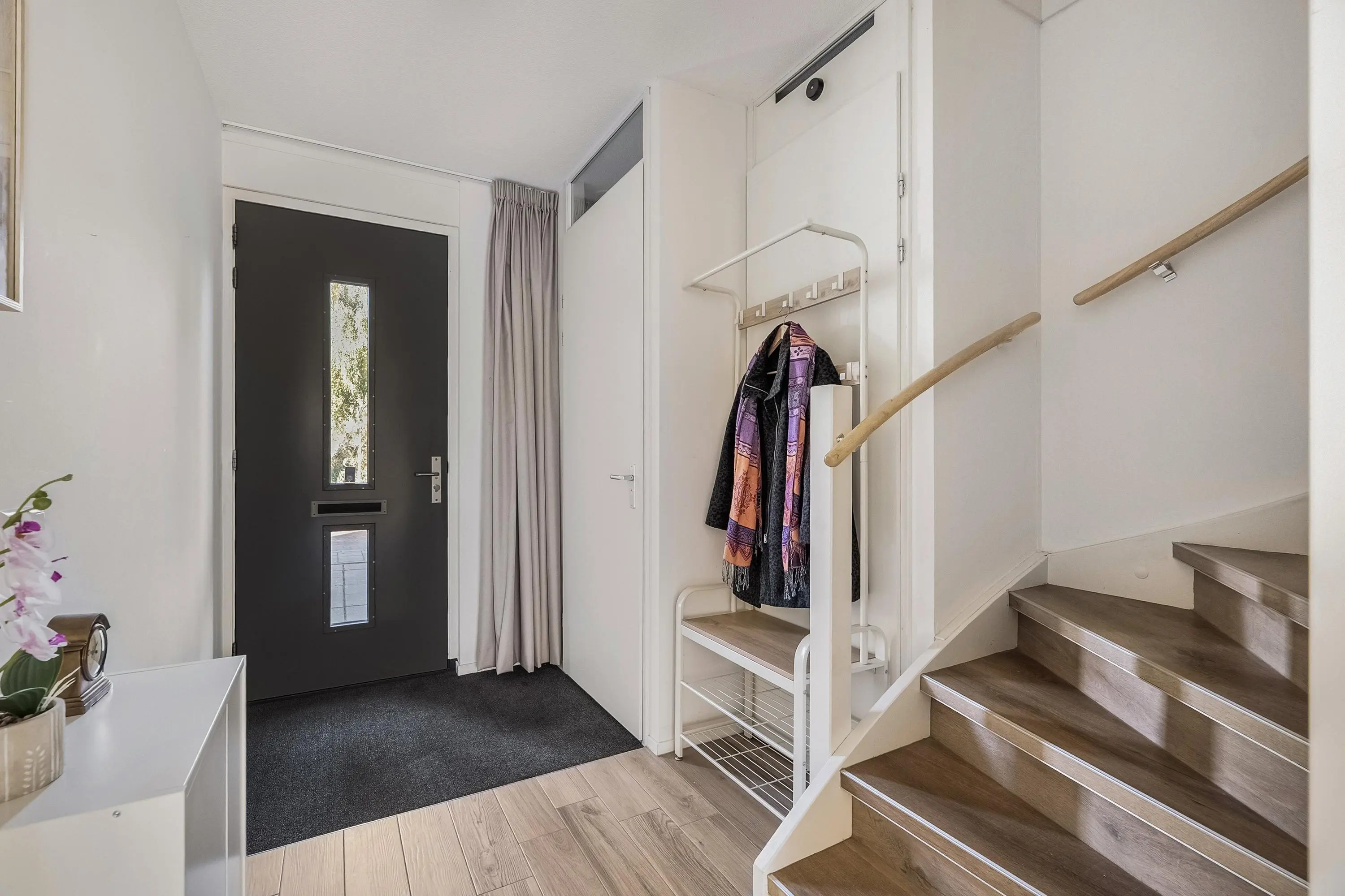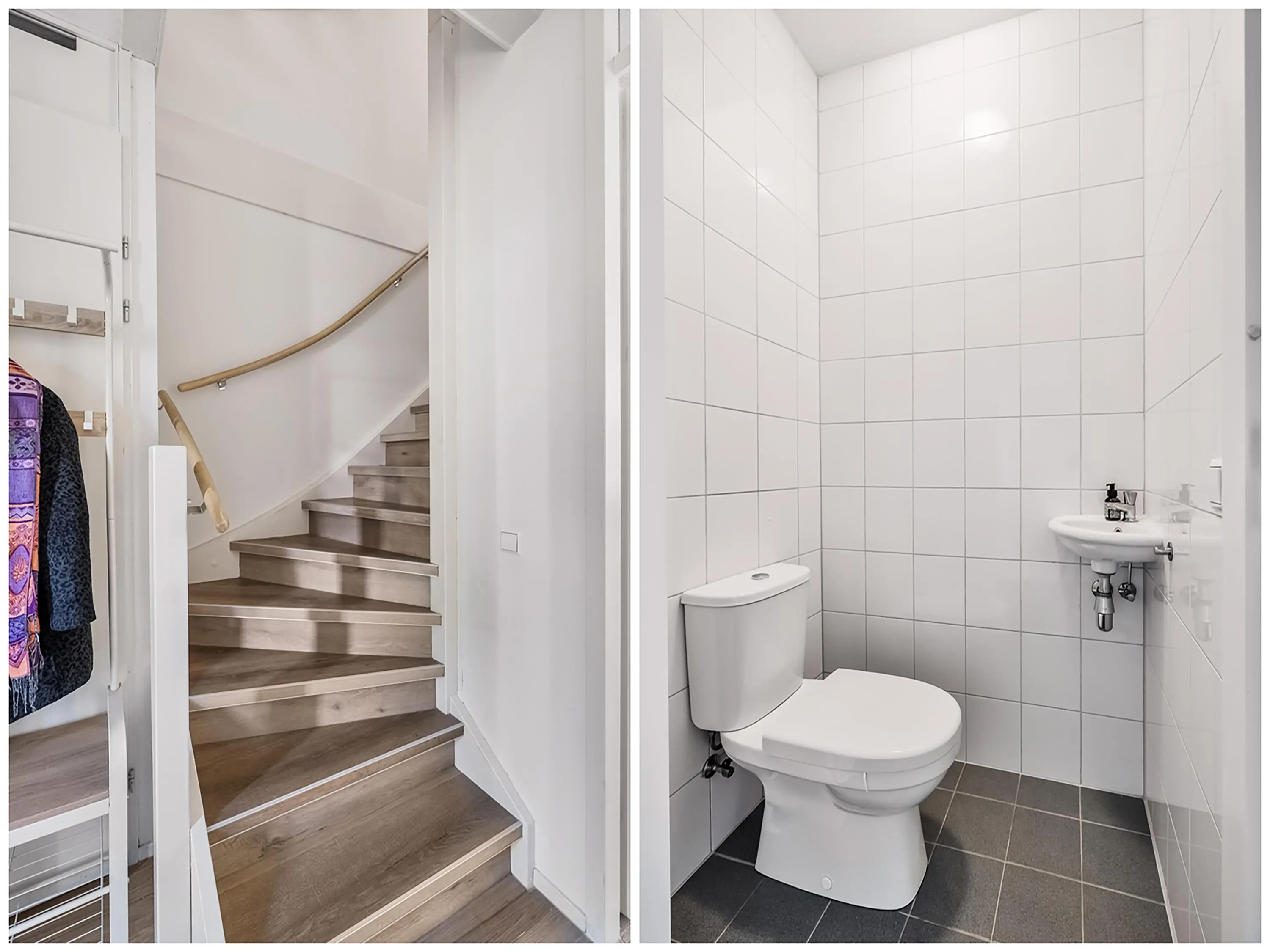 Entree, hal met meterkast, trap naar de tweede verdieping, toiletruimte voorzien van een duoblok en fonteintje. De toiletruimte is geheel betegeld in een wit/grijs kleurstelling. De trap naar de eerste verdieping is voorzien van traprenovatie met houtlook PVC.