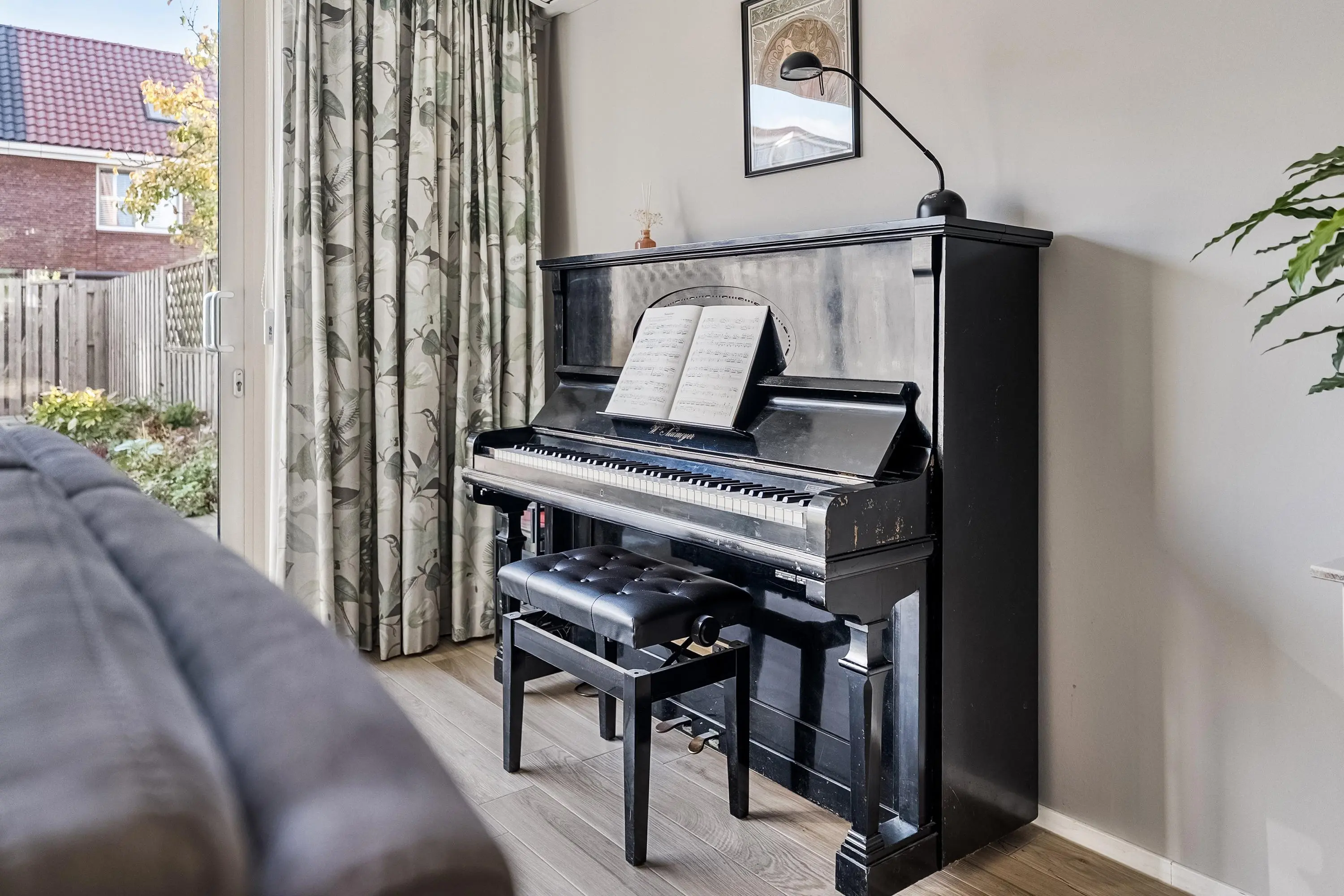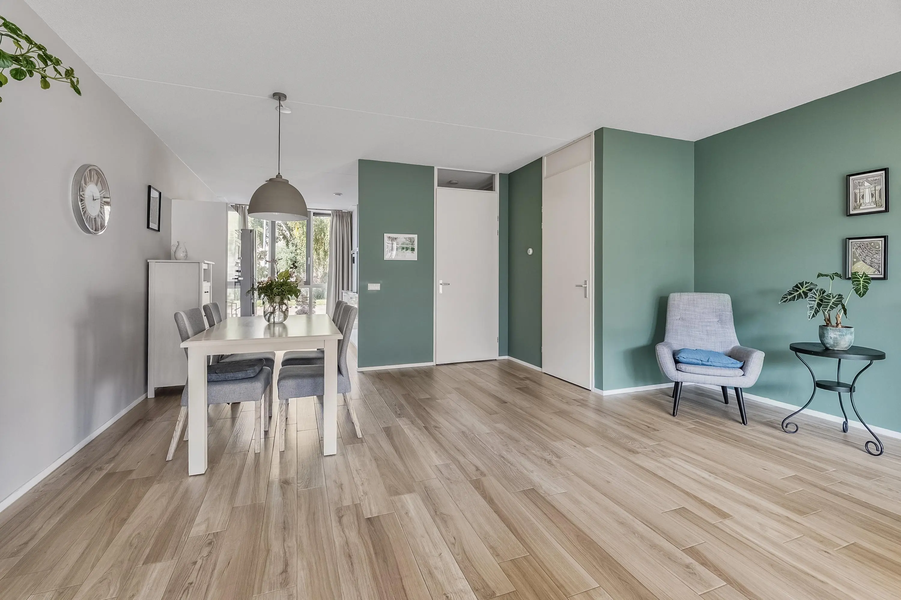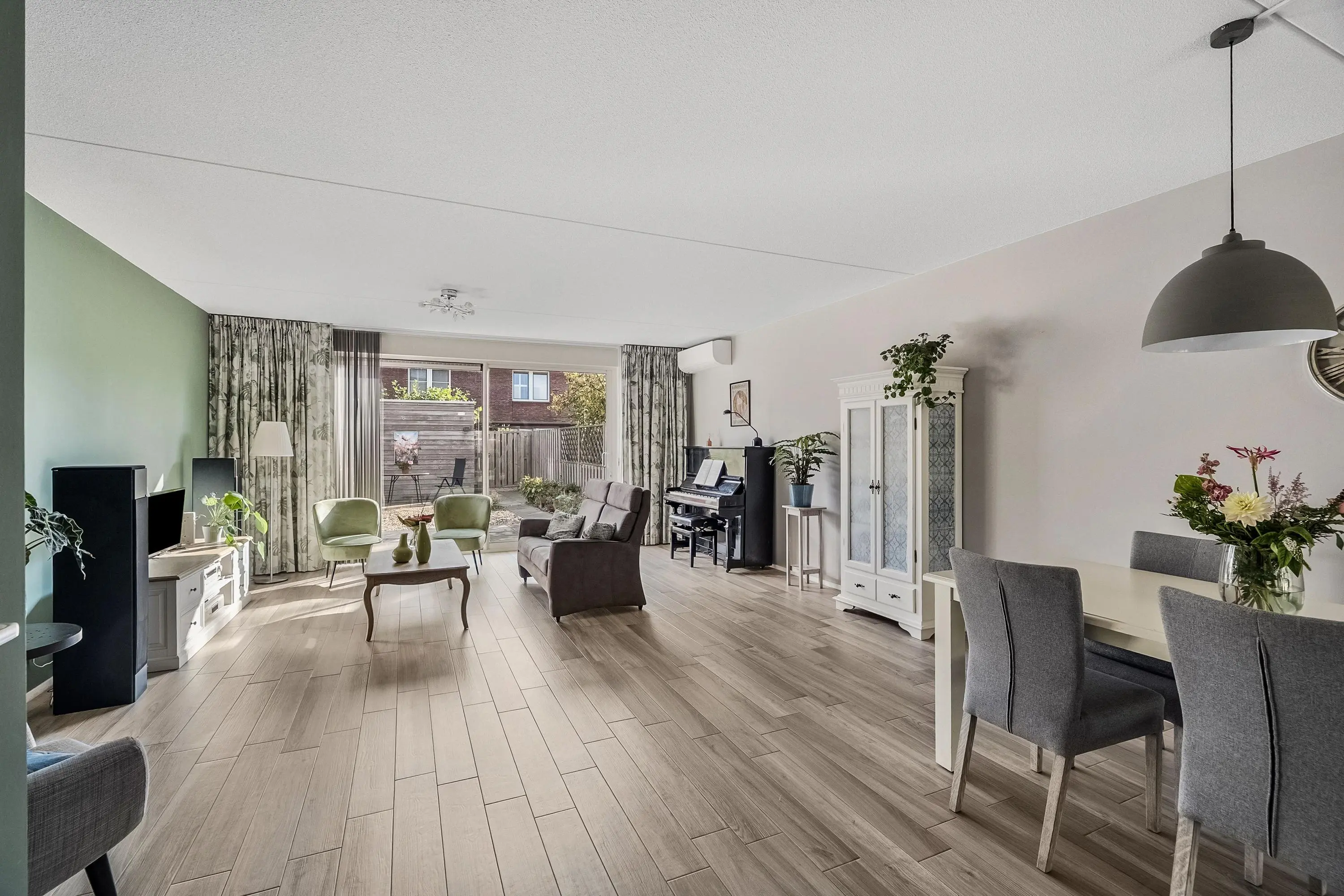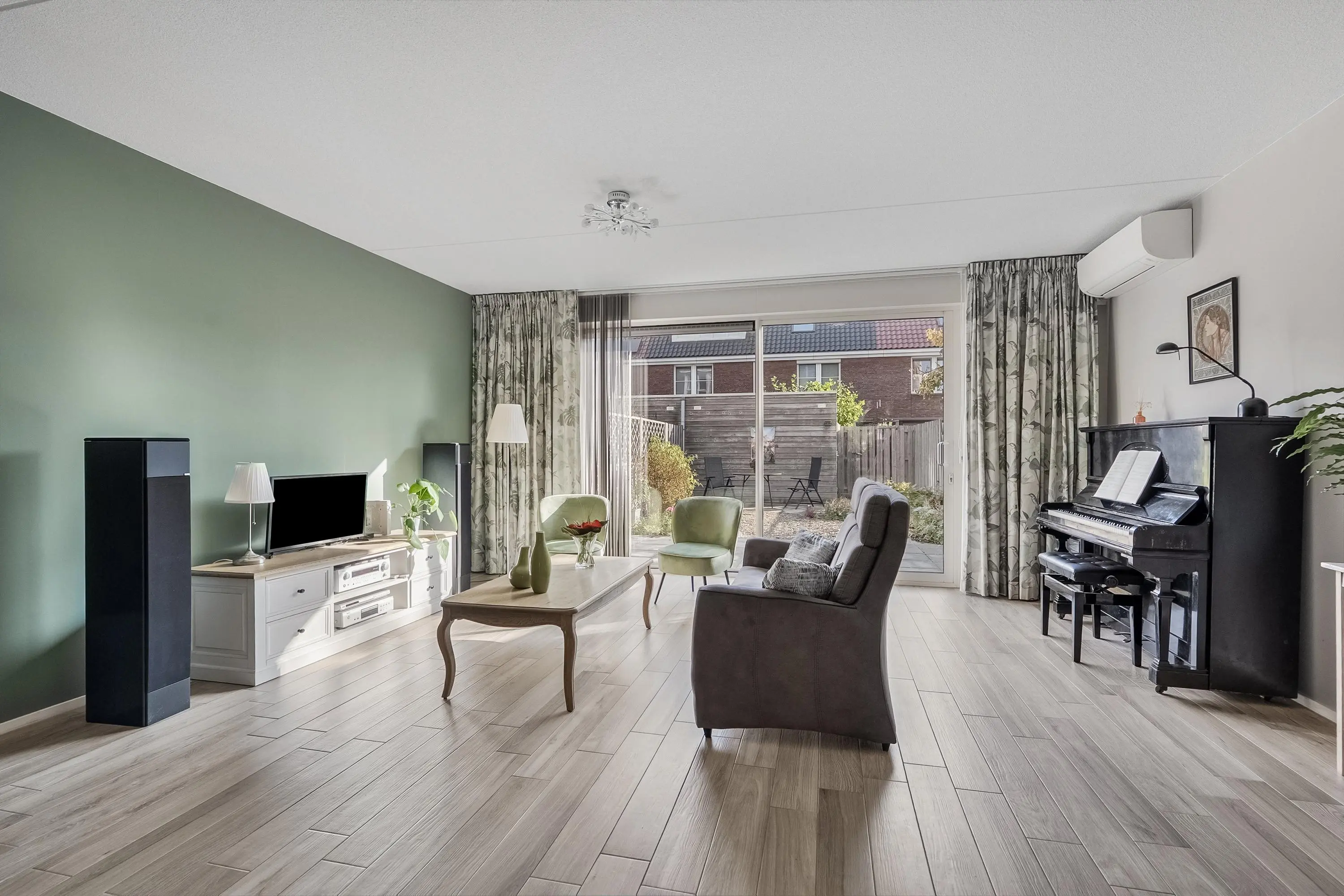 Uitgebouwde lichte tuingerichte woonkamer (ca. 43 m2) voorzien van een moderne keramische parketvloer met vloerverwarming en een airconditioningsysteem (verwarmt/koelt) voor optimaal woon-/klimaatcomfort. De woonkamer beschikt verder over een trapkast. Ideaal om te gebruiken als voorraadkast en/of extra bergruimte. De uitbouw aan de achterzijde zorgt voor extra leefruimte en een fijne verbinding met de tuin. Dankzij de grote raampartijen en de schuifpui aan de achterzijde geniet deze begane grond van een uitzonderlijke lichtinval. Het natuurlijke licht stroomt overvloedig binnen en versterkt het ruimtelijke gevoel.