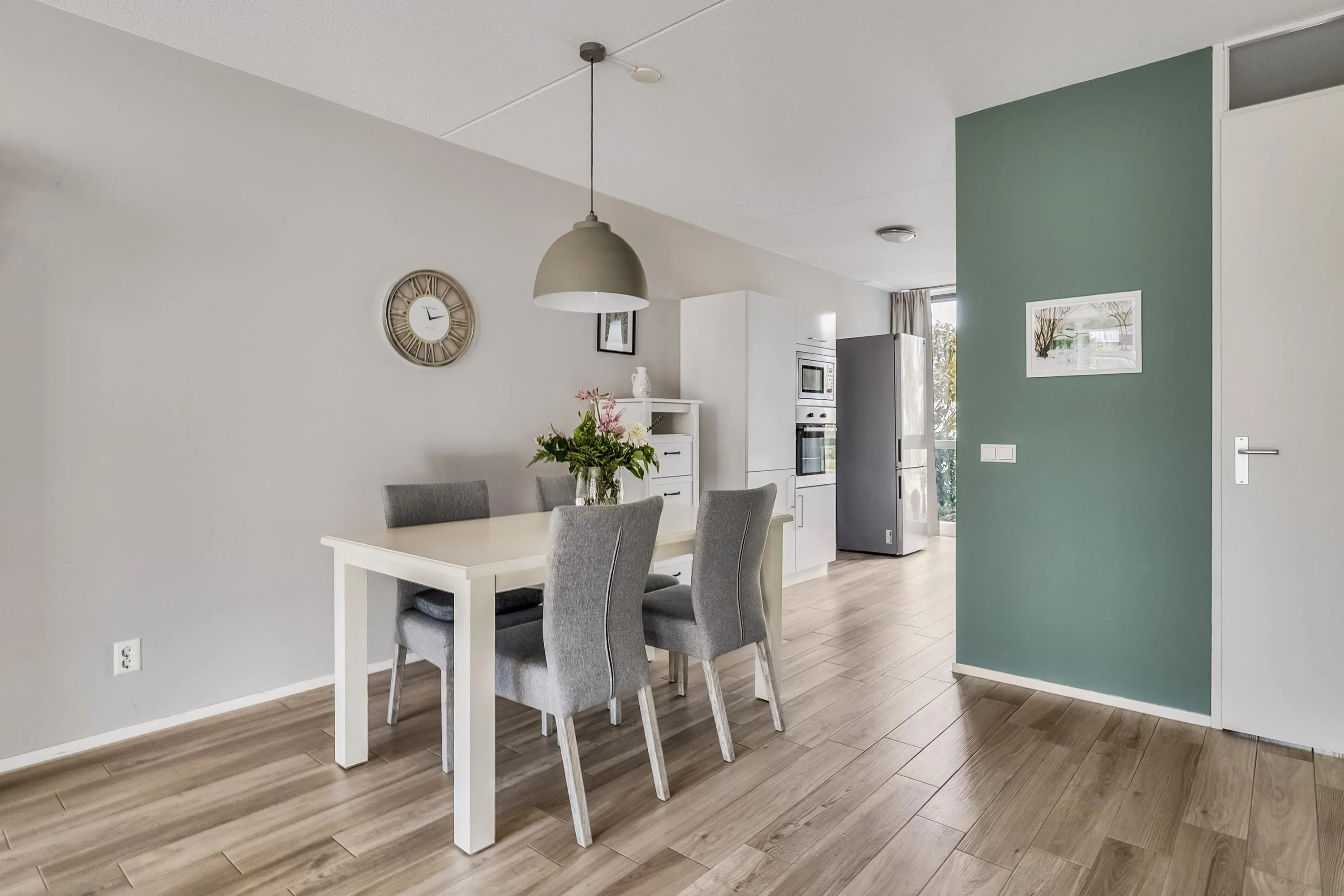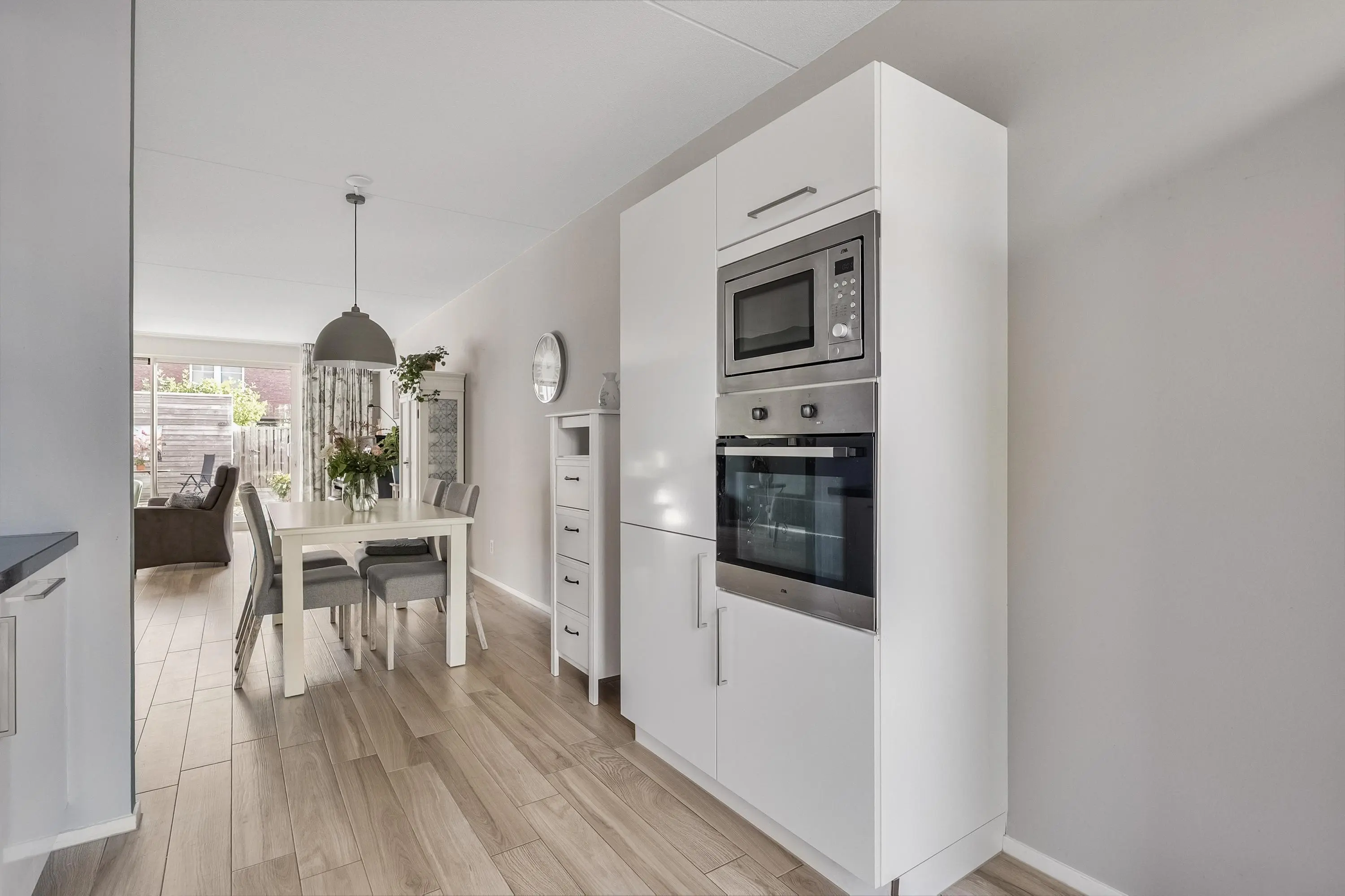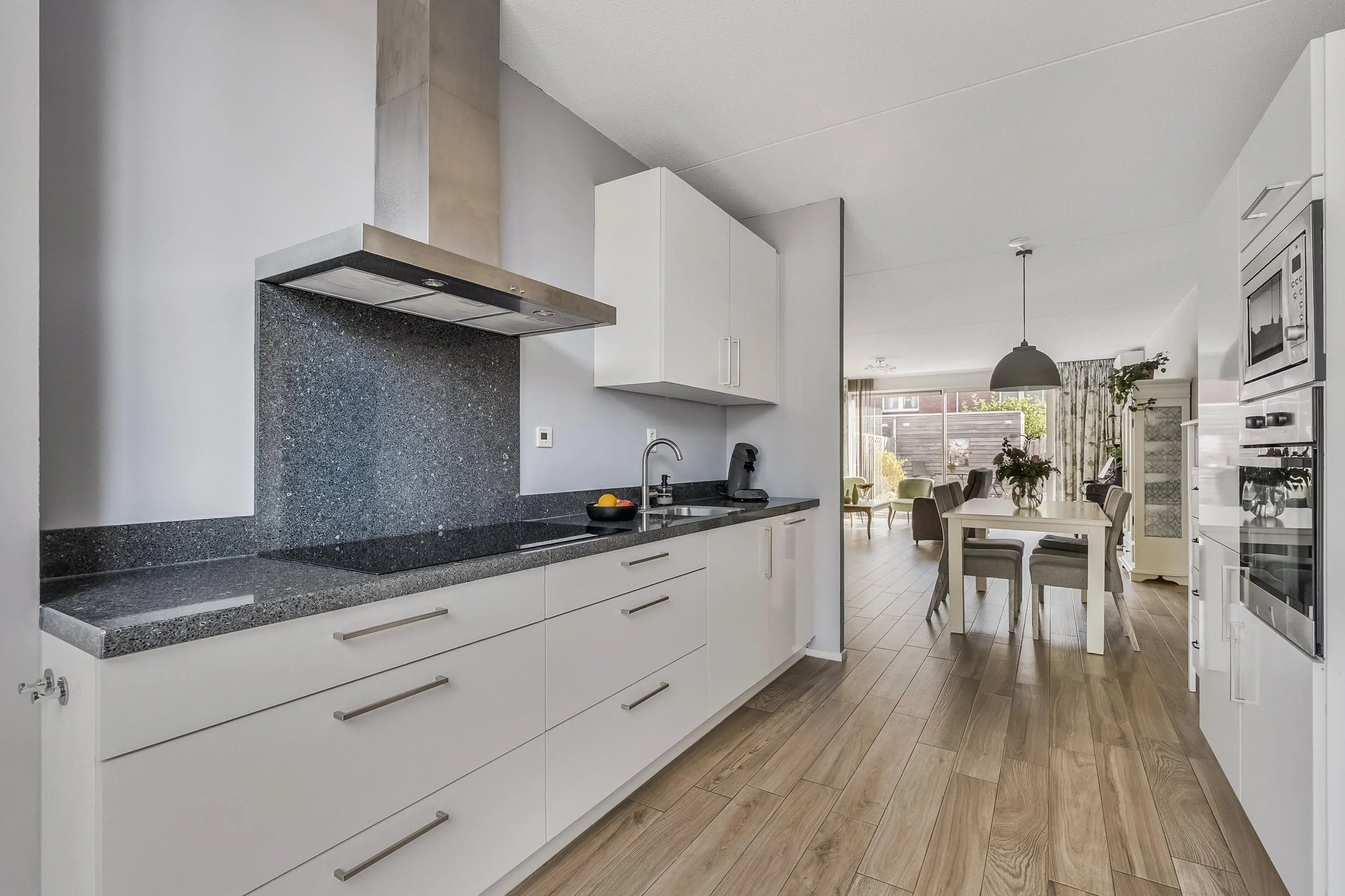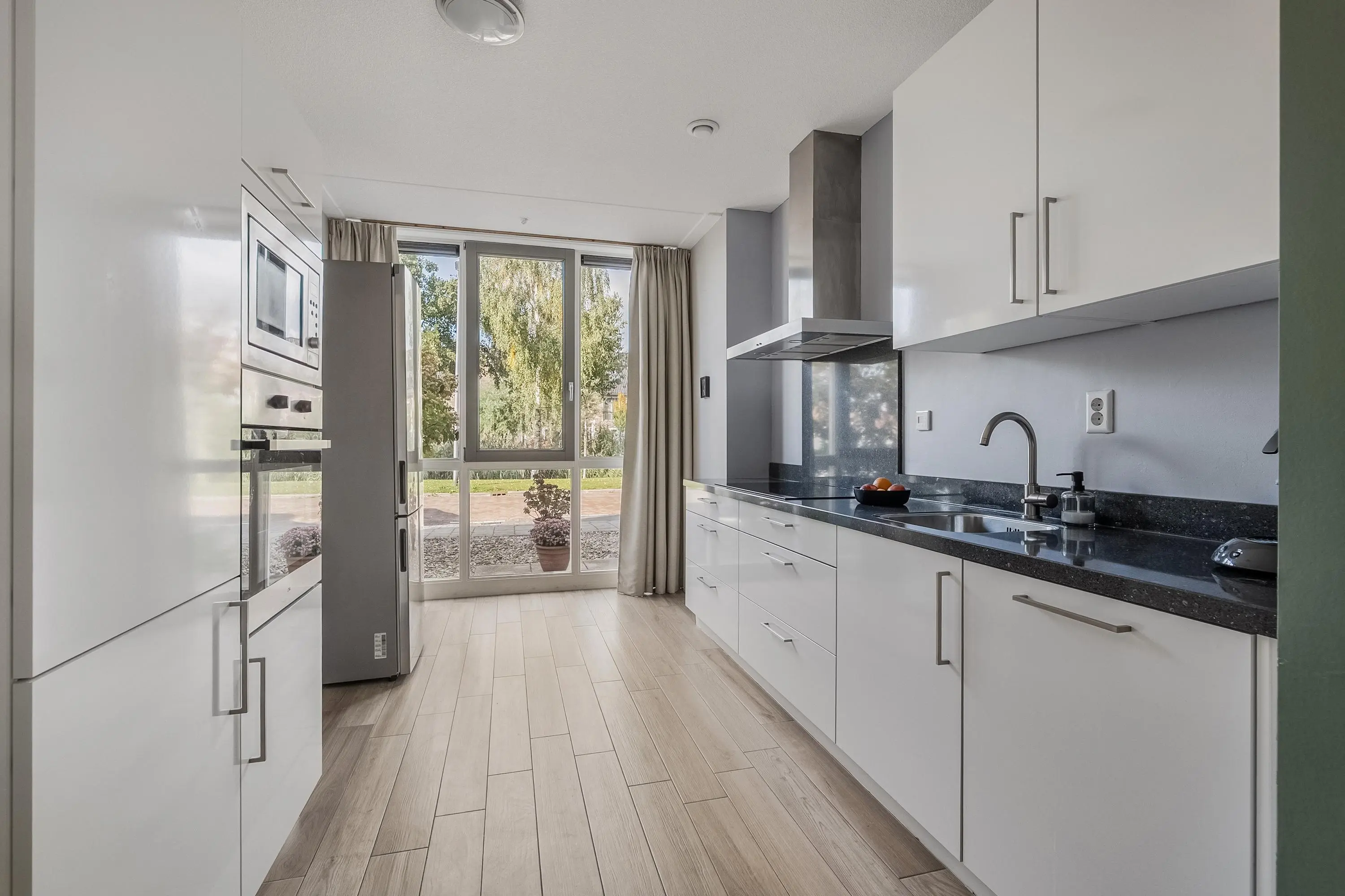 De moderne open keuken (ca. 10 m2) is gelegen aan de voorzijde van de woning en is uitgevoerd in een rechte opstelling met een extra apparatenkast. De keuken is voorzien van diverse apparatuur zoals een vrijstaande koelkast/vrieskast, inductie kookplaat (2022), RVS afzuigkap, oven, magnetron en een vaatwasser (2024). Verder is de keuken voorzien van een enkele spoelbak, voldoende kastruimte en diepe laden voor de pannen. Dankzij de grote raampartijen aan de voorkant van de woning stroomt het natuurlijke licht overvloedig binnen in de keuken en maakt het koken zeer aangenaam. Het geheel is uitgevoerd in wit en afgewerkt met een zwarte natuurstenen aanrechtblad en keramische parketvloer met vloerverwarming.