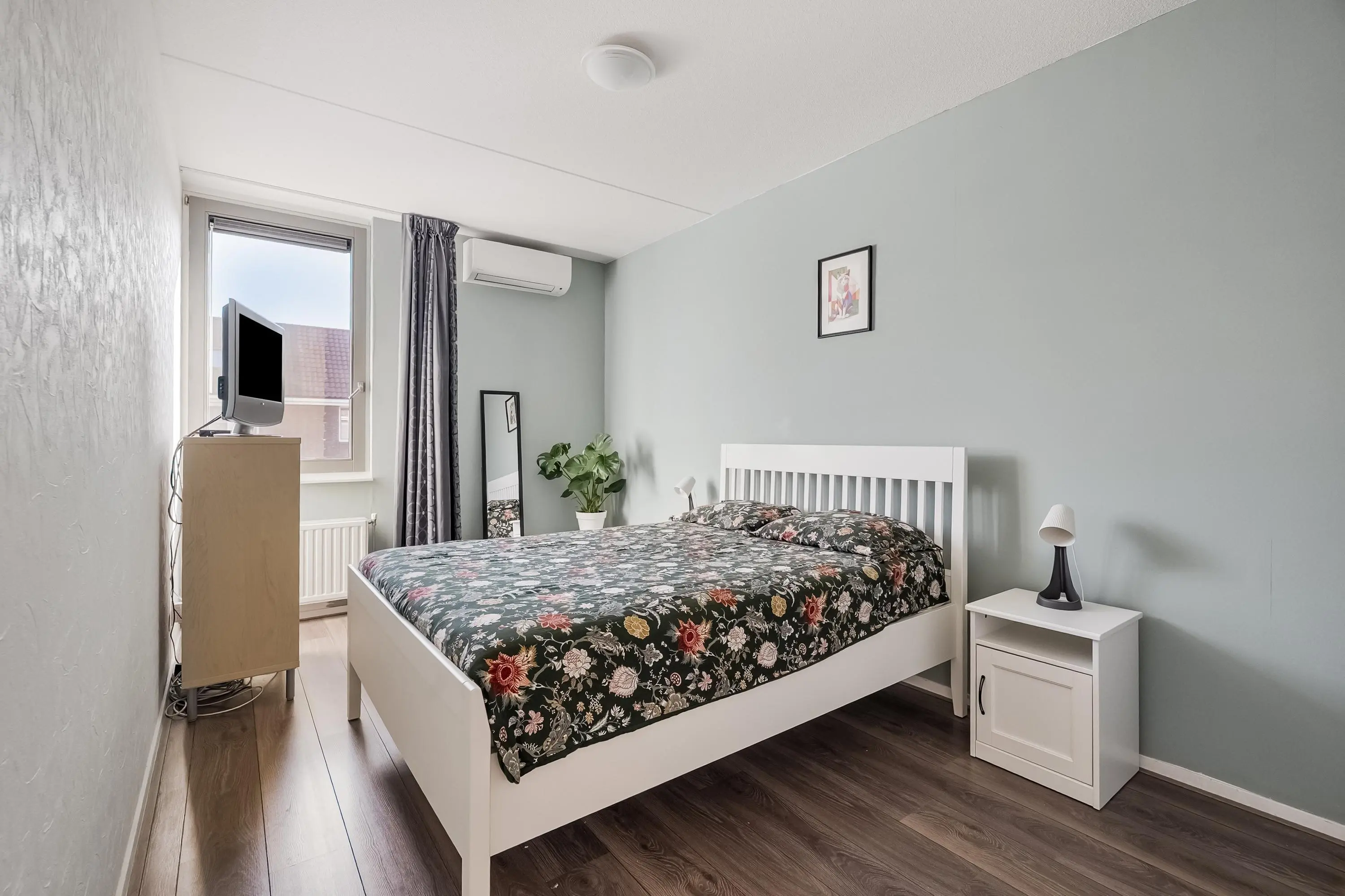 Slaapkamer 1 (ca. 14 m2) is gelegen aan de achterzijde van de woning en beschikt over een airconditioningsysteem dat de kamer verwarmt en koelt. Verder is de kamer voorzien van een hor.