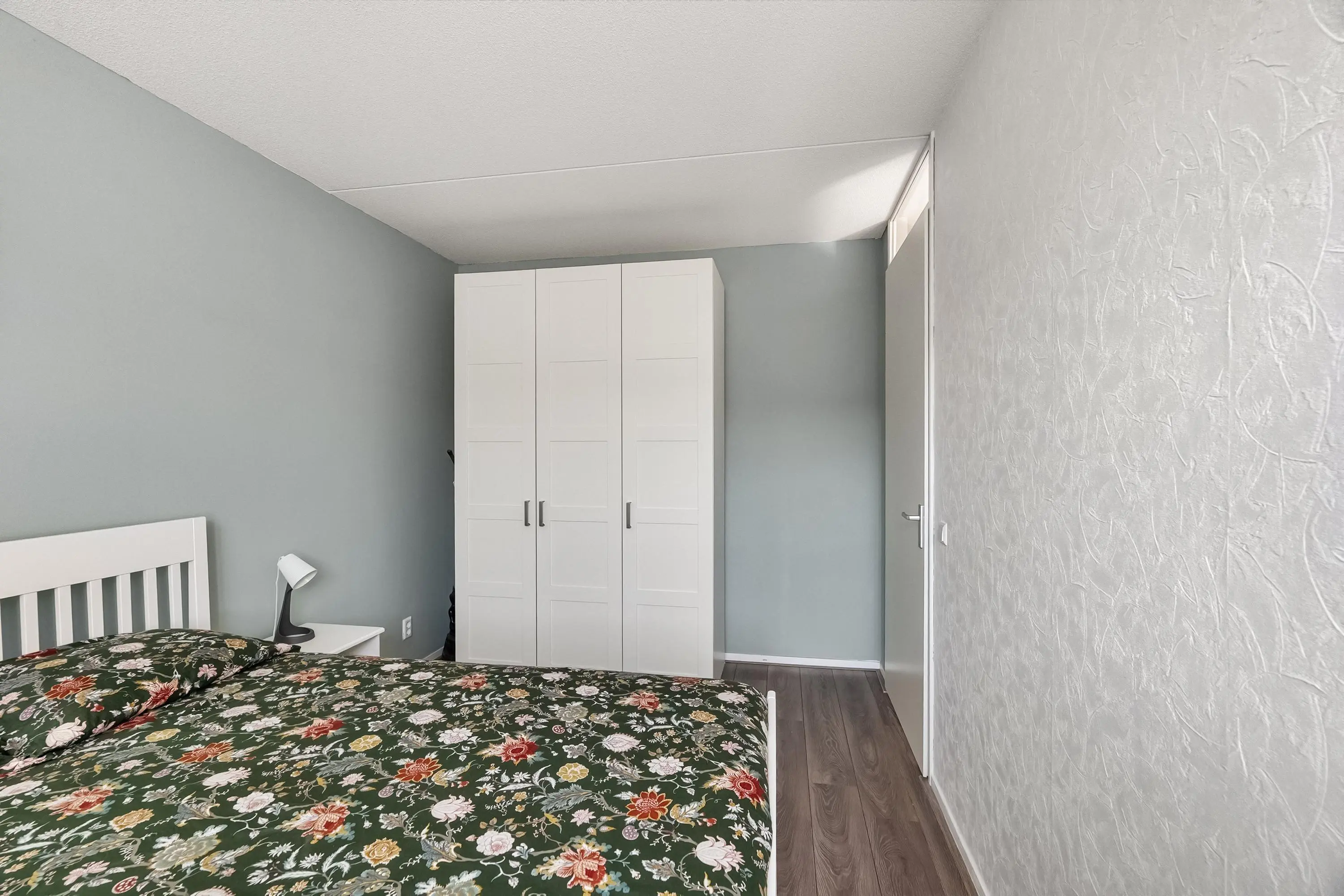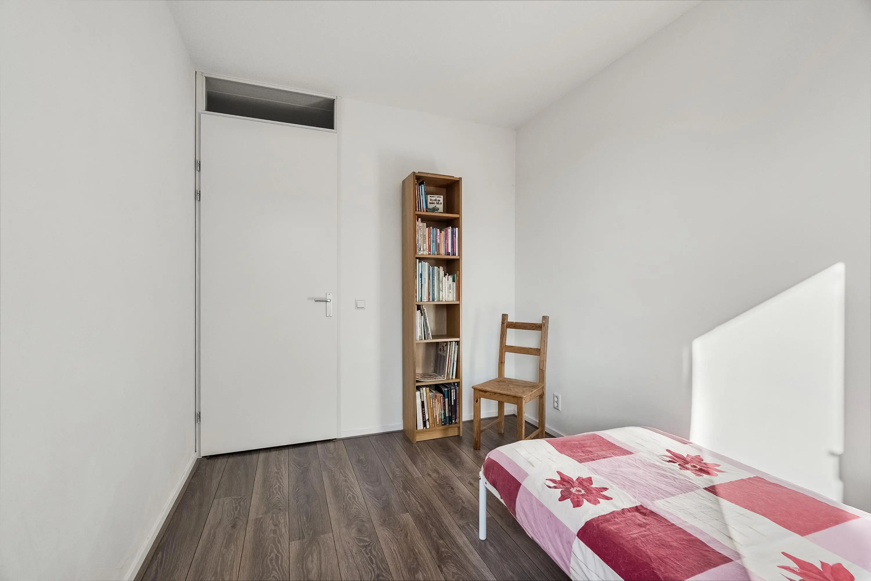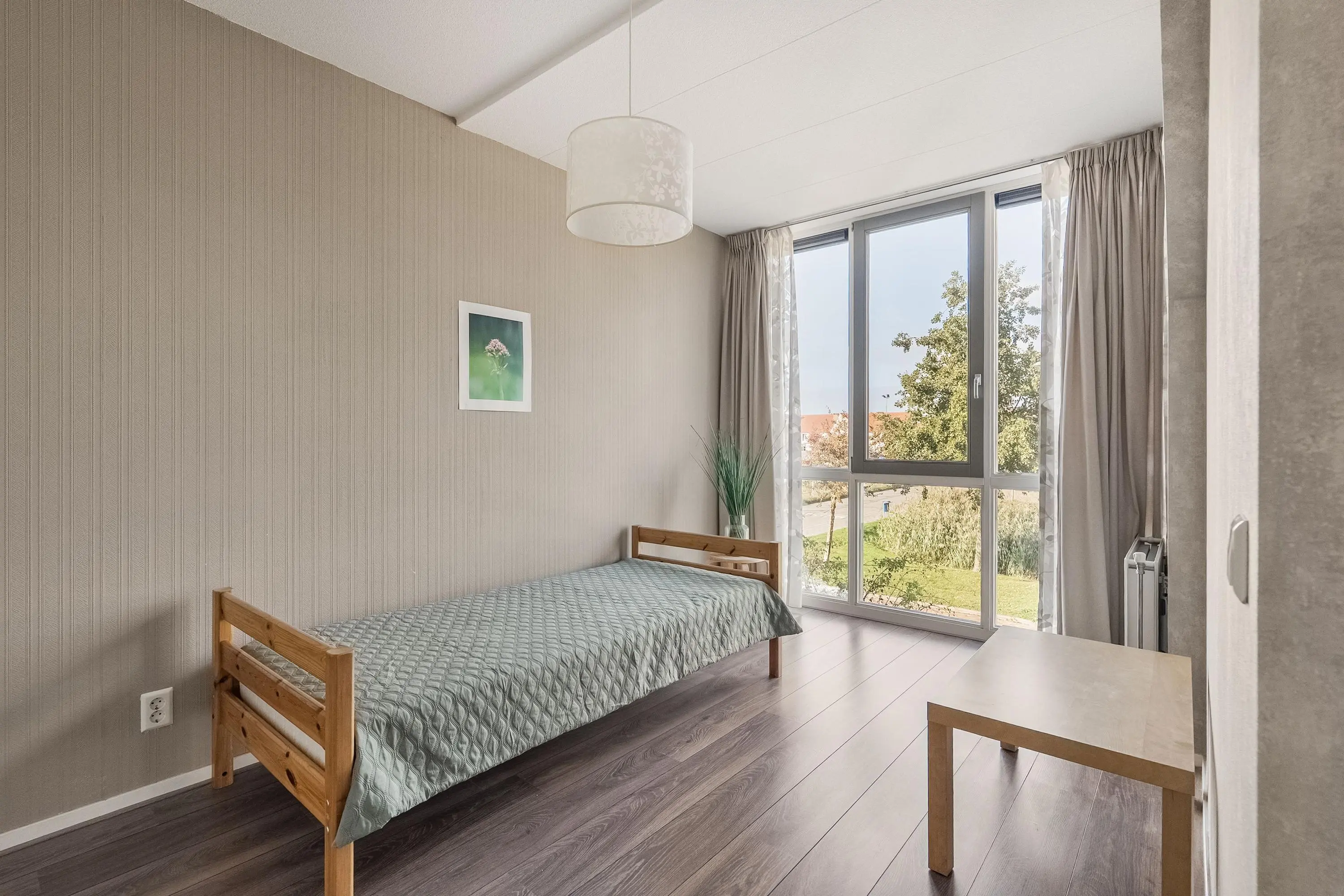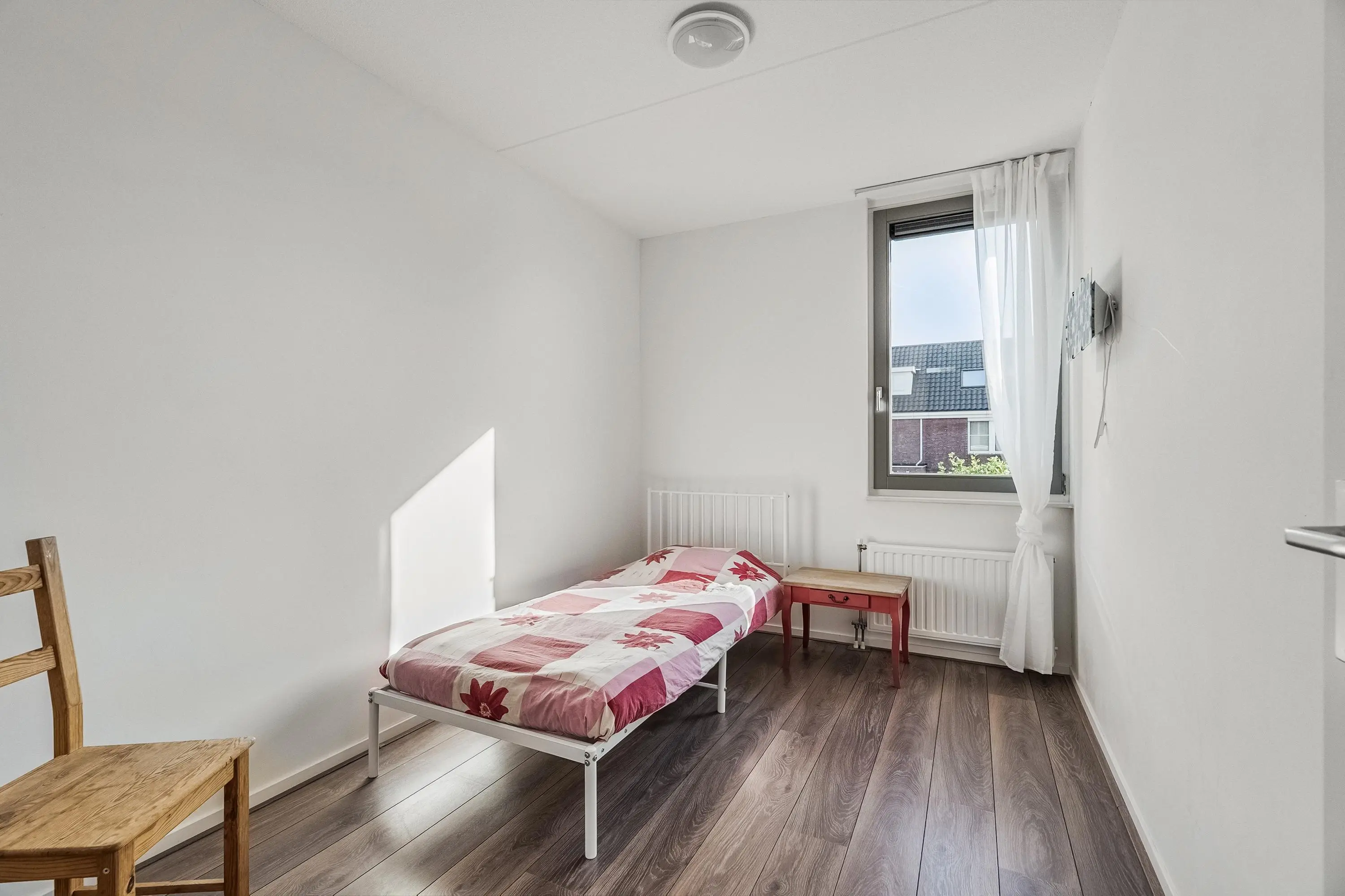 Slaapkamer 2 (ca. 12 m2) is gelegen aan de voorzijde van de woning. Door de grote raampartij biedt deze kamer veel natuurlijke lichtinval.
