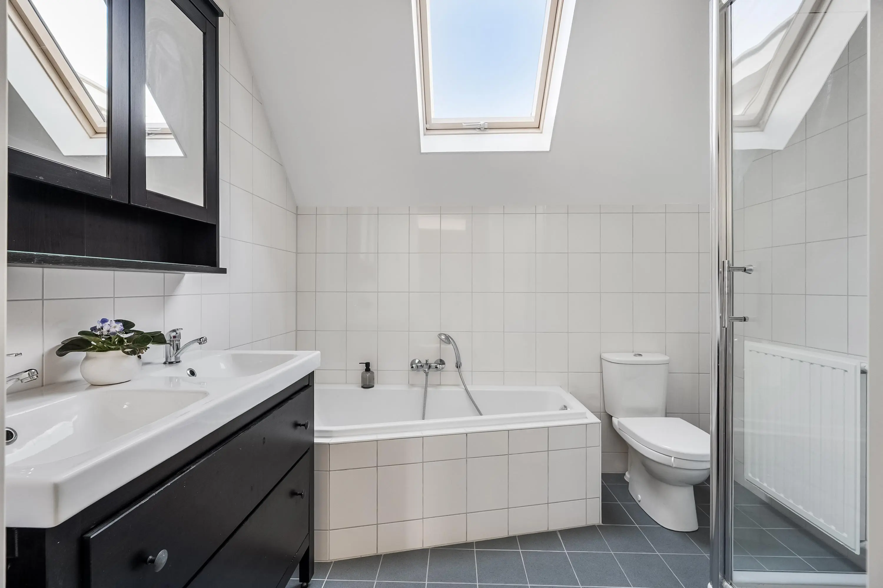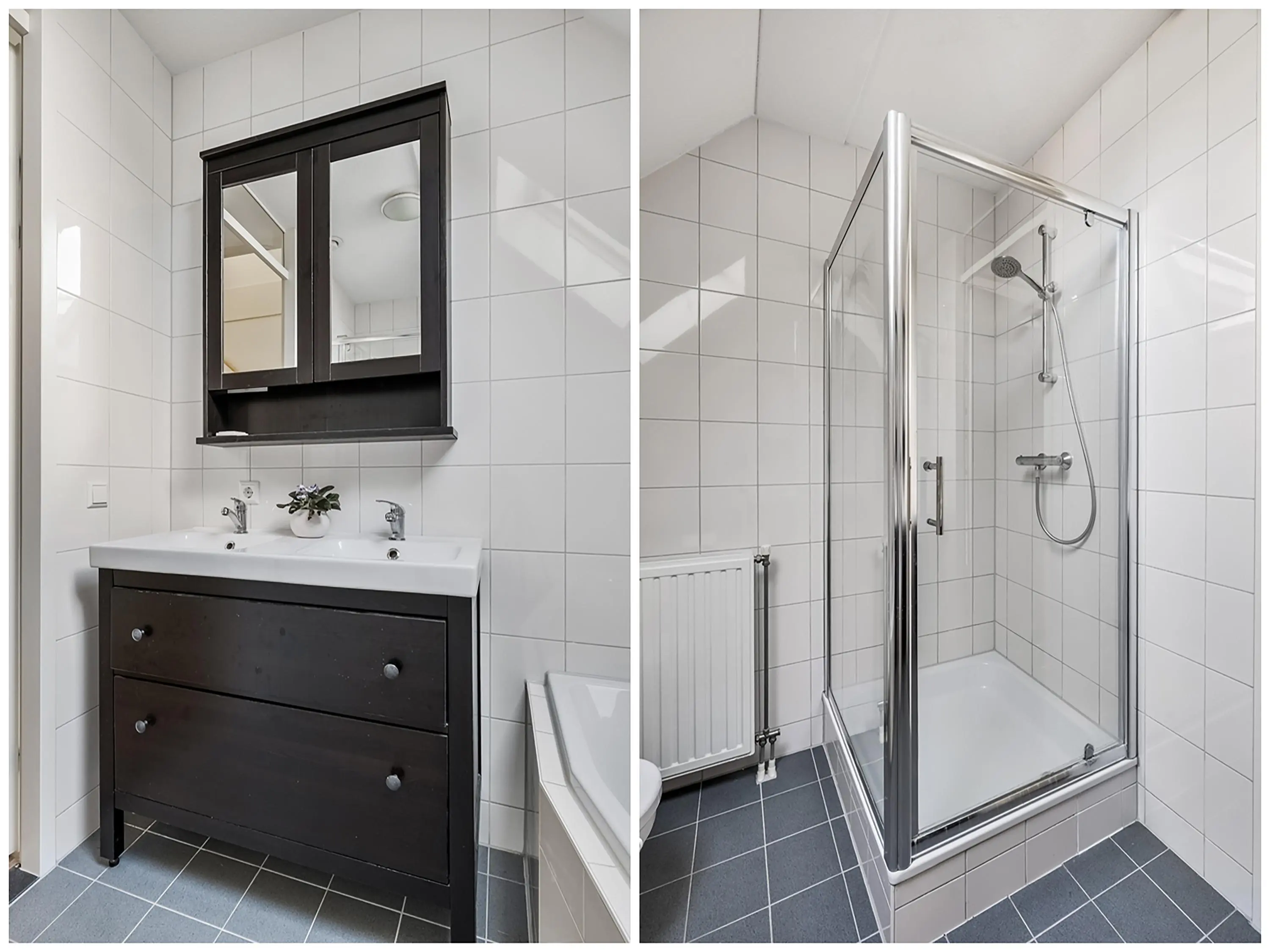 Moderne badkamer (ca. 6 m2) met sanitaire voorzieningen zoals dubbele wastafel met wastafelmeubel, spiegel met spiegelkast en verlichting, het tweede toilet, een ligbad en een douchecabine. De badkamer is geheel betegeld in wit/grijs wand- en vloertegels.