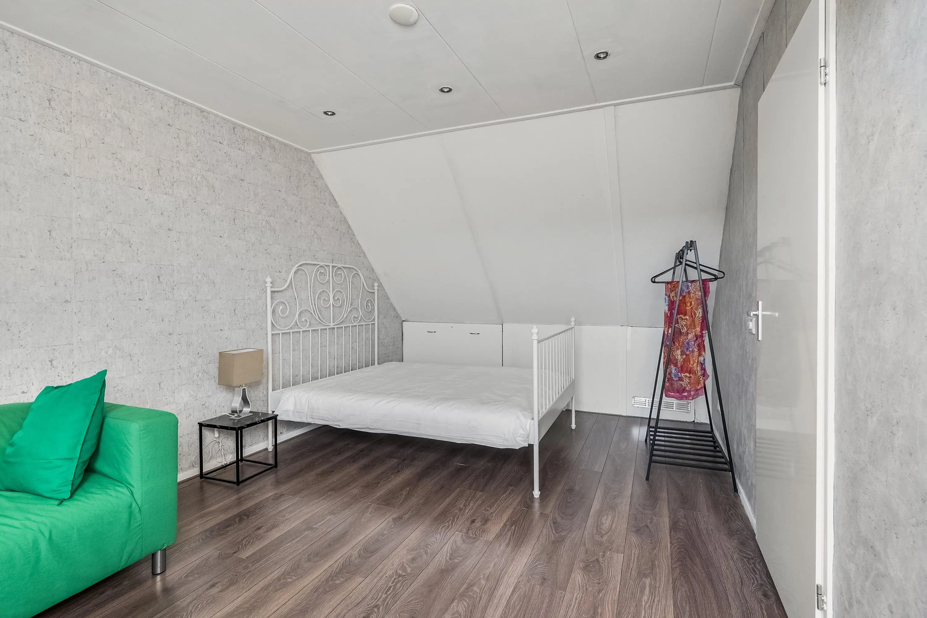 Slaapkamer 4 (ca. 15 m2) is voorzien van een dakraam, laminaatvloer, spotjes en bergruimte achter het knieschot.