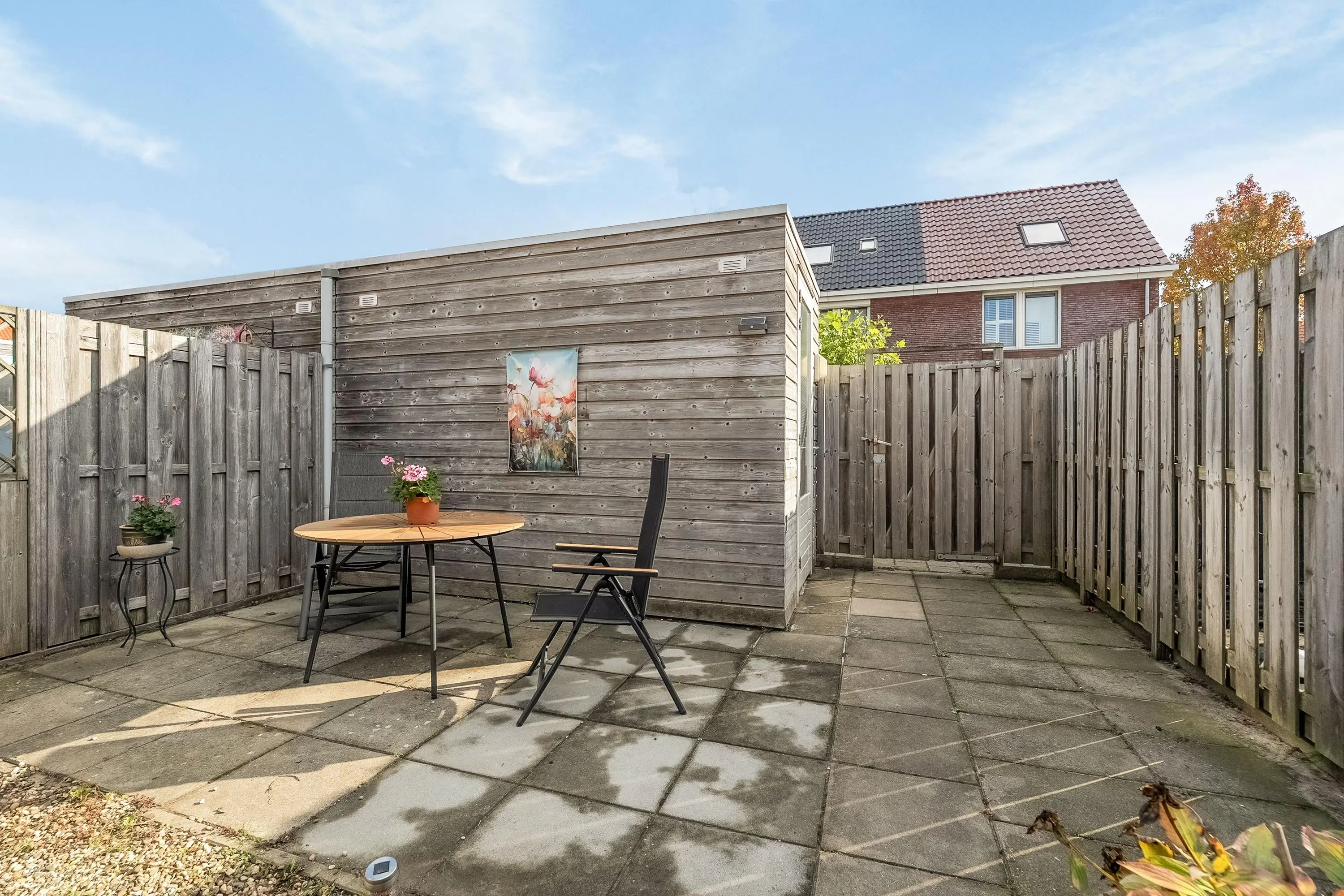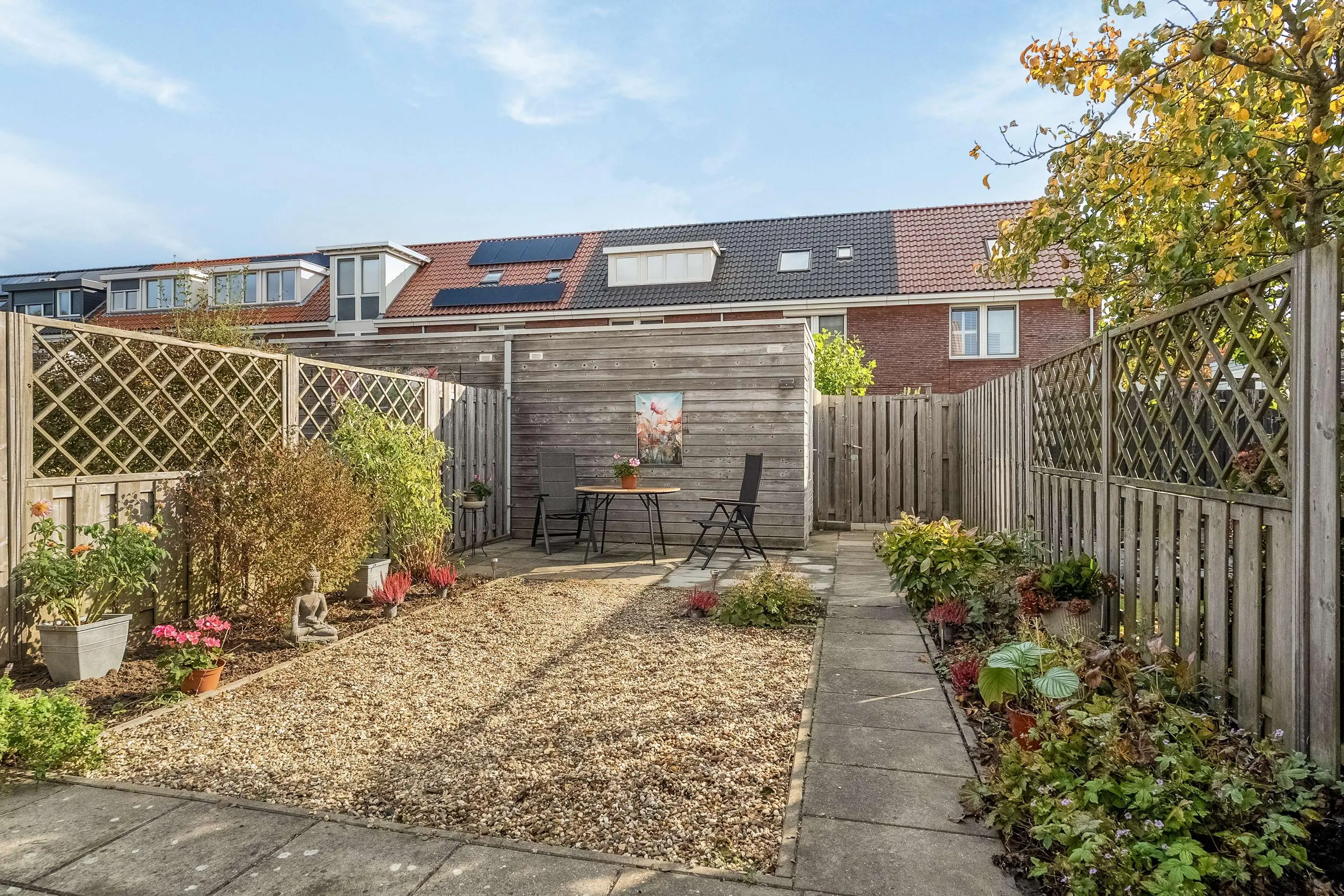 De diepe achtertuin is gelegen op het oosten en biedt een perfecte balans tussen zon en schaduw door de dag. Verder beschikt de achtertuin over bestrating, beplanting, achterom, buitenkraan en een ruime berging.