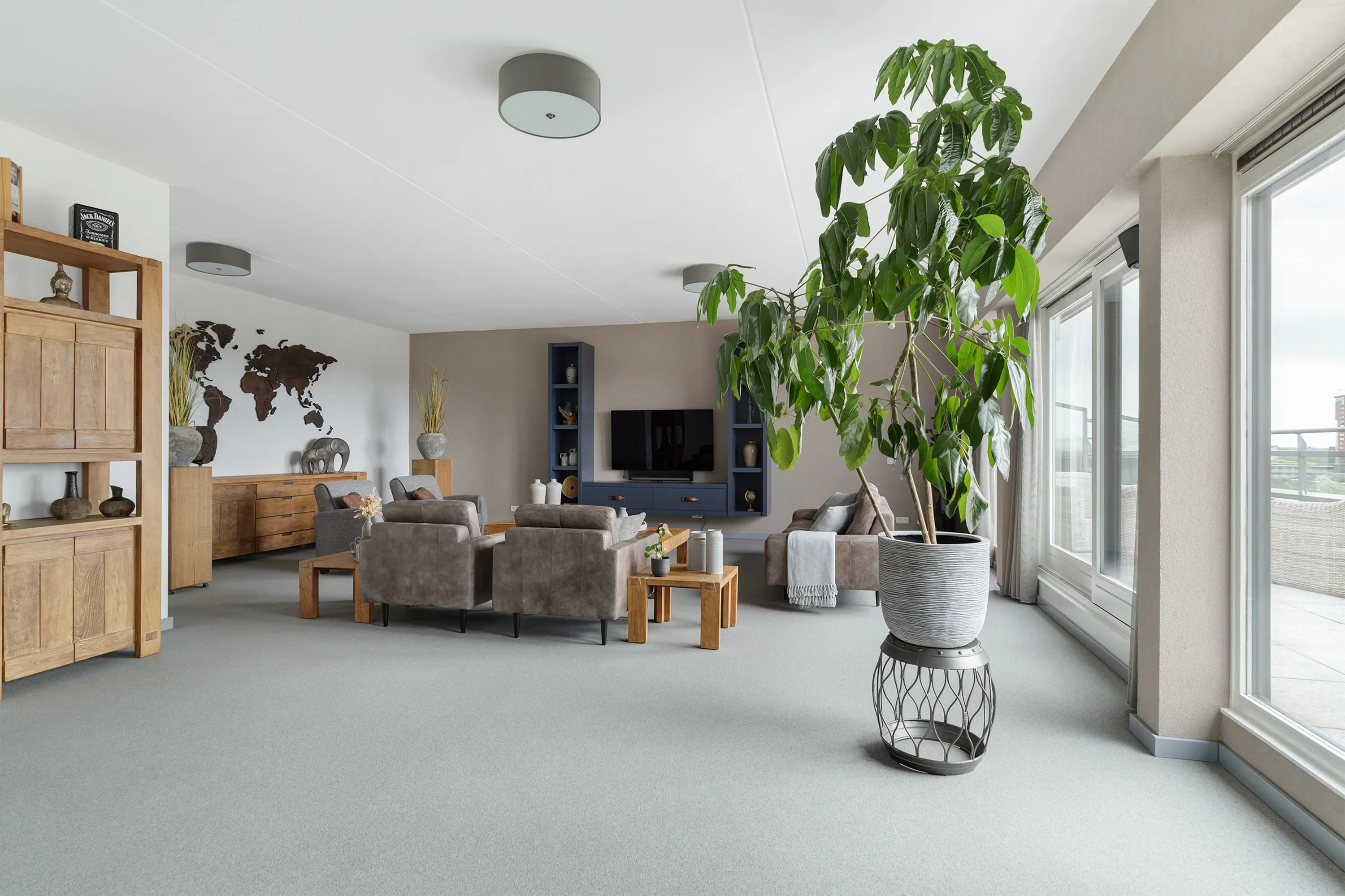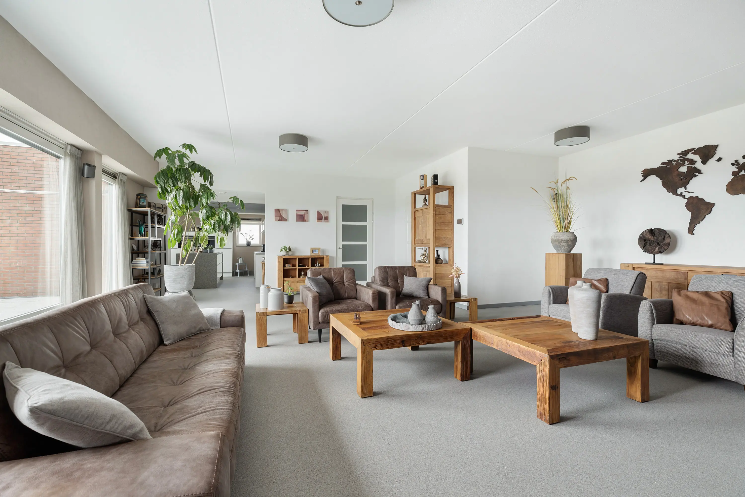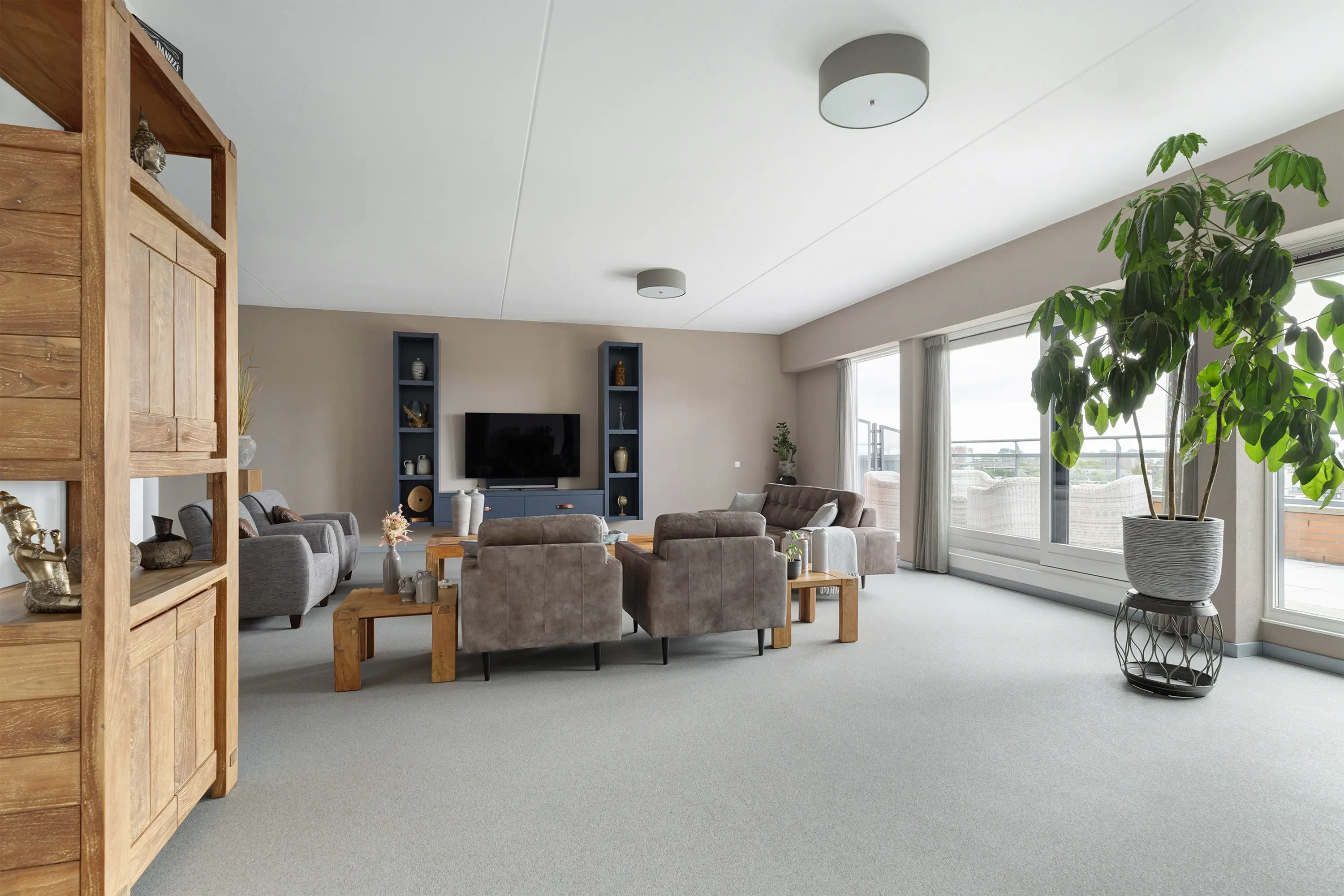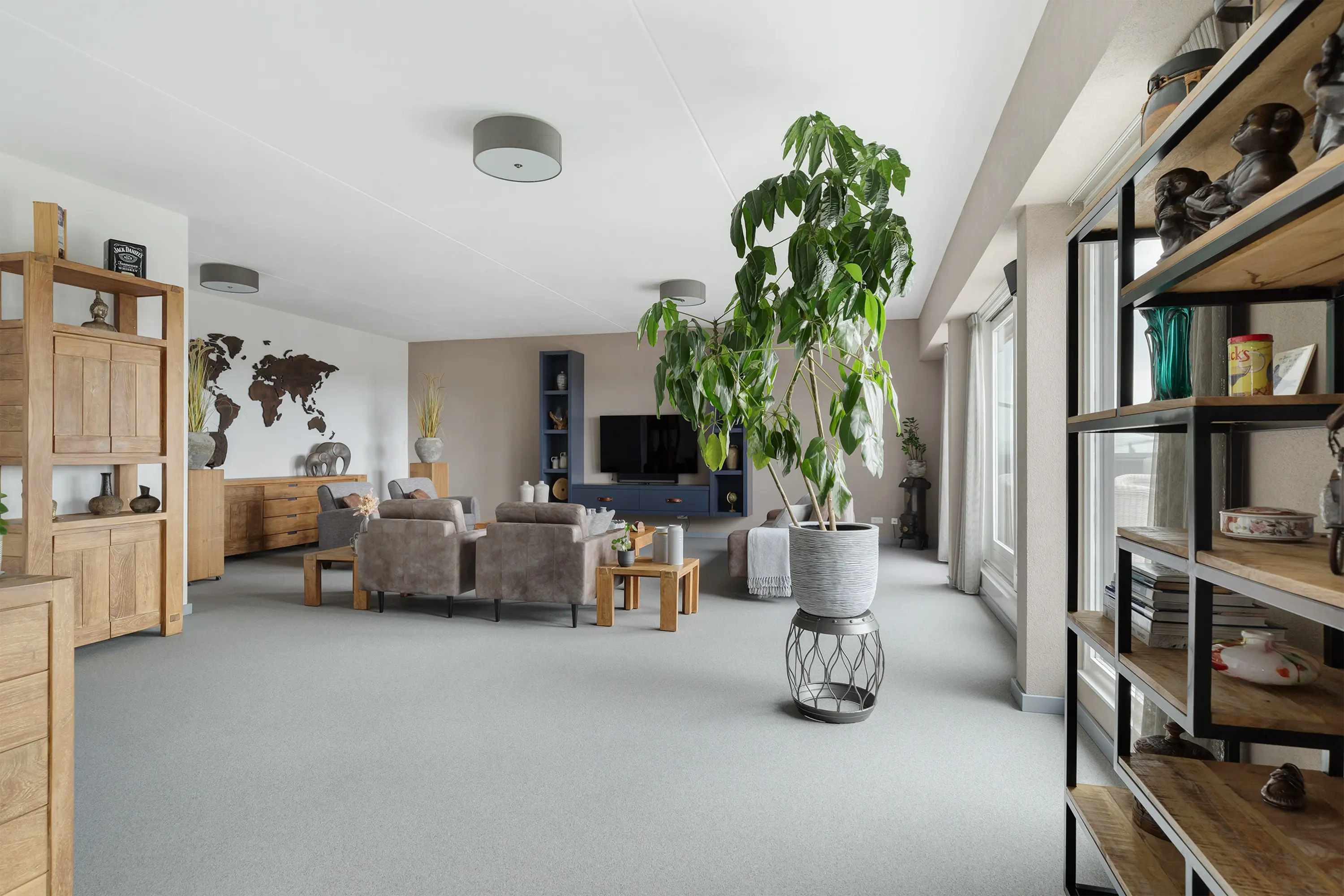 De woonkamer van bijna 70 m² is een echte eyecatcher: royaal van opzet met meer dan genoeg ruimte voor een riante zithoek en zelfs een werk- of leeshoek. Wat direct opvalt, is de enorme hoeveelheid licht die binnenvalt via de brede raampartijen over de volledige breedte van de ruimte. Hierdoor voelt het geheel niet alleen ruim, maar ook bijzonder licht en aangenaam aan.