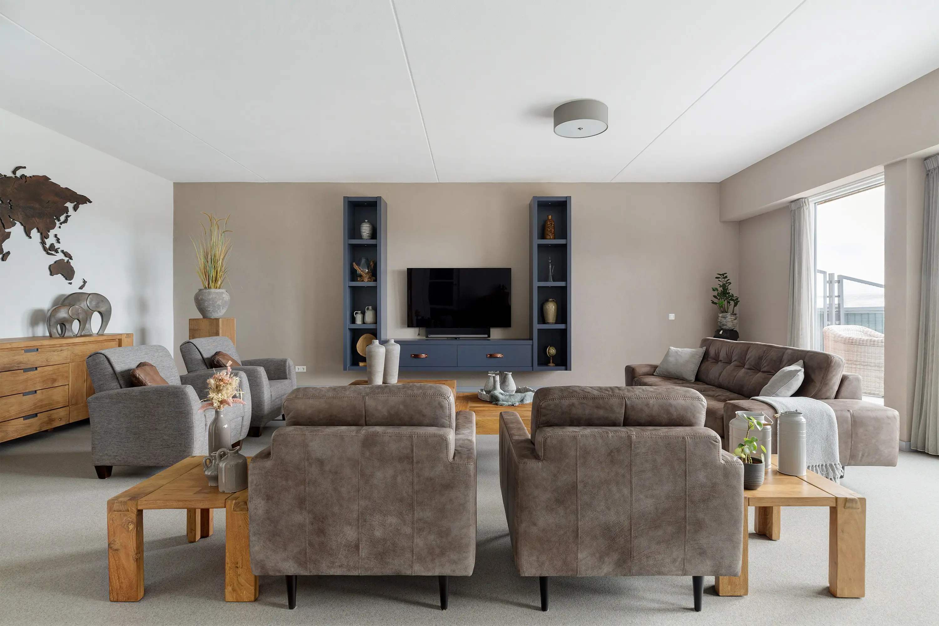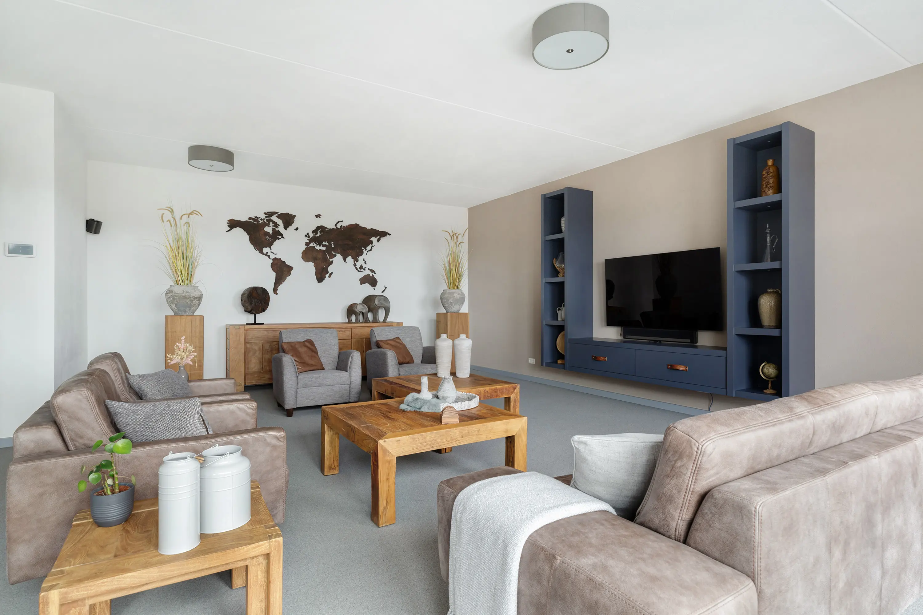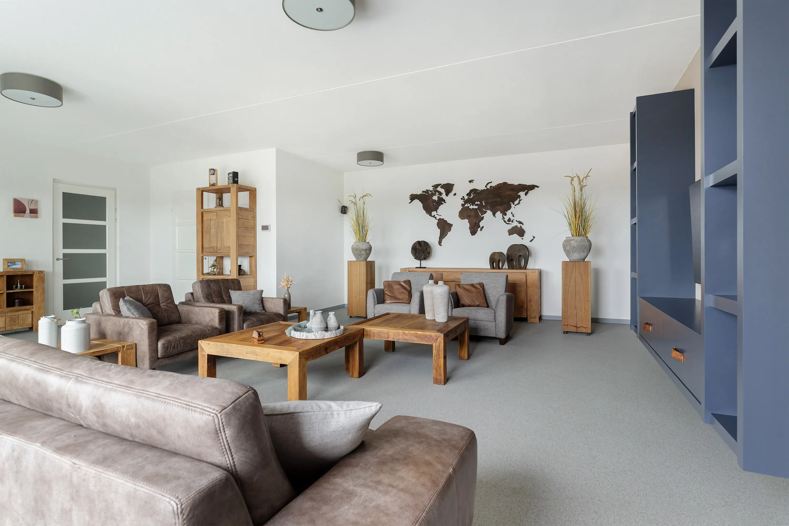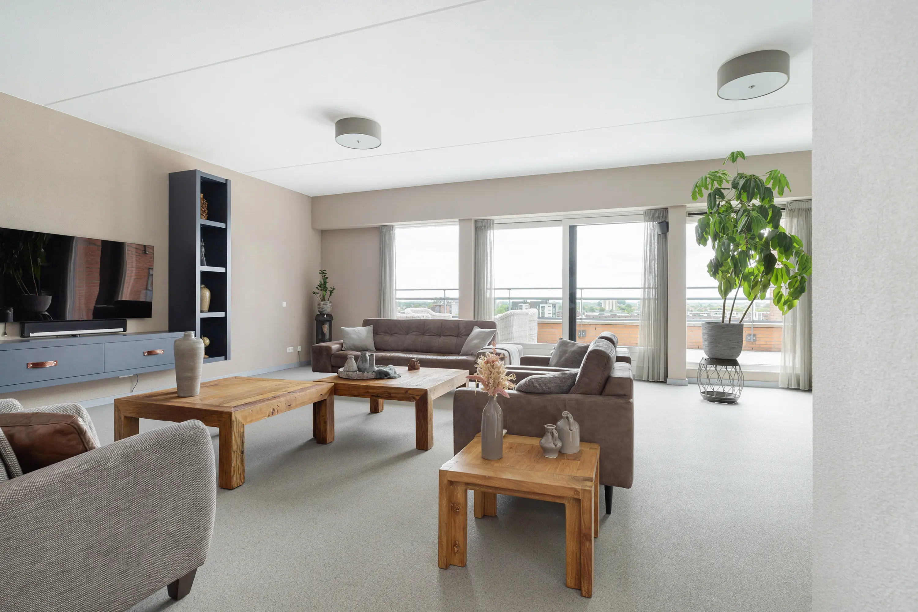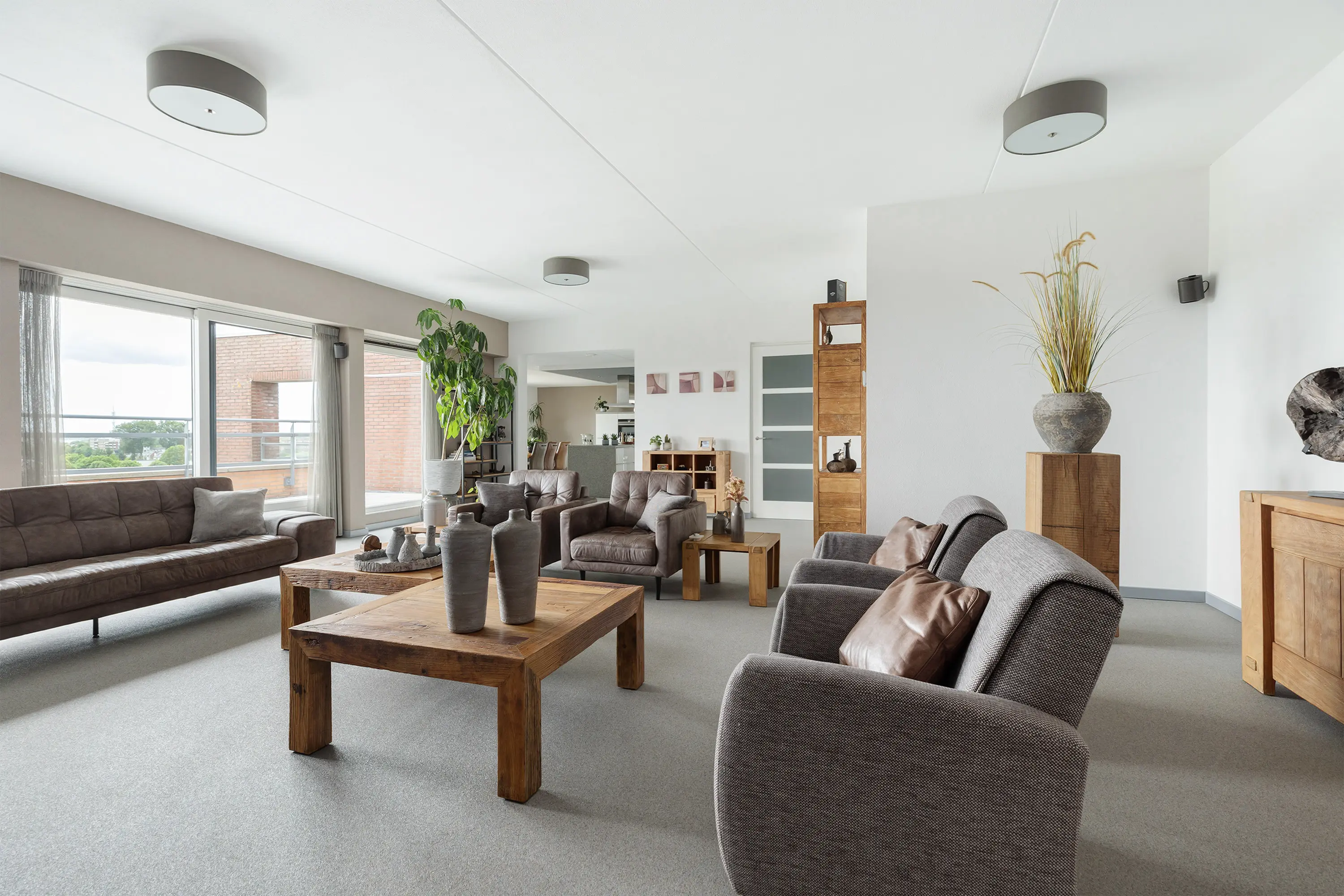 De woonkamer van bijna 70 m² is een echte eyecatcher: royaal van opzet met meer dan genoeg ruimte voor een riante zithoek en zelfs een werk- of leeshoek. Wat direct opvalt, is de enorme hoeveelheid licht die binnenvalt via de brede raampartijen over de volledige breedte van de ruimte. Hierdoor voelt het geheel niet alleen ruim, maar ook bijzonder licht en aangenaam aan.