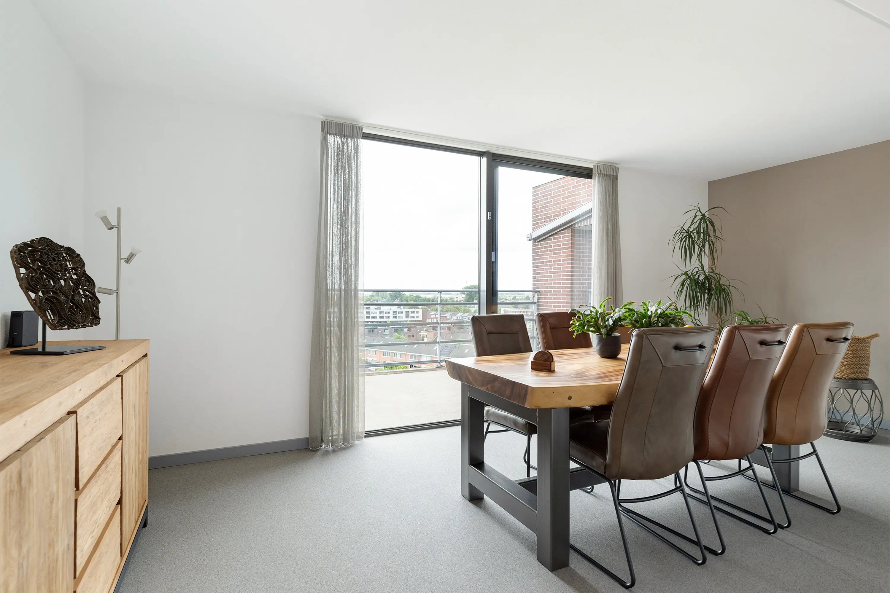 Op dit moment staat er een eettafel voor zes personen maar de ruimte is royaal genoeg om met gemak een tafel voor acht tot zelfs tien personen te plaatsen. Ideaal voor wie graag uitgebreid dineert of gasten ontvangt.