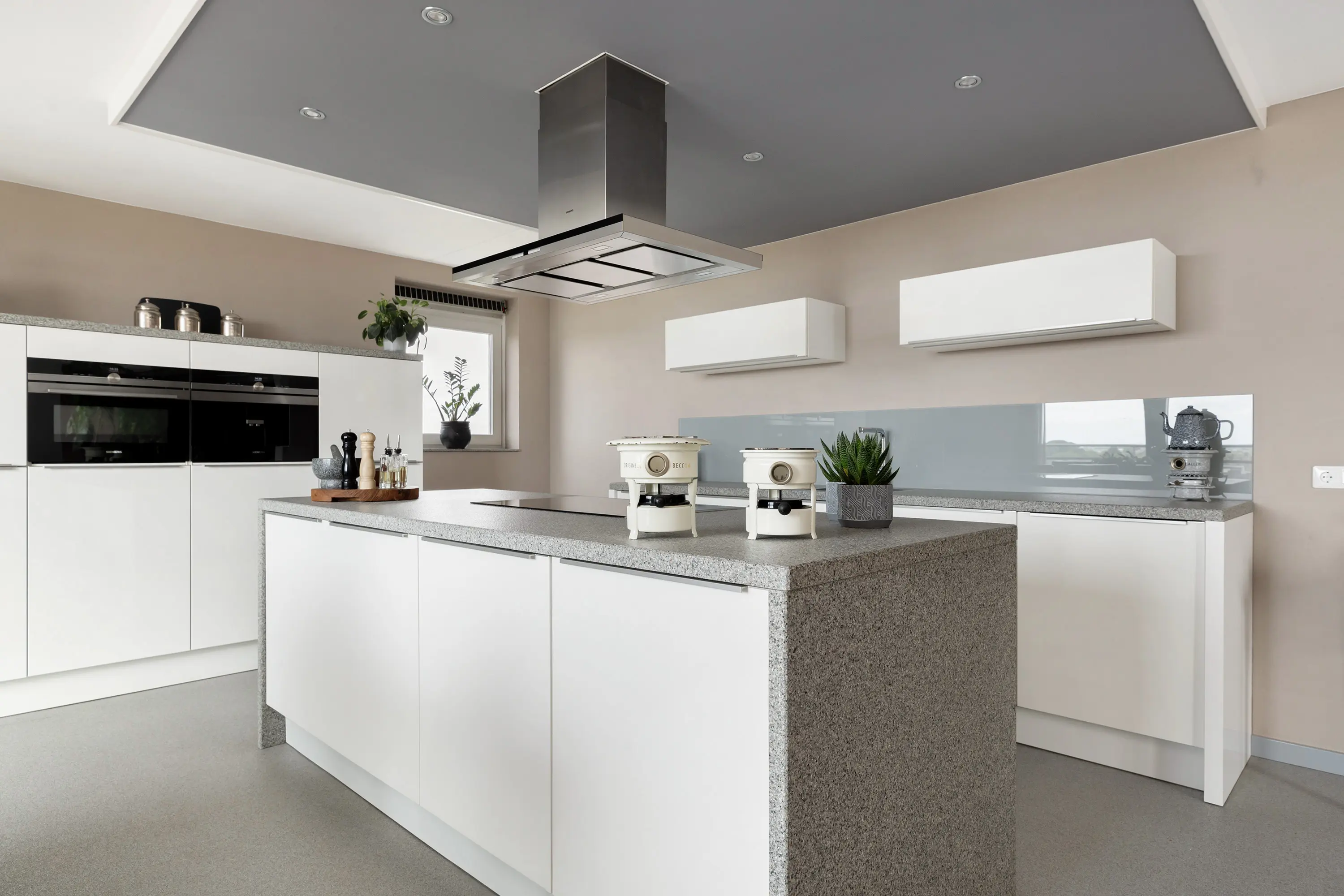 De afwerking is hoogwaardig met witte kastfronten en een grijs granieten aanrechtblad dat zorgt voor een tijdloze, luxe uitstraling. Uiteraard zijn alle laden voorzien van softclose-systeem, wat het comfort en gebruiksgemak nog verder vergroot.