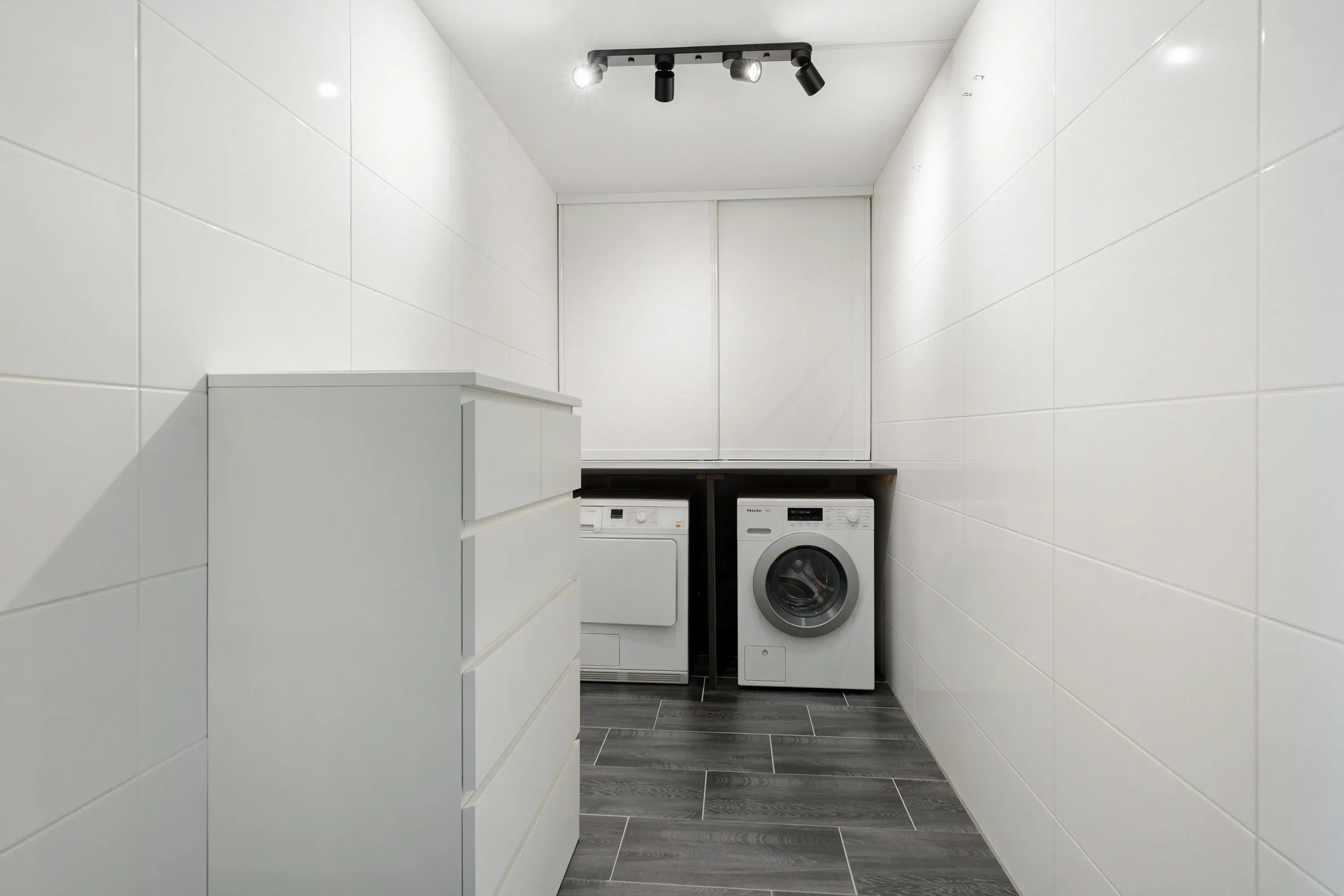 Er is een praktische wasruimte gecreëerd, voorzien van aansluitingen voor zowel een wasmachine als een droger. De wanden zijn wit betegeld, wat zorgt voor een frisse en schone uitstraling. De vloer is afgewerkt met antracietkleurige tegels, die een mooi contrast bieden en de ruimte een moderne uitstraling geven. Zo verloopt het wassen en drogen van kleding eenvoudig en efficiënt.