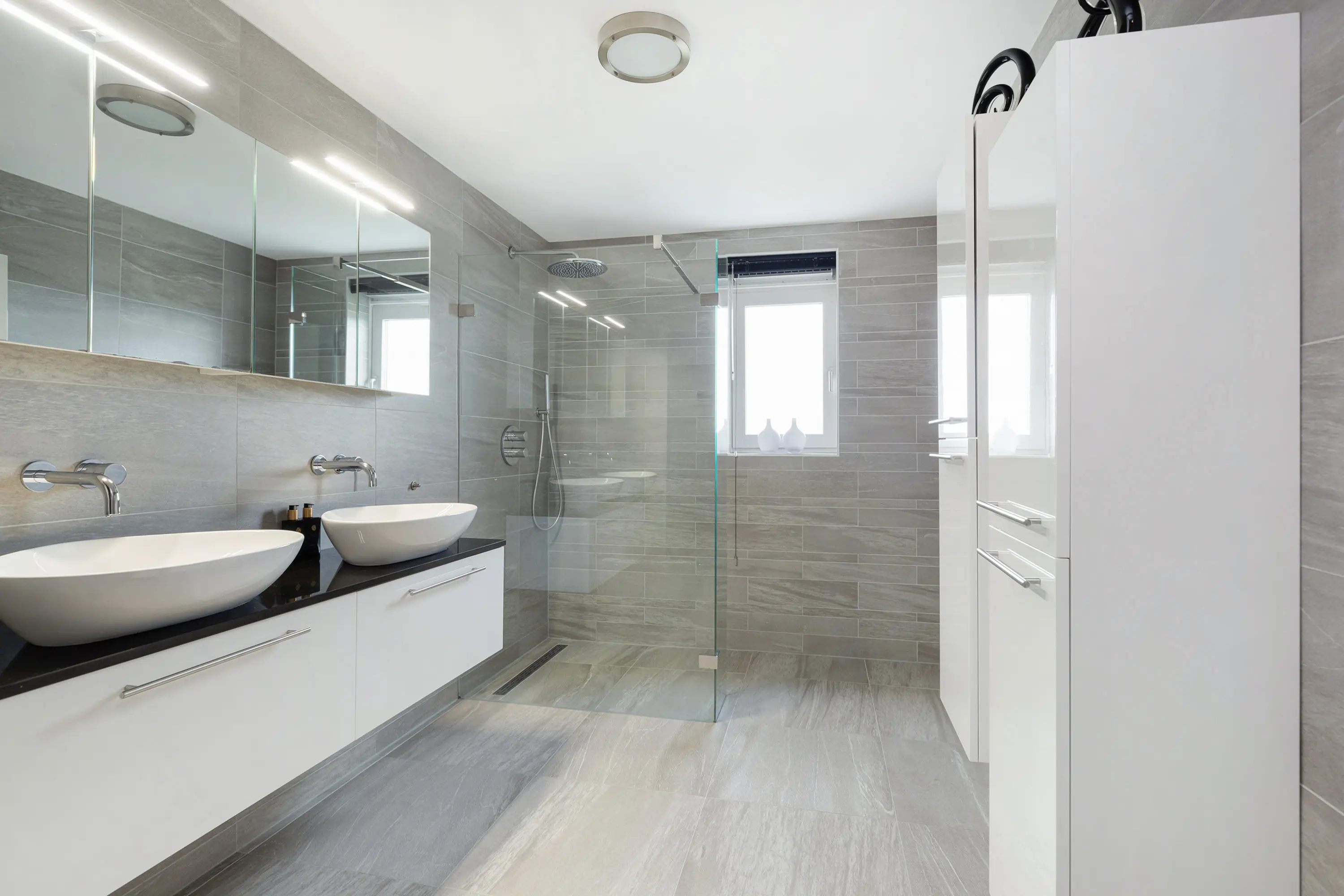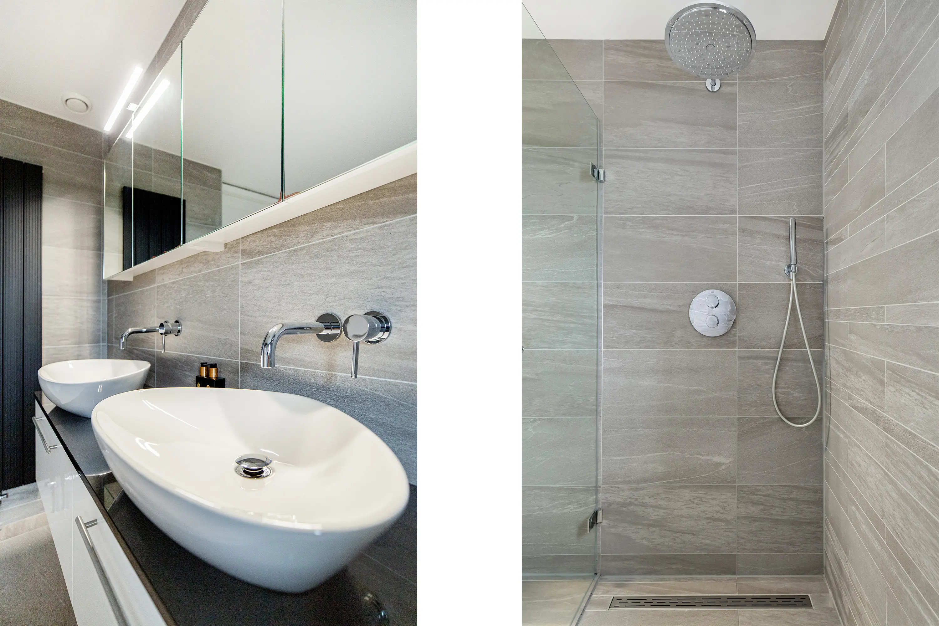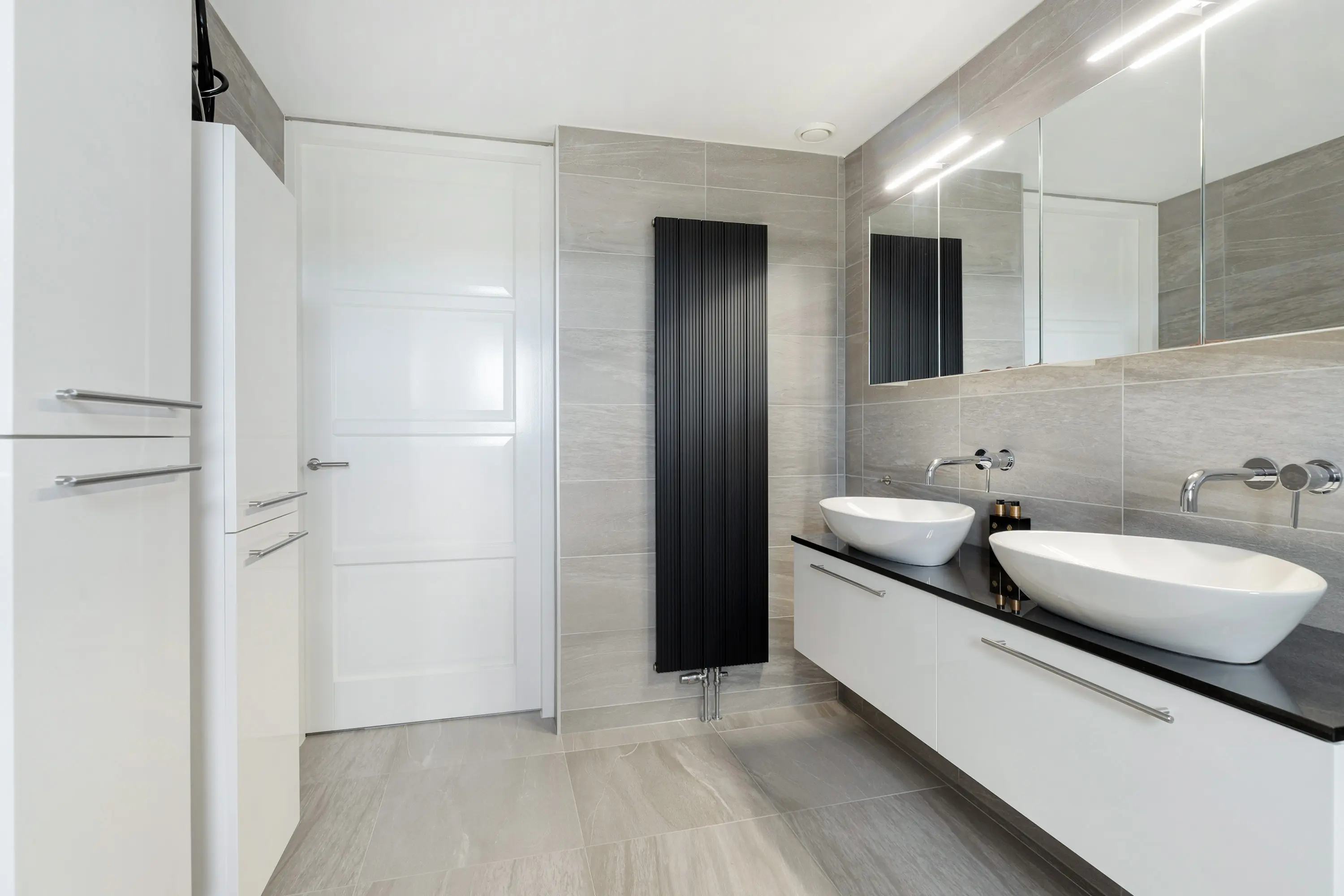 De badkamer, vernieuwd in 2015, is uitgerust met een brede wastafel met twee witte waskommen en bijpassende witte kasten. Het zwarte wastafelblad zorgt voor een stijlvol contrast en geeft de ruimte een moderne uitstraling. Verder beschikt de badkamer over een ruime inloopdouche, mechanische ventilatie en een raam dat zorgt voor extra natuurlijk licht. Een zwarte designradiator maakt het geheel compleet en voegt een eigentijds accent toe. De taupekleurige tegels zorgen voor een warme en sfeervolle ambiance.