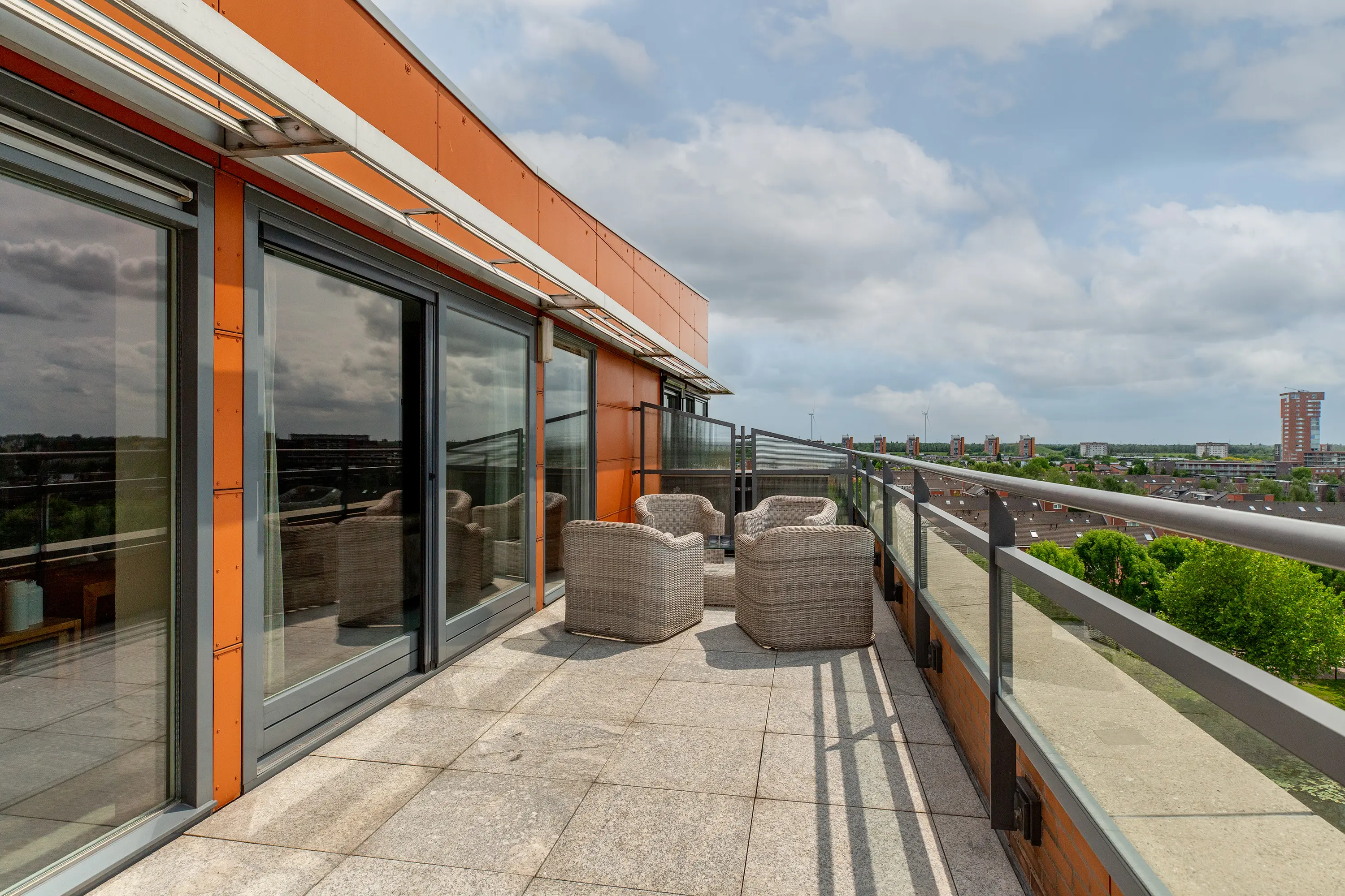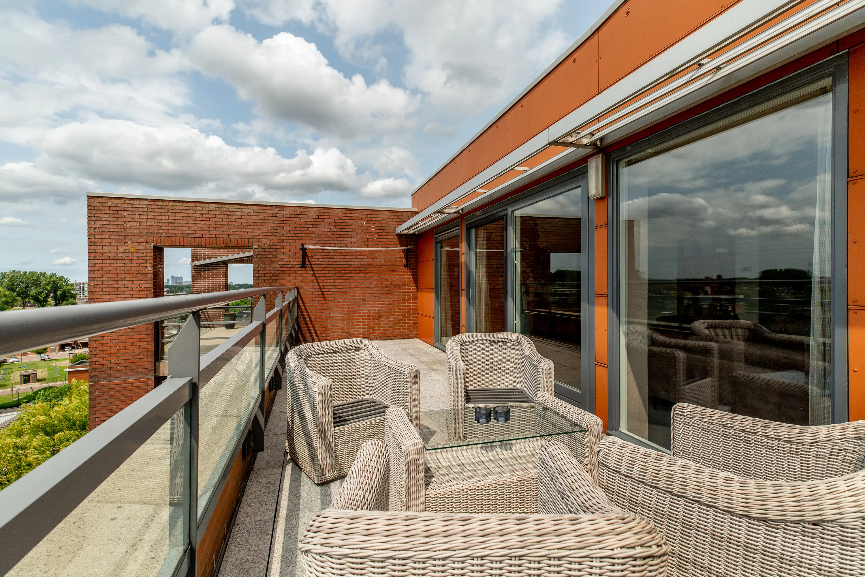 Vanuit de keuken heeft u direct toegang tot het tweede terras van 16 m², met dezelfde gunstige zuidwestelijke ligging en datzelfde prachtige uitzicht over het groen, de wijk én richting de skyline van Rotterdam. Een unieke plek waar u in alle rust kunt genieten van zowel de zon als het uitzicht.