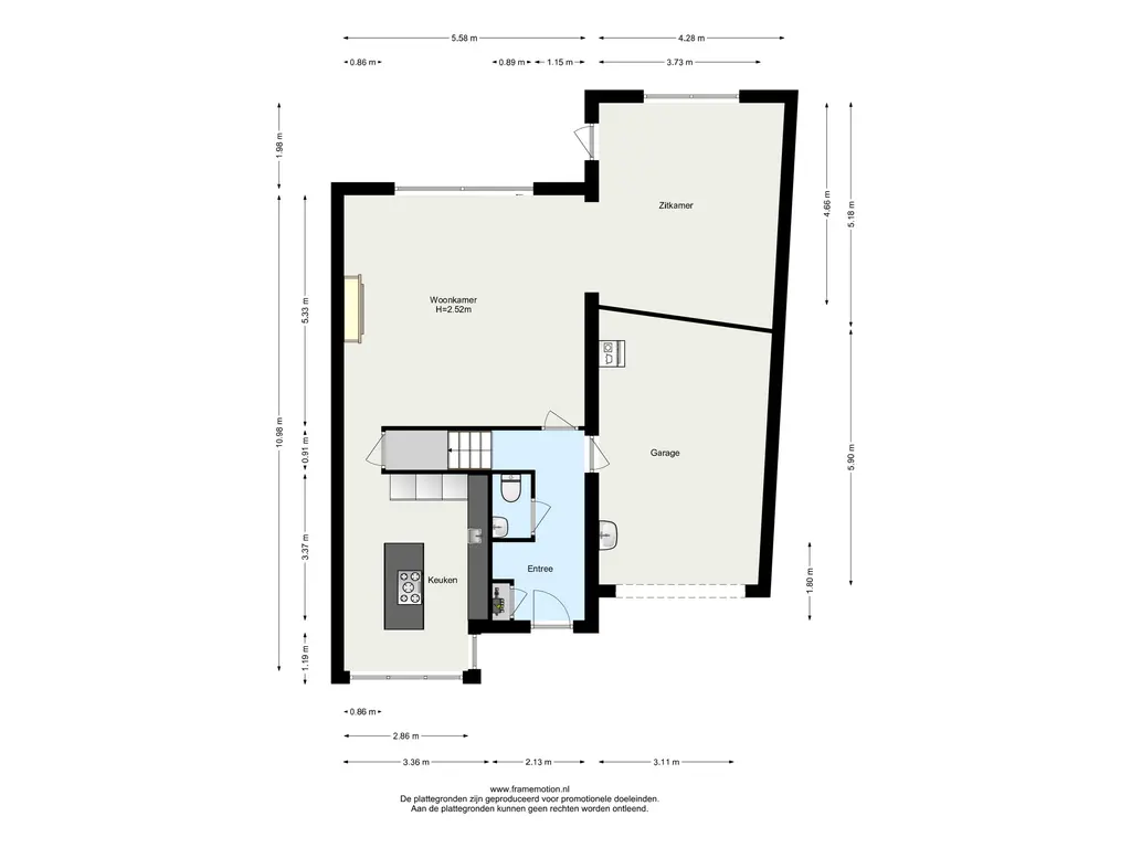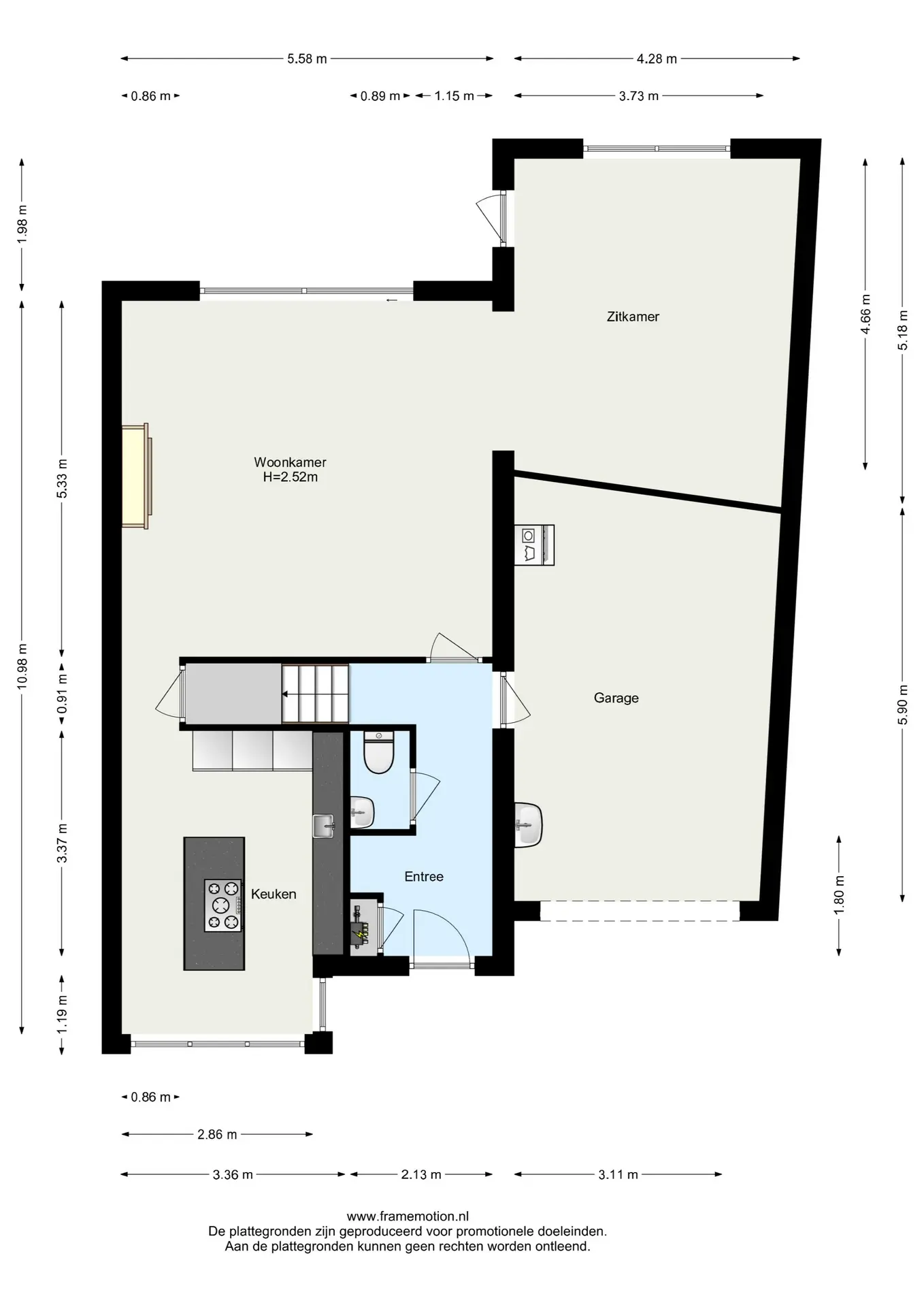 U betreedt de woning via de ruime hal met garderobe, meterkast en modern toilet. Vanuit hier heeft u toegang tot de aangebouwde garage met aansluiting voor wasmachine, droger en een vaste wastafel.