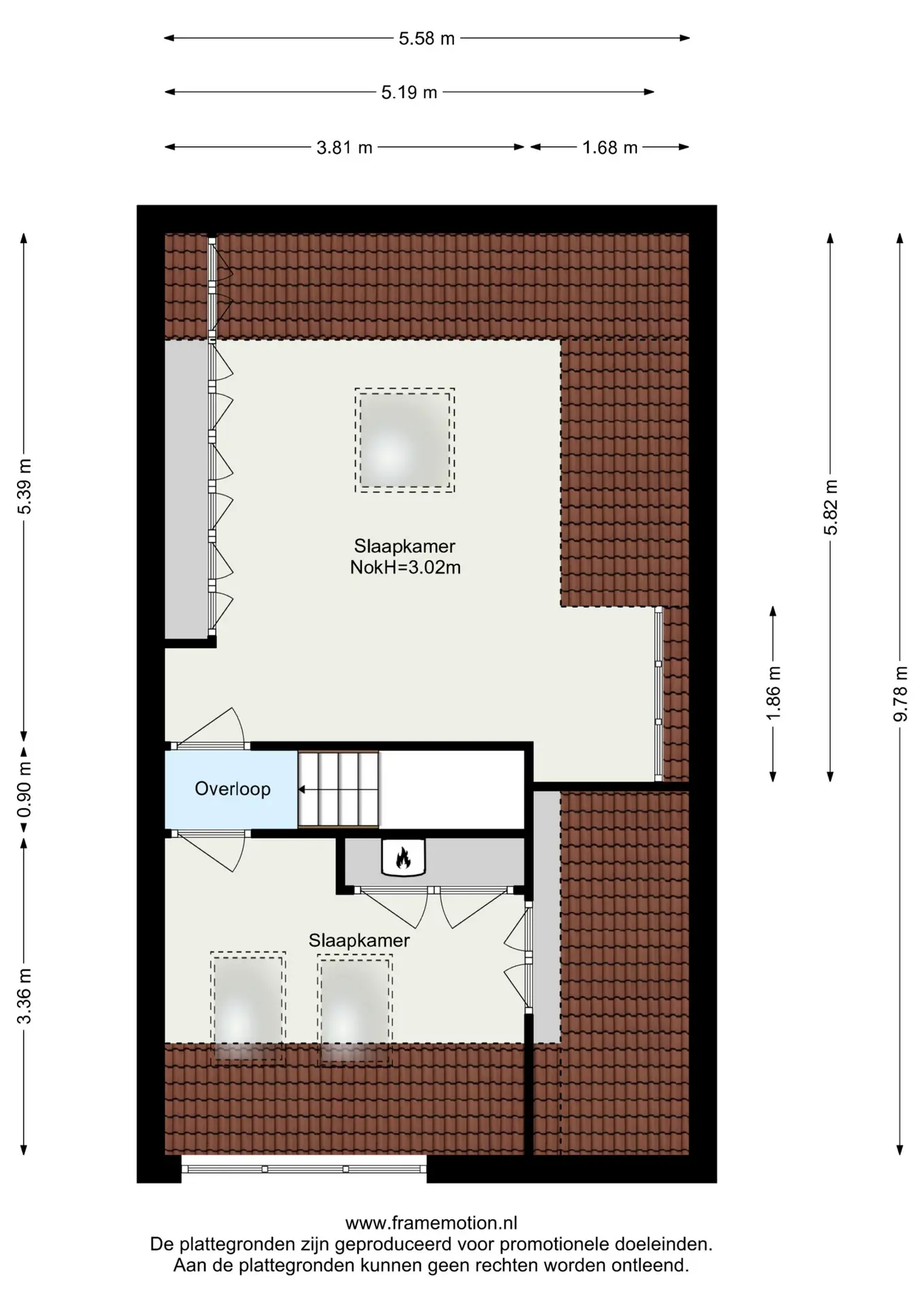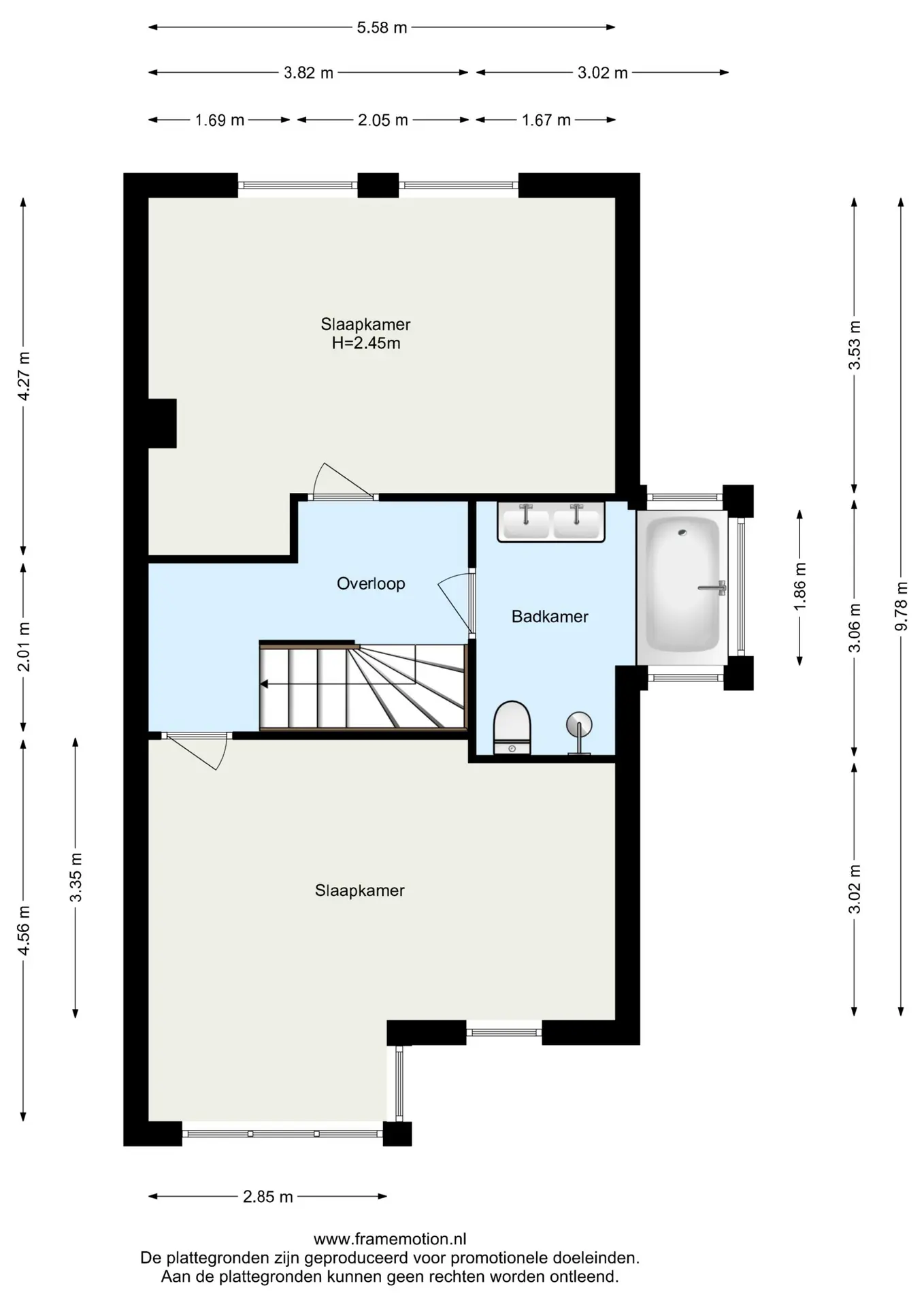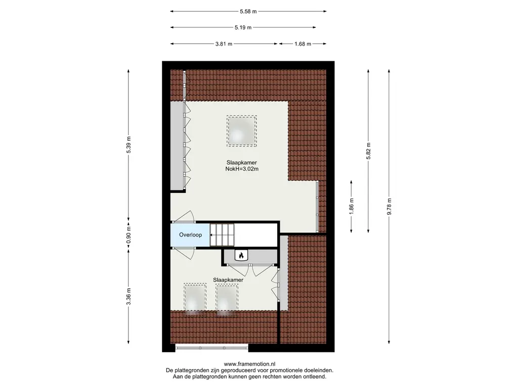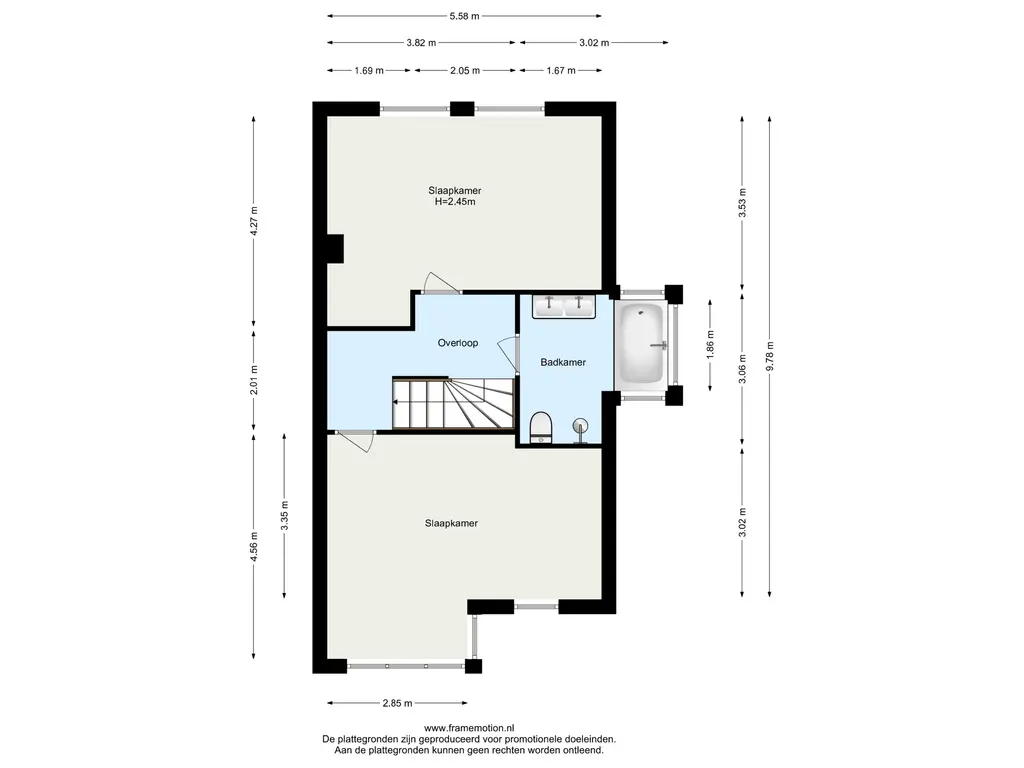 De overloop geeft toegang tot twee royale slaapkamers en de badkamer.