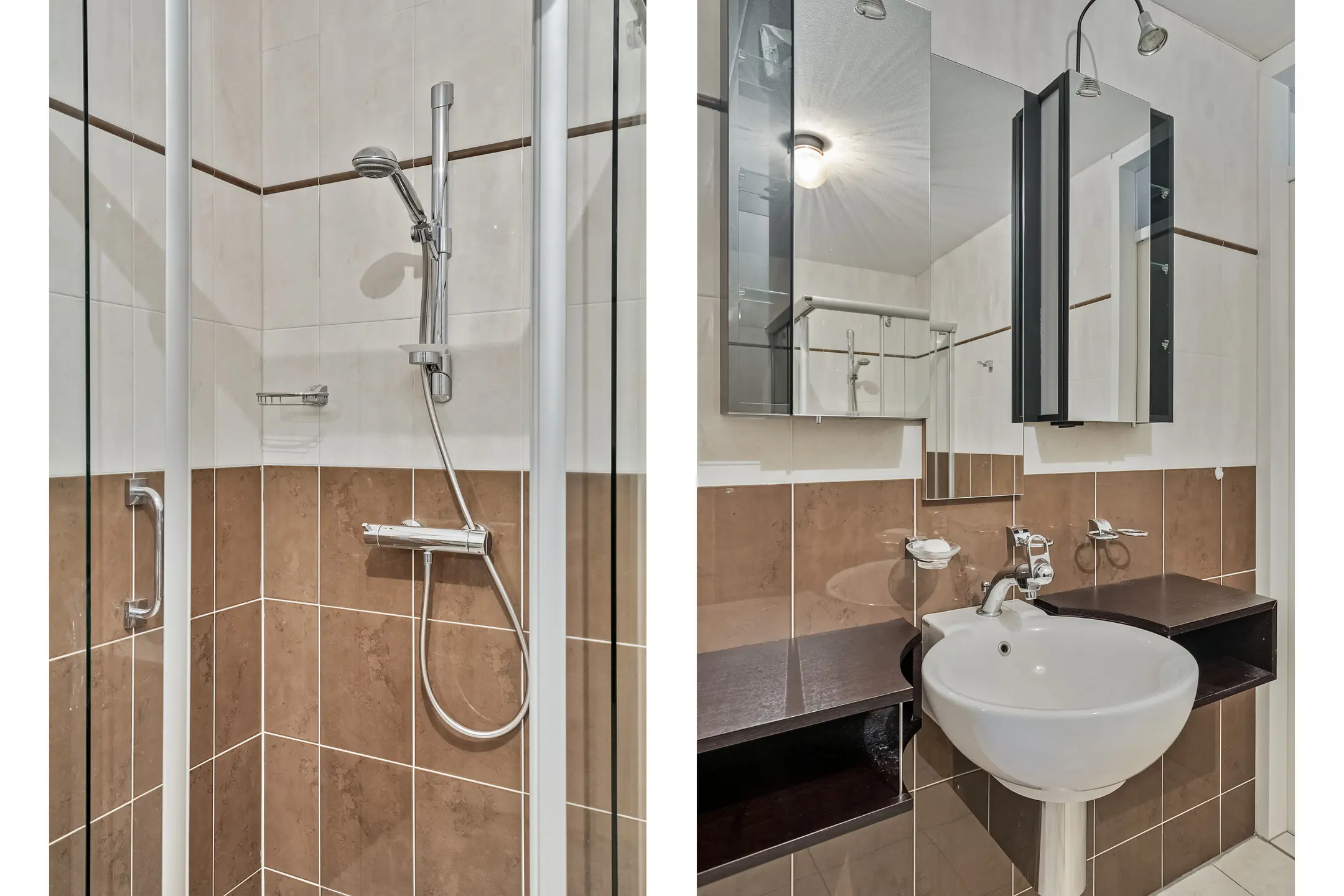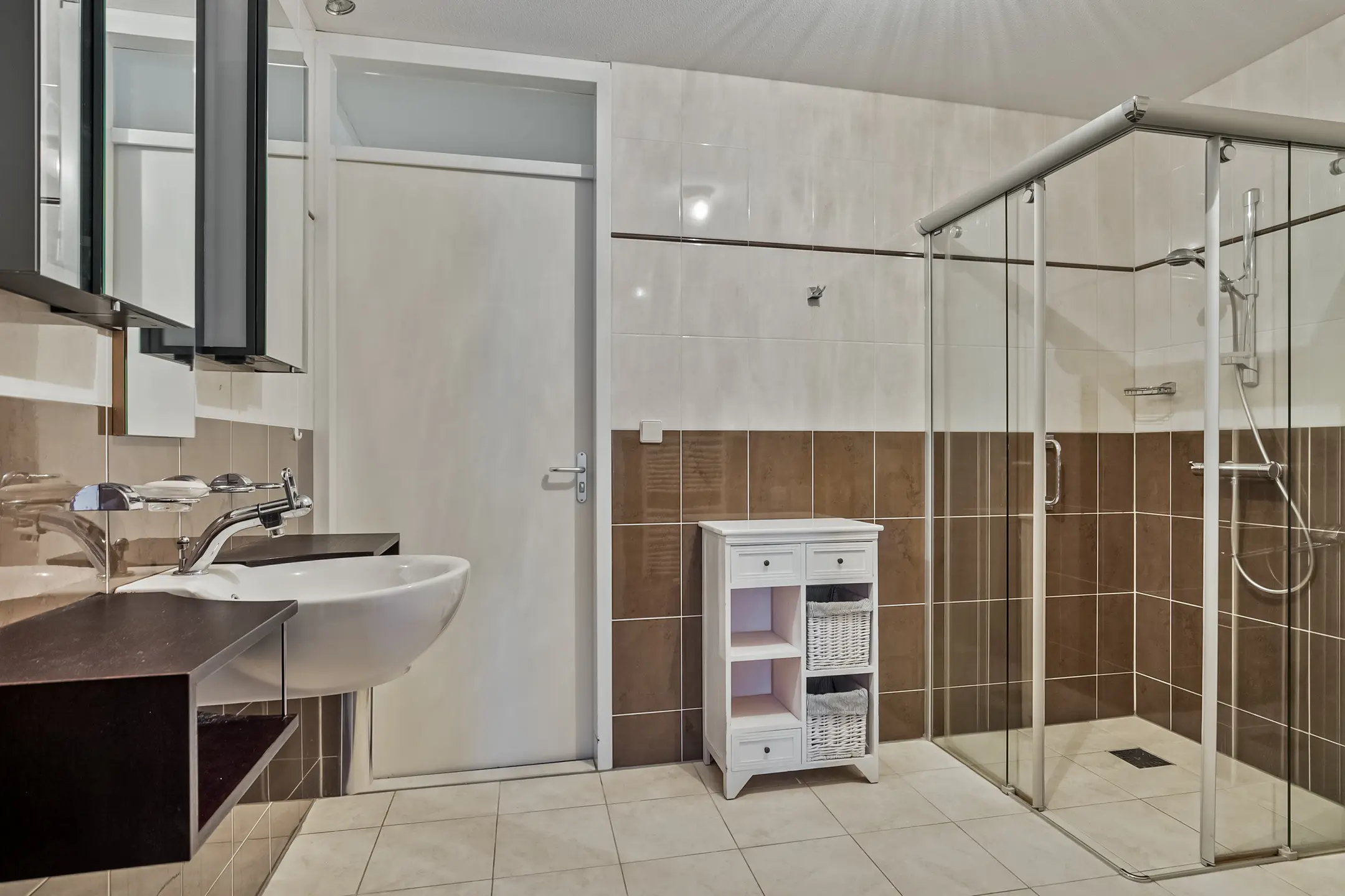 Badkamer (ca. 7 m2) met sanitaire voorzieningen zoals een wastafel, spiegel met spiegelkast, verlichting, hangend tweede toilet, inloopdouche en designradiator. De badkamer is geheel betegeld. De badkamer is toegankelijk via de hal en de slaapkamer 1.