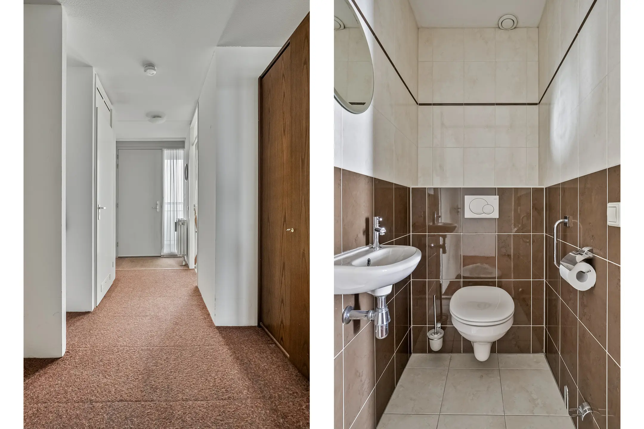 Toiletruimte voorzien van een hangend toilet en fonteintje. De toiletruimte is geheel betegeld in een lichte kleurstelling.
