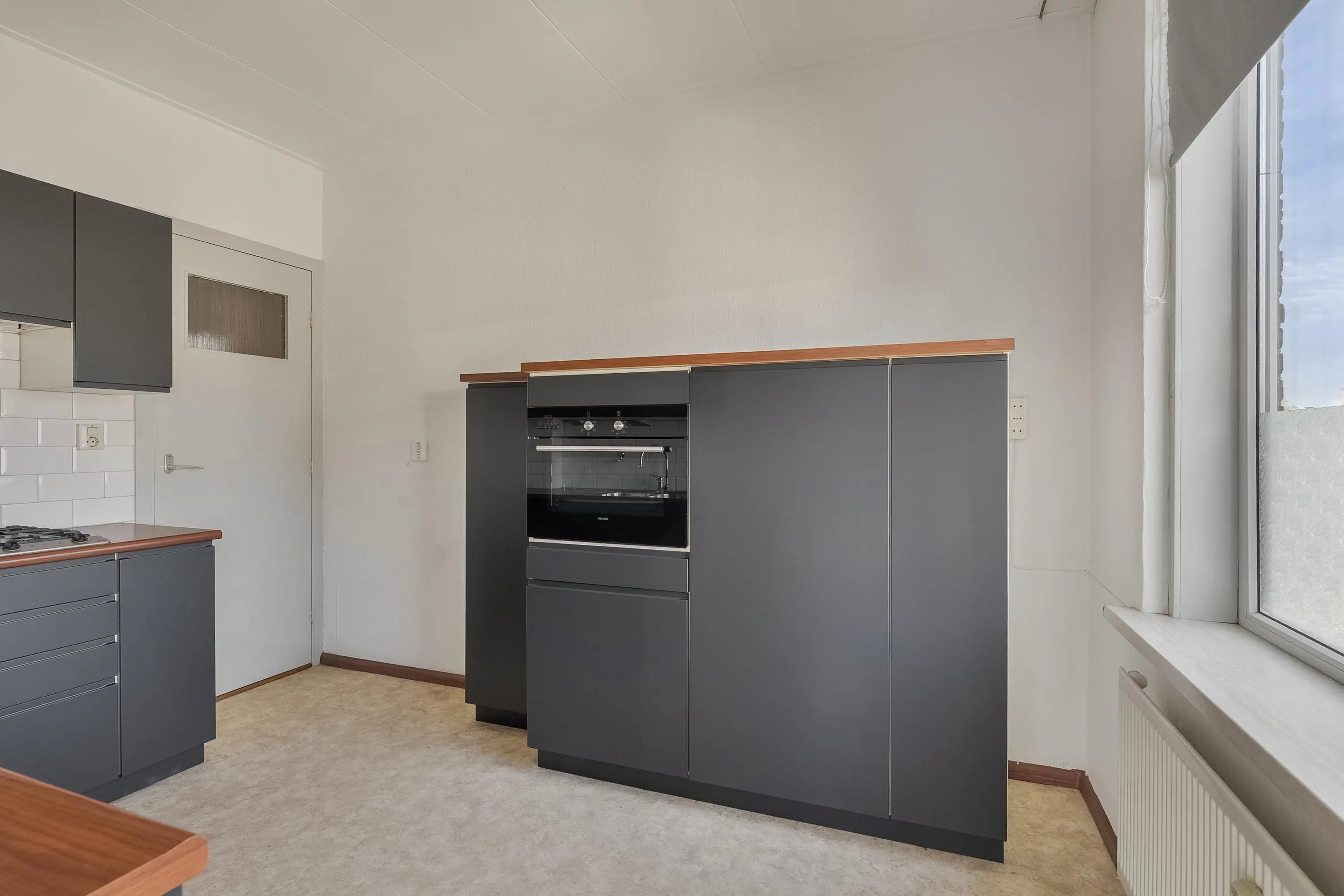 Aan de achterzijde loop je via de deur naar de keuken. Wow, een verrassing, een hele ruime, complete en moderne keuken. De keuken is gewrapt en is voorzien van flink wat bergruimte, een ingebouwde koelkast, oven, vaatwasmachine, gaskookplaat en dubbele spoelbak met mengkraan.