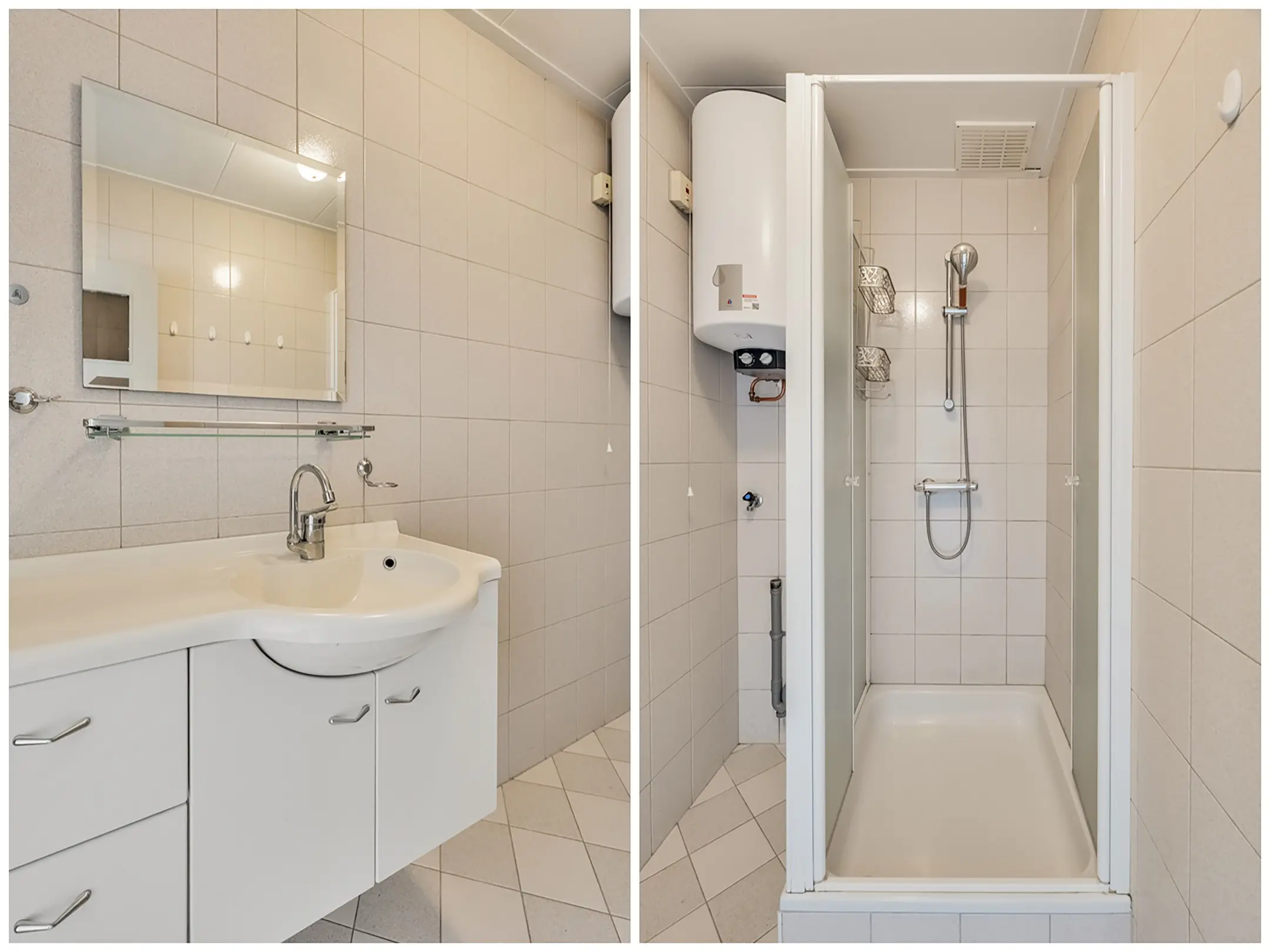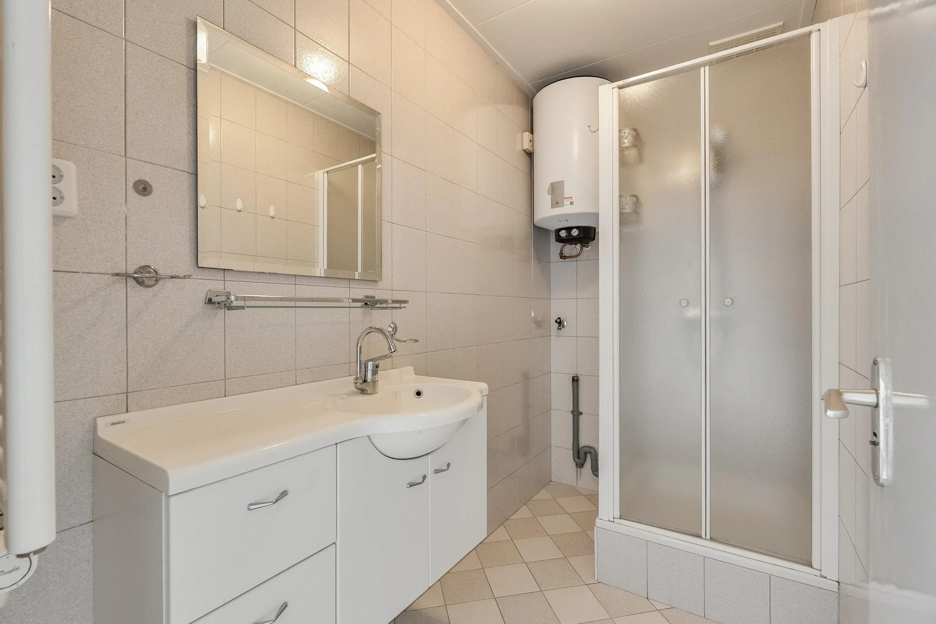 Tussen de slaapkamers bevindt zich de badkamer die is voorzien van een douche, wastafel met wastafelmeubel en de aansluiting voor de wasmachine.