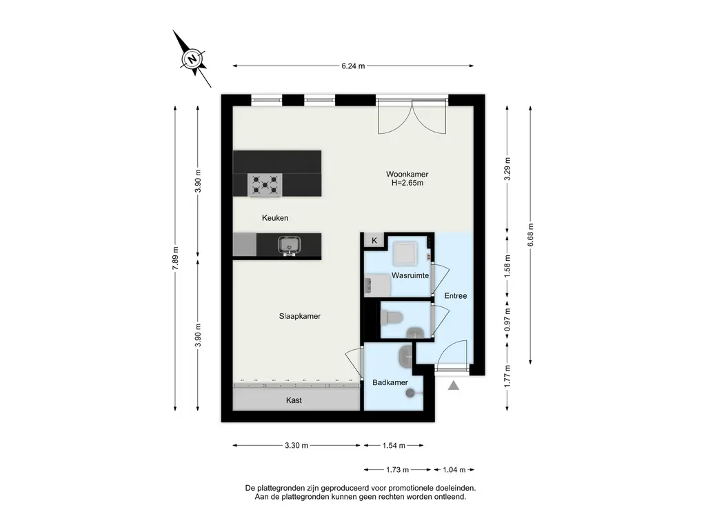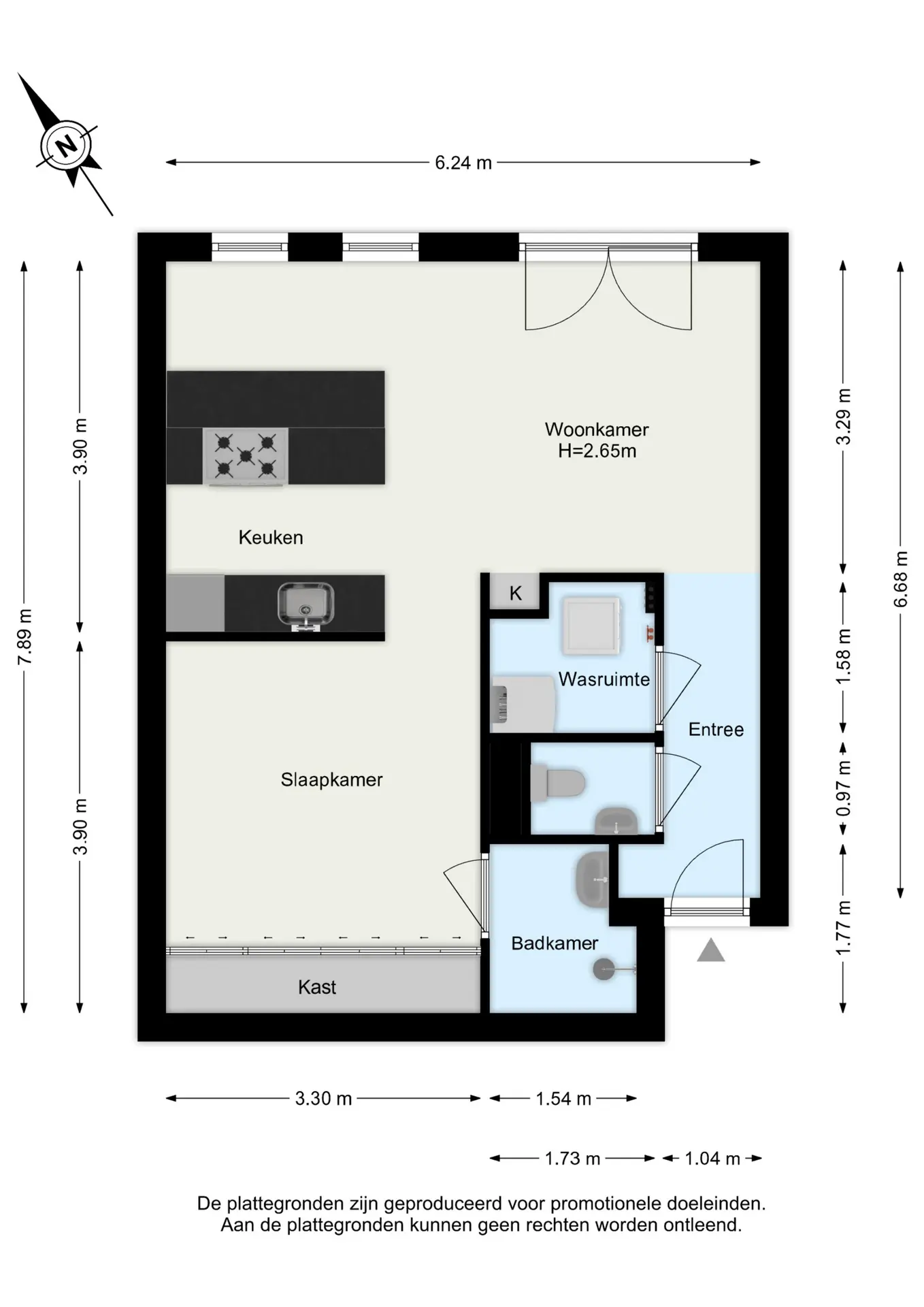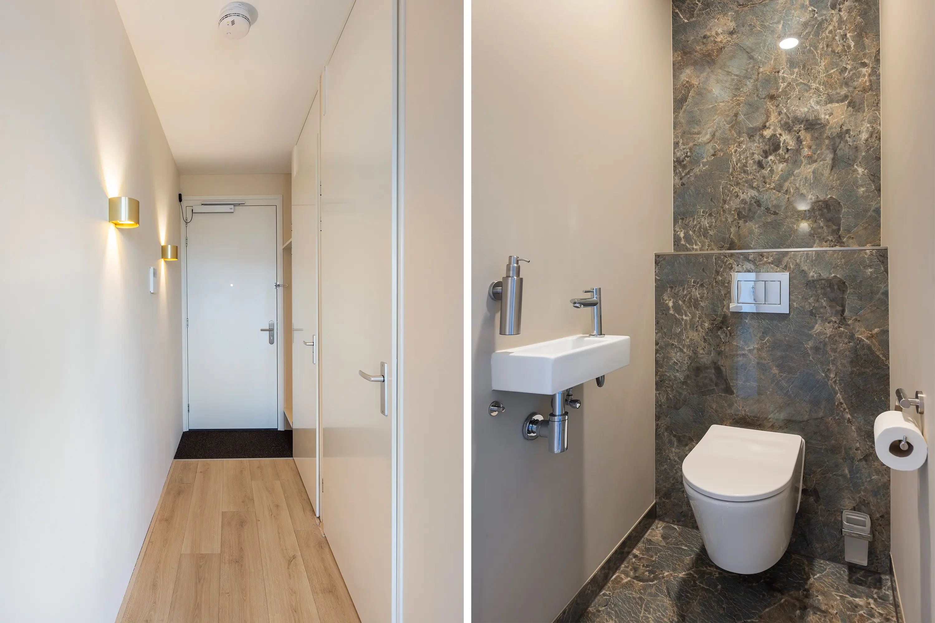 Bij binnenkomst kom je in de hal met toiletruimte en inpandige berging. De lichte woonkamer met open keuken vormt het hart van het appartement en biedt toegang tot het Franse balkon. De gehele woning, met uitzondering van badkamer en toilet, is voorzien van laminaat, wat zorgt voor een warme, strakke en onderhoudsvriendelijke uitstraling. De slaapkamer grenst direct aan de en-suite badkamer, die uitgerust is met een inloopdouche en wastafelmeubel, waardoor je hier een luxueuze en praktische privéruimte hebt.
