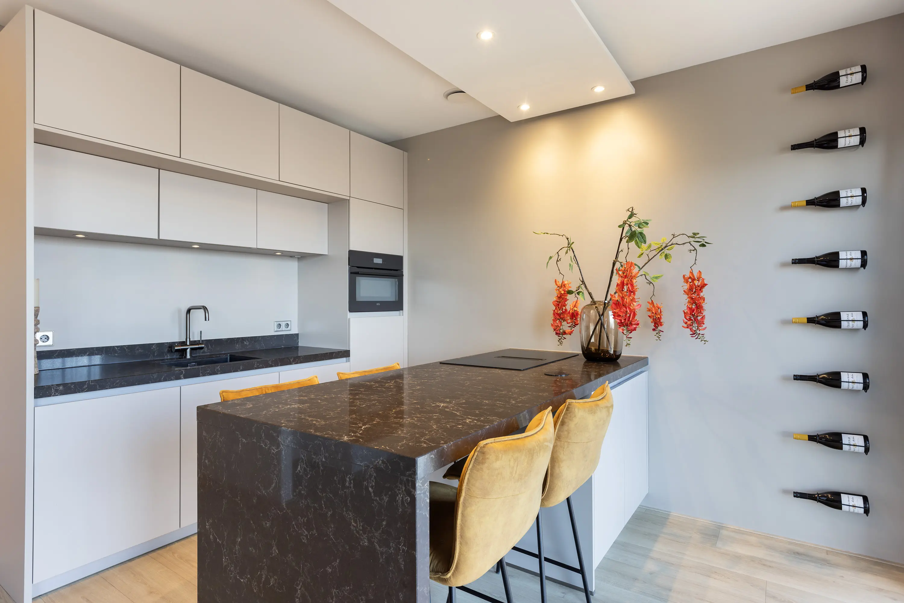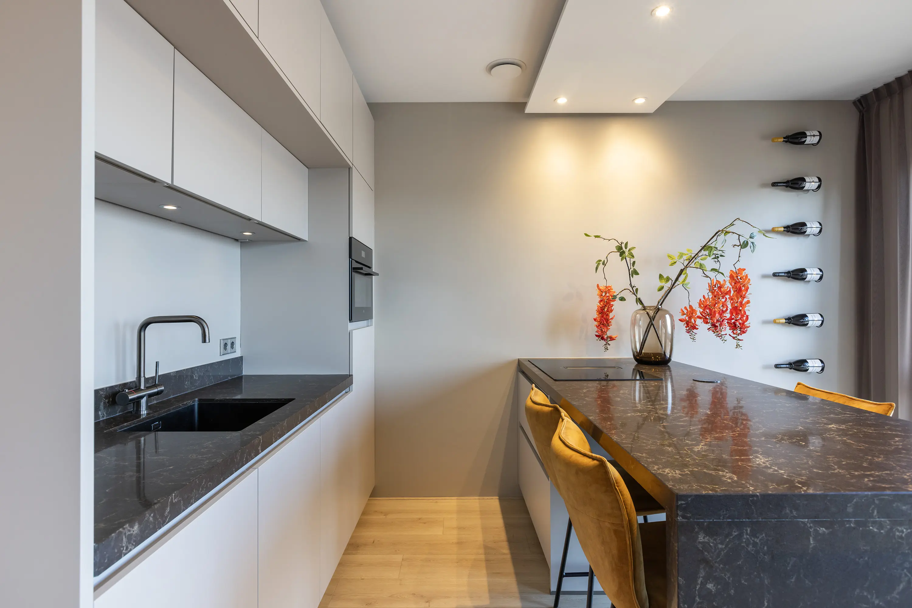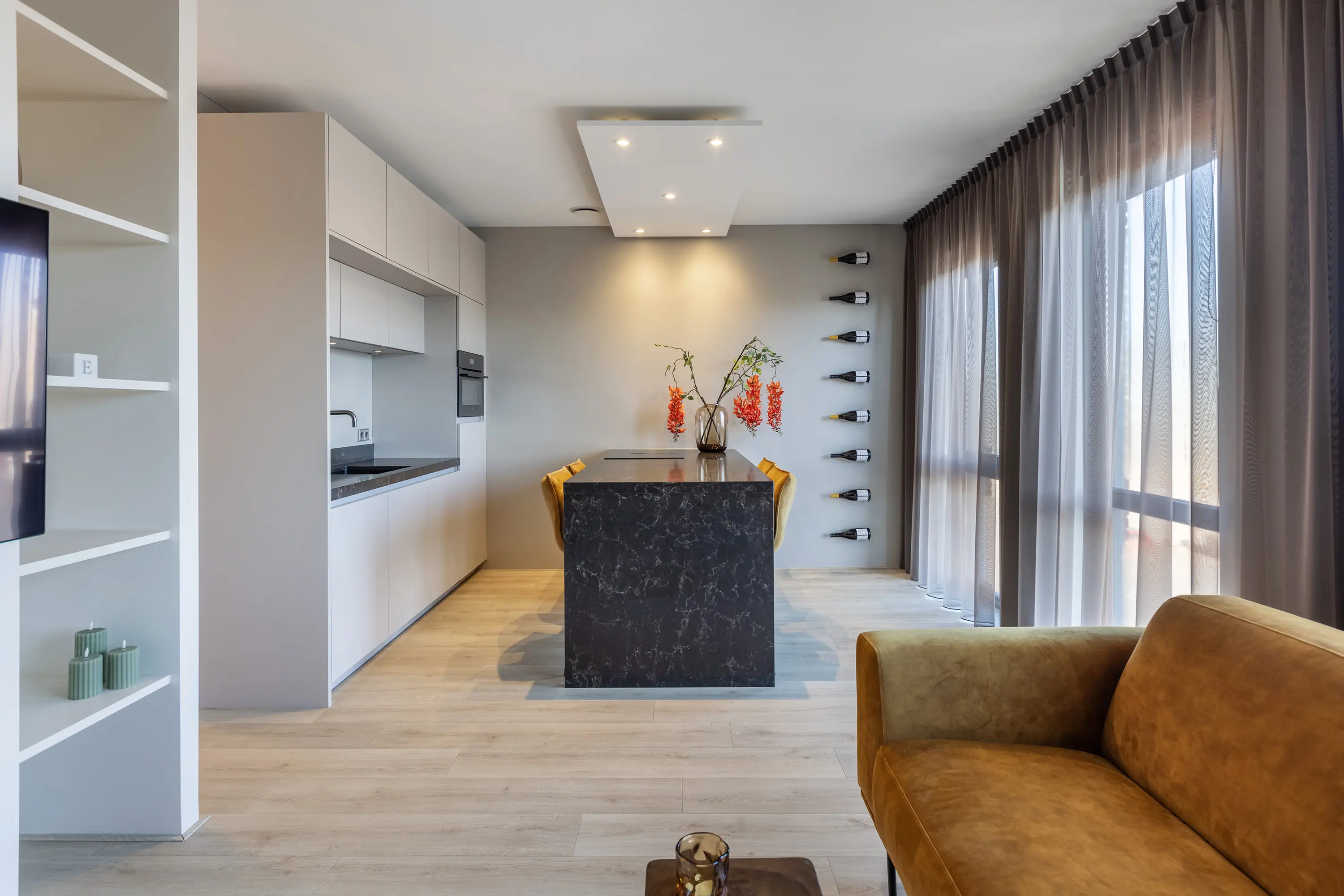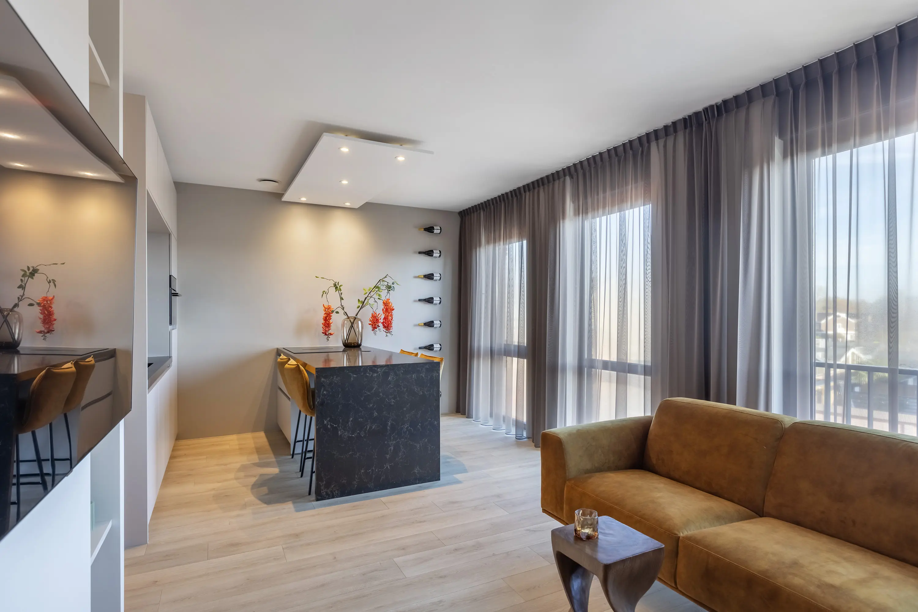 De woonkamer is royaal en licht dankzij de grote raampartijen en de openslaande deuren naar het Frans balkon. De gehele woning, met uitzondering van badkamer en toilet, is voorzien van een hoogwaardige laminaatvloer, wat een warme, strakke en samenhangende uitstraling geeft. De open keuken sluit naadloos aan op de living en is modern en luxe uitgevoerd, voorzien van inbouwapparatuur zoals een koelkast, combi-oven, inductiekookplaat met geïntegreerde afzuiging, vaatwasser en een kokendwaterkraan. Zo wordt koken een waar genot.
