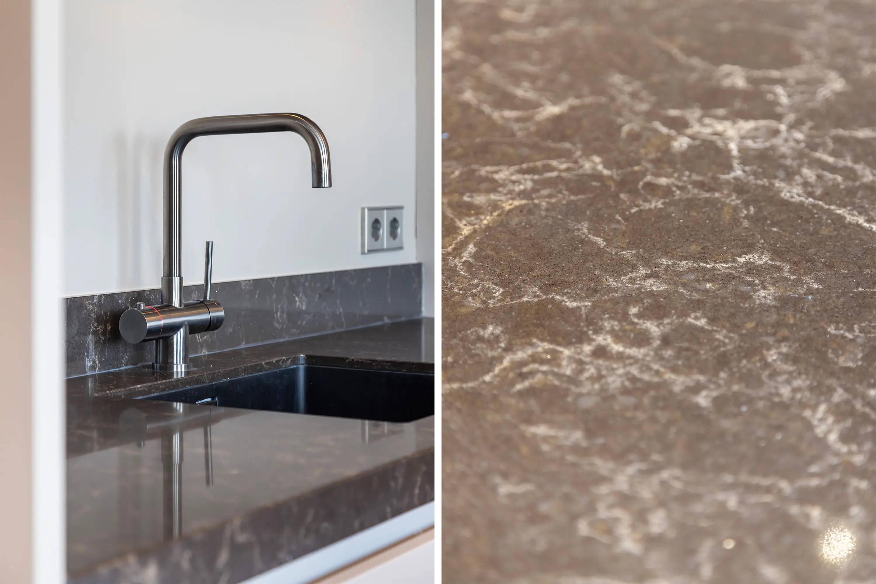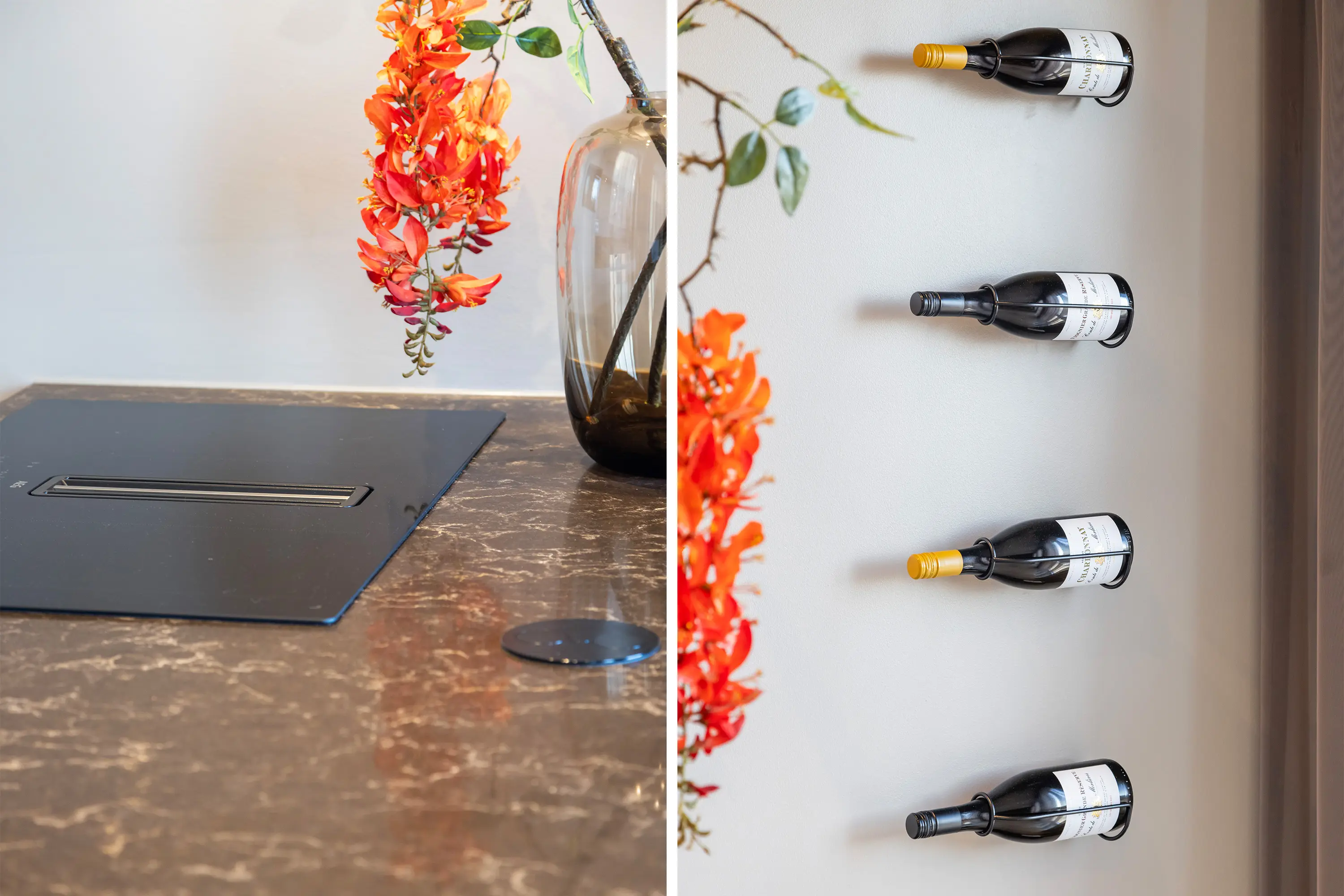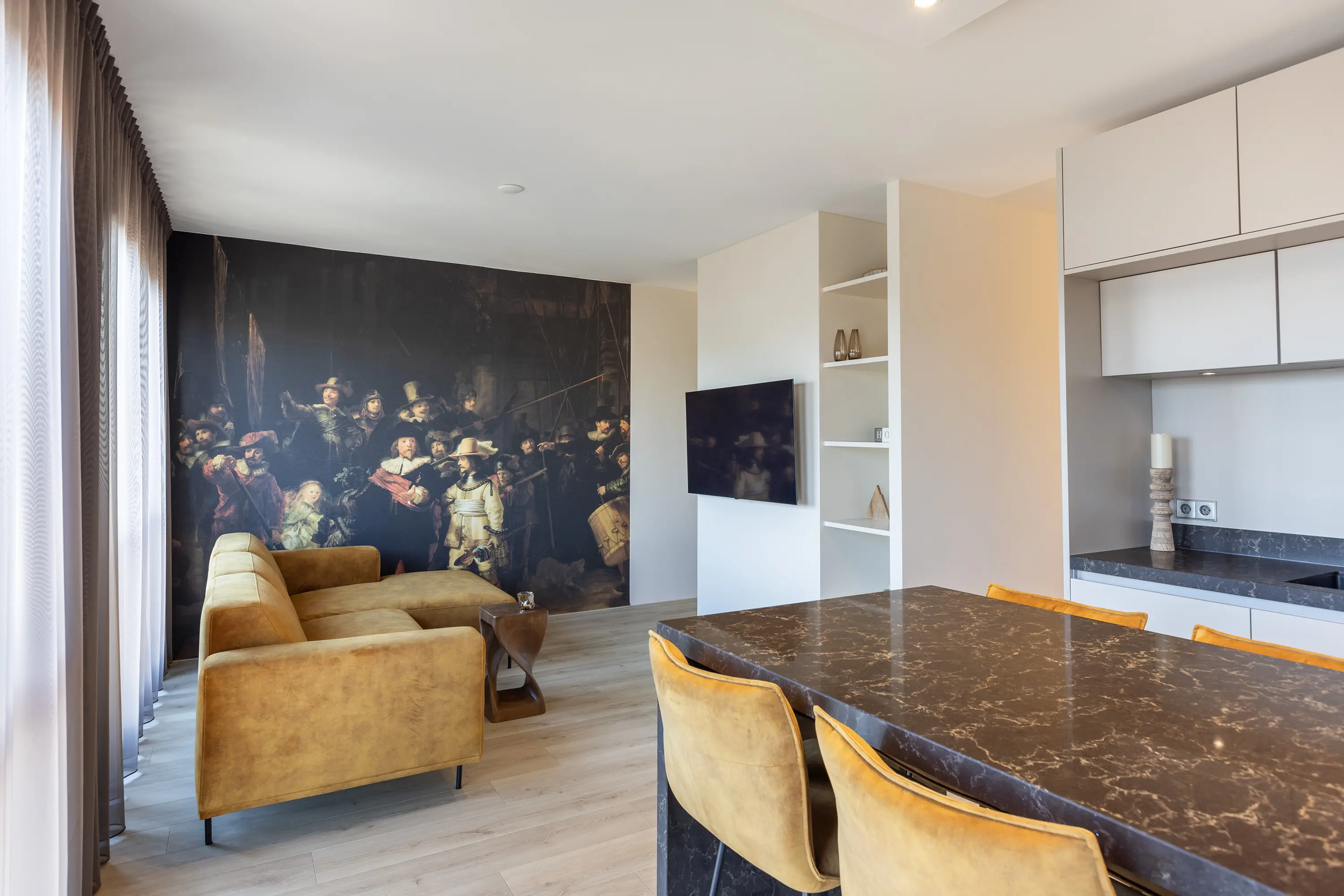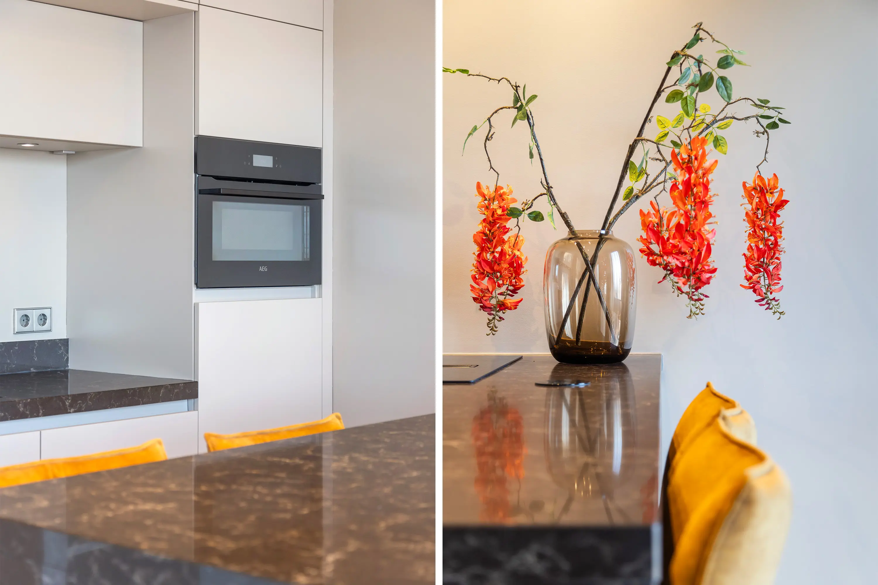 De woonkamer is royaal en licht dankzij de grote raampartijen en de openslaande deuren naar het Frans balkon. De gehele woning, met uitzondering van badkamer en toilet, is voorzien van een hoogwaardige laminaatvloer, wat een warme, strakke en samenhangende uitstraling geeft. De open keuken sluit naadloos aan op de living en is modern en luxe uitgevoerd, voorzien van inbouwapparatuur zoals een koelkast, combi-oven, inductiekookplaat met geïntegreerde afzuiging, vaatwasser en een kokendwaterkraan. Zo wordt koken een waar genot.
