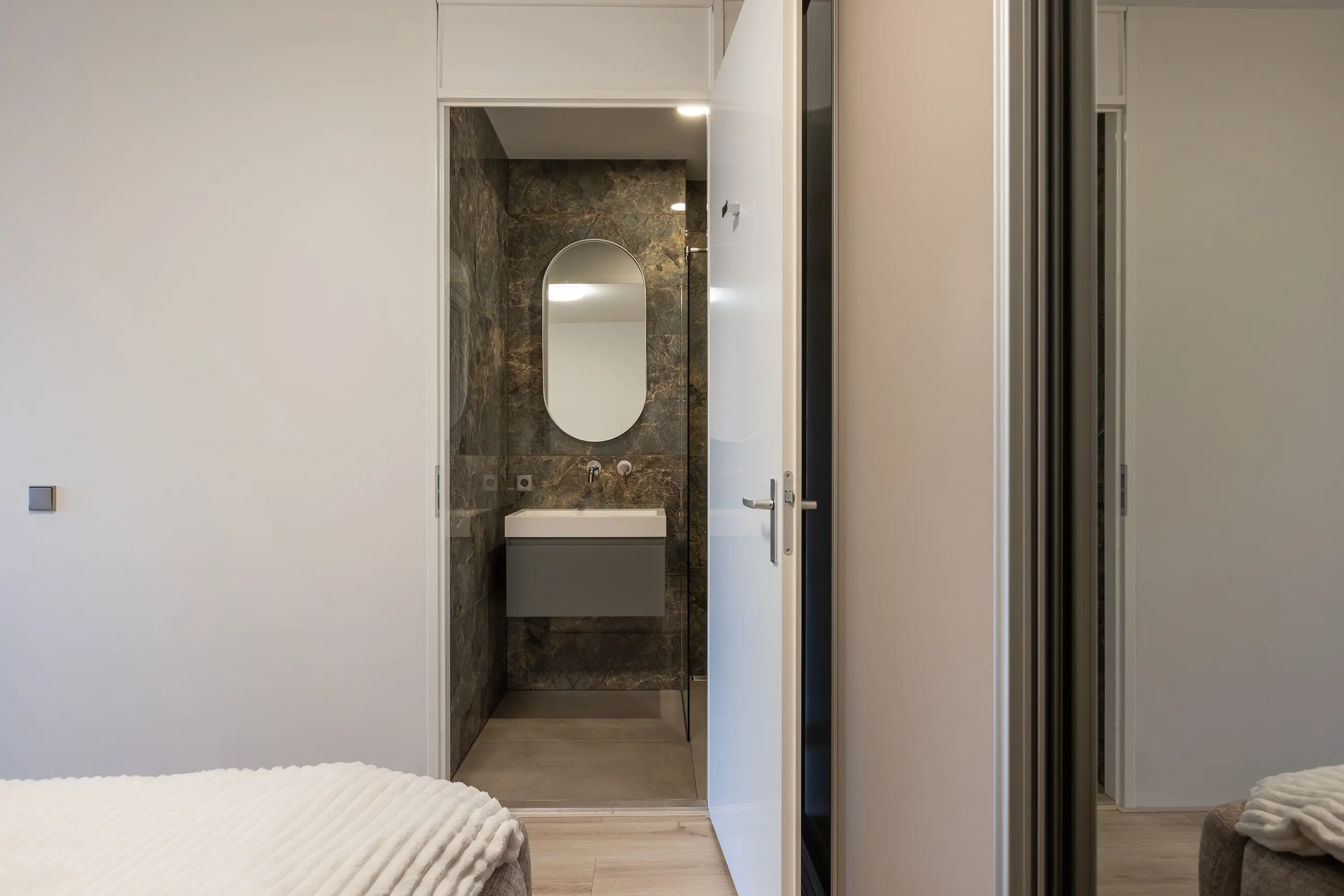 De slaapkamer is eveneens voorzien van laminaat en biedt voldoende ruimte voor een tweepersoonsbed en een kast. De en-suite badkamer is direct bereikbaar vanuit de slaapkamer en is fraai afgewerkt met een inloopdouche en een wastafelmeubel. Hierdoor ontstaat een privéruimte waar je heerlijk kunt ontspannen.