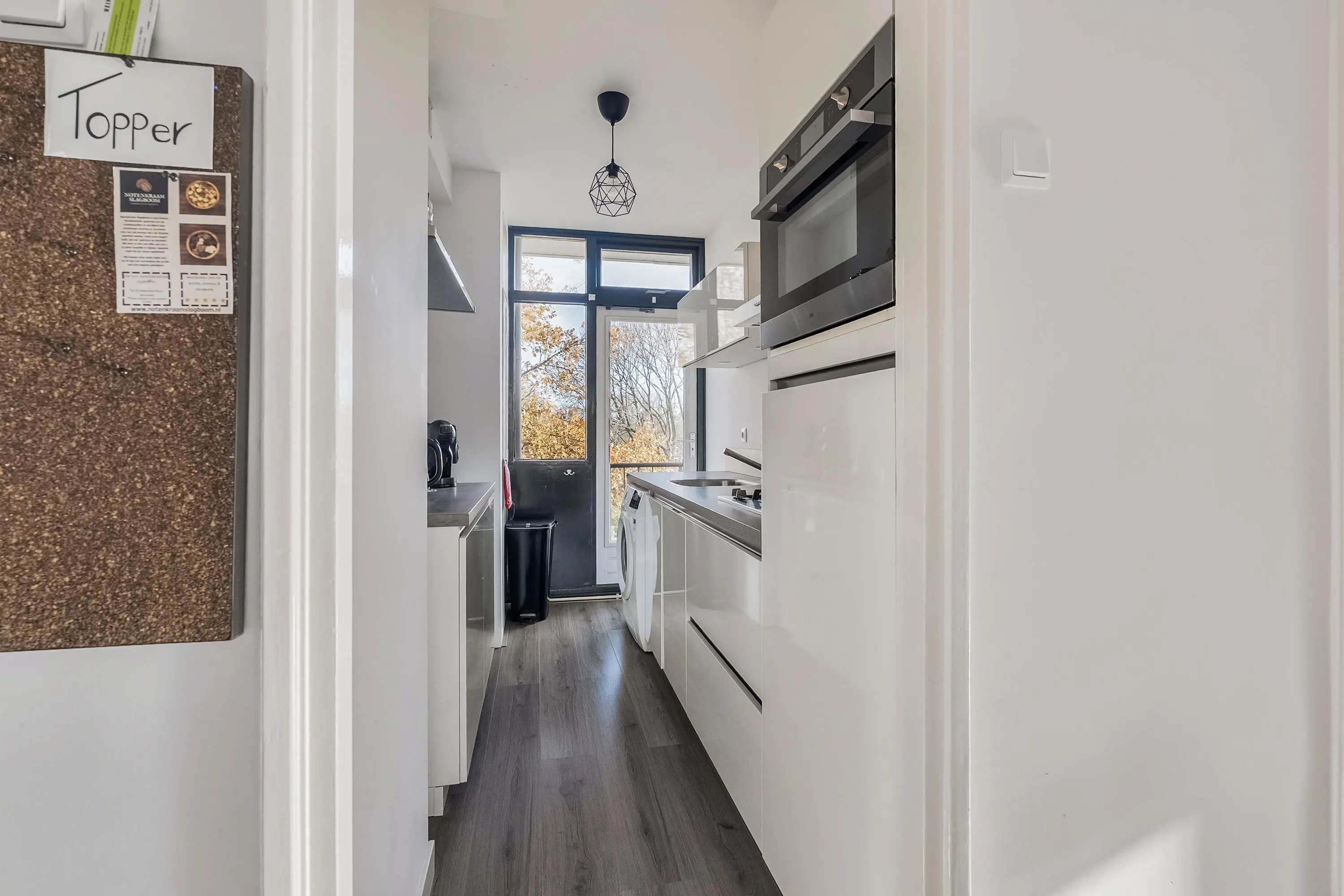 vaatwasser, koelkast, combi-oven, 4-pits gaskookplaat en RVS afzuigkap. Hier bevindt zich ook de wasmachine-aansluiting en de CV-installatie, netjes weggewerkt in een kast. Vanuit de keuken stap je direct het balkon op (oosten) – perfect voor je ochtendkoffie in de zon!