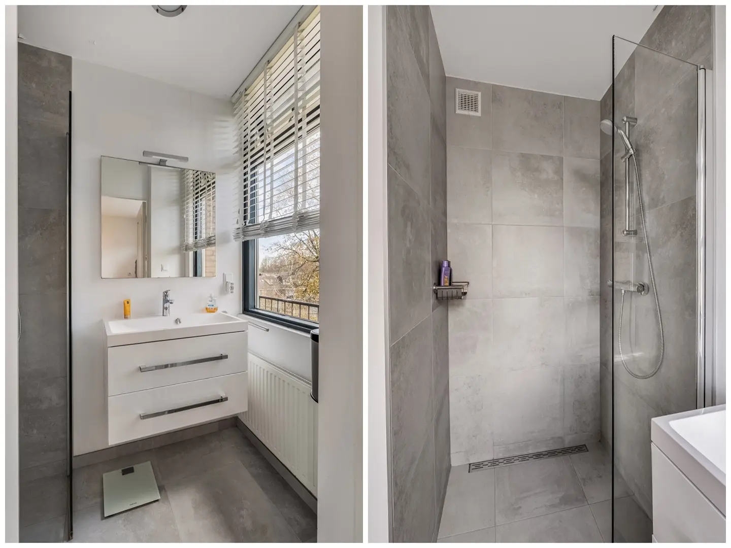 Compleet betegeld in moderne, grijze tinten. Voorzien van een ruime inloopdouche, wastafelmeubel en spiegel met verlichting.