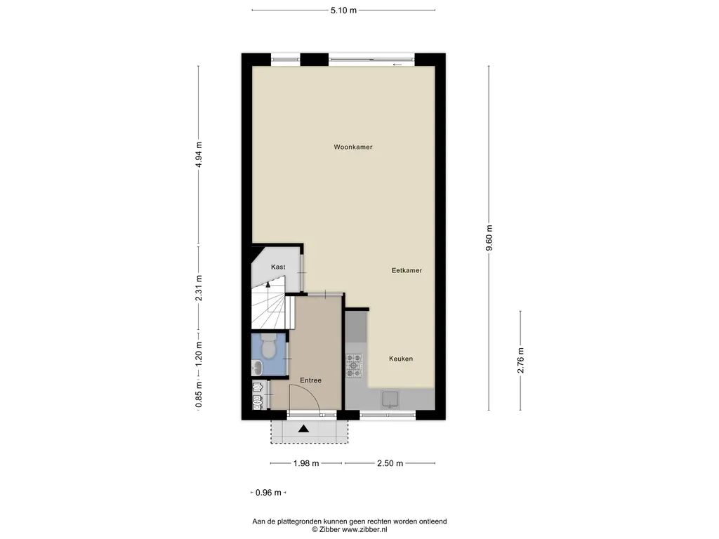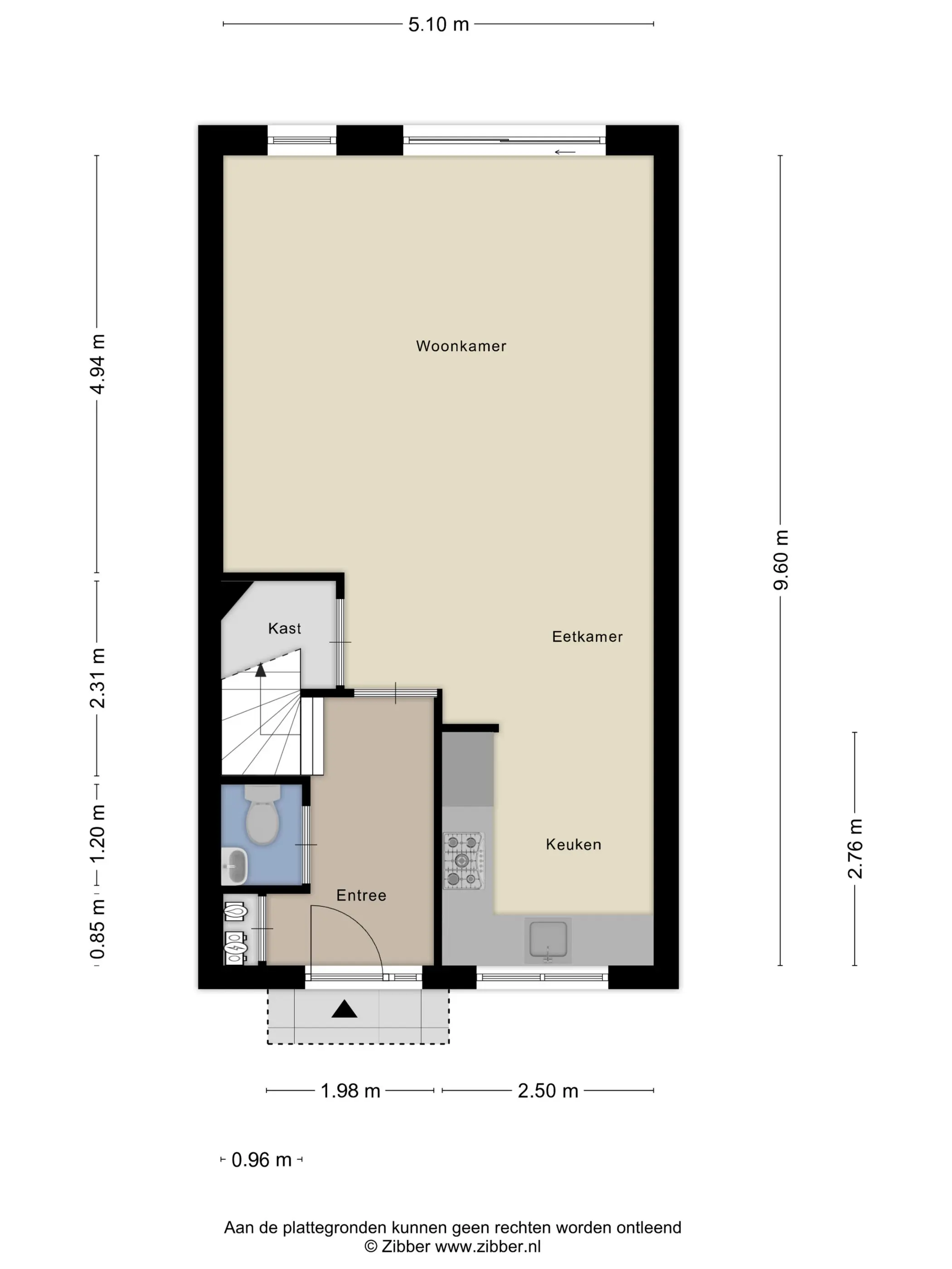 Je parkeert de auto voor de deur en loopt via de keurig aangelegde voortuin naar je eigen voordeur. Achter de voordeur stap je de hal binnen, waar je de meterkast en het toilet vindt, evenals de trap naar boven. Maar we lopen eerst de woonkamer in.